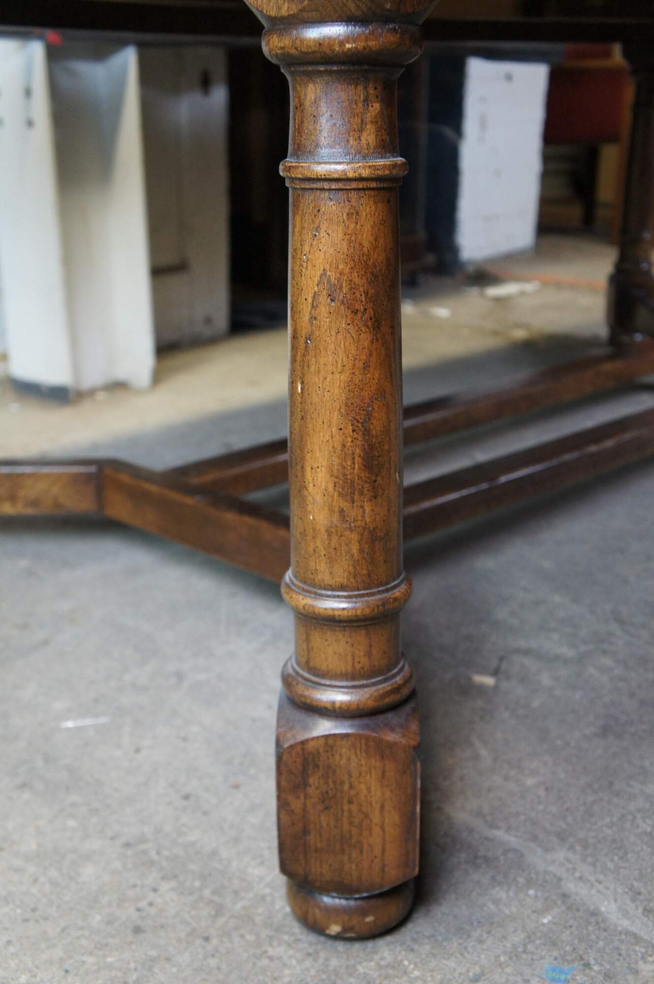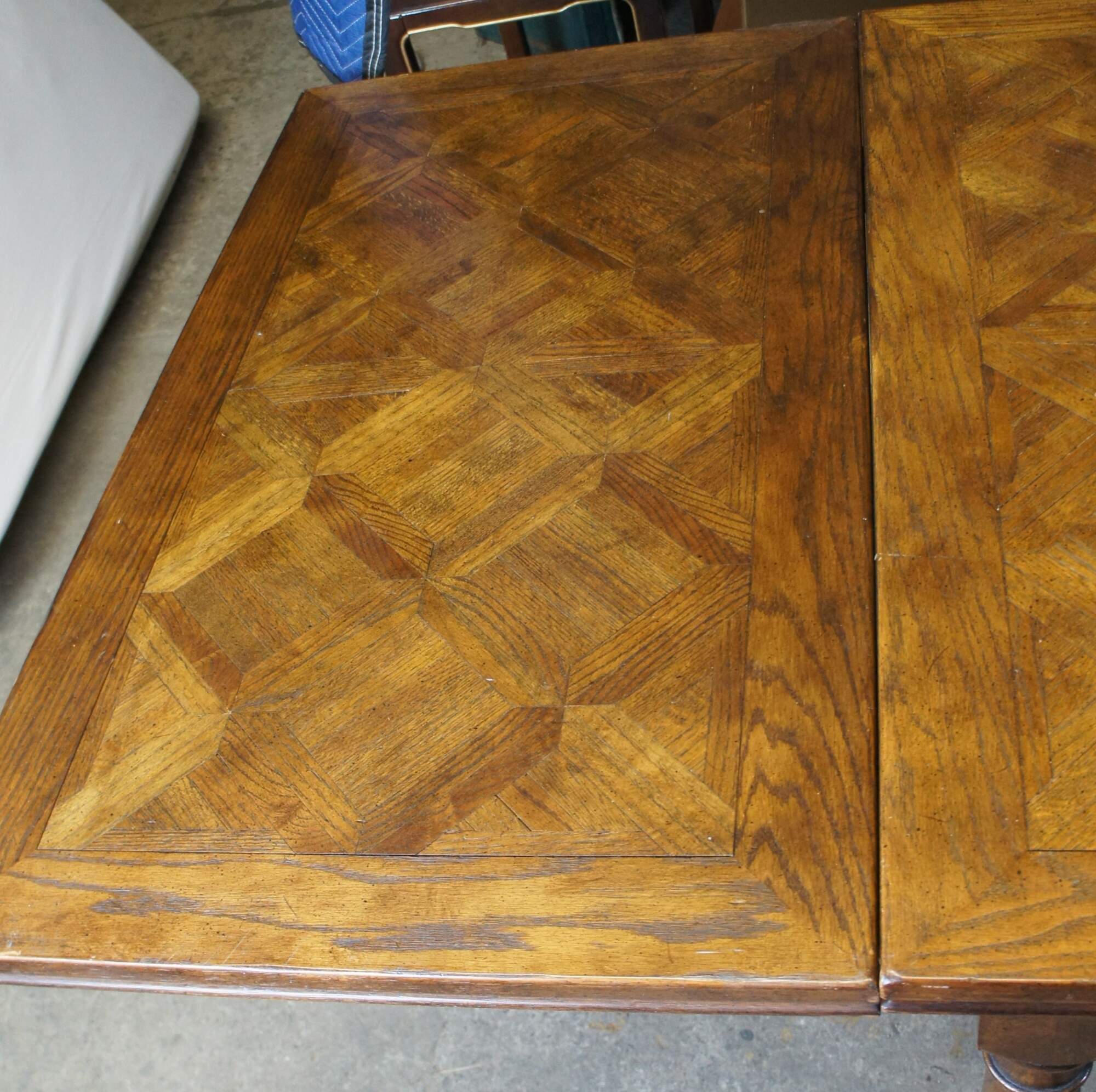 Monumental Vintage English 17th Century Style / William & Mary style refectory farmhouse dining table, circa 1960s. Features a rectangular form made from oak with a beautiful parquetry top over turned legs with blocked bun feet connected by a trestle base. The table extends via a draw leaf style mechanish allowing for placement of two large leaves and extension to 11 feet. Great for use in a large dining setting or as an office conference room table. The tables large stature and length makes it unparalleled to other examples.