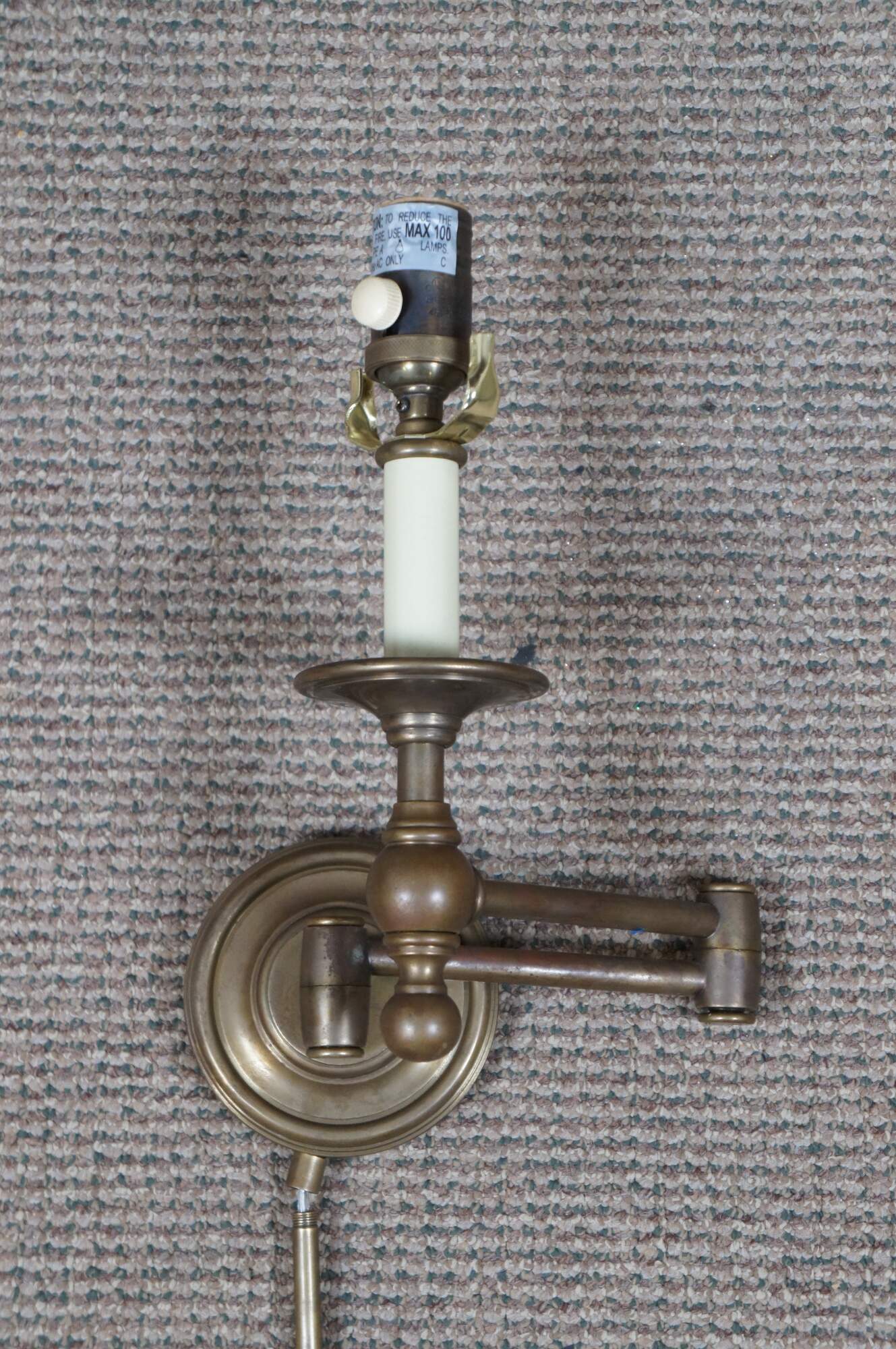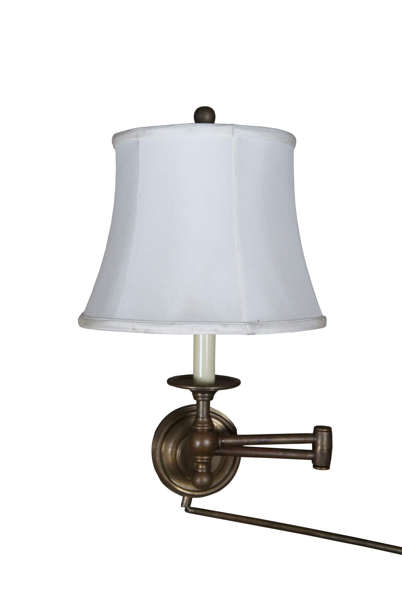 Visual Comfort & Company brass swing arm faux candlestick style wall sconces light, with antique brass finish and matching cord cover.