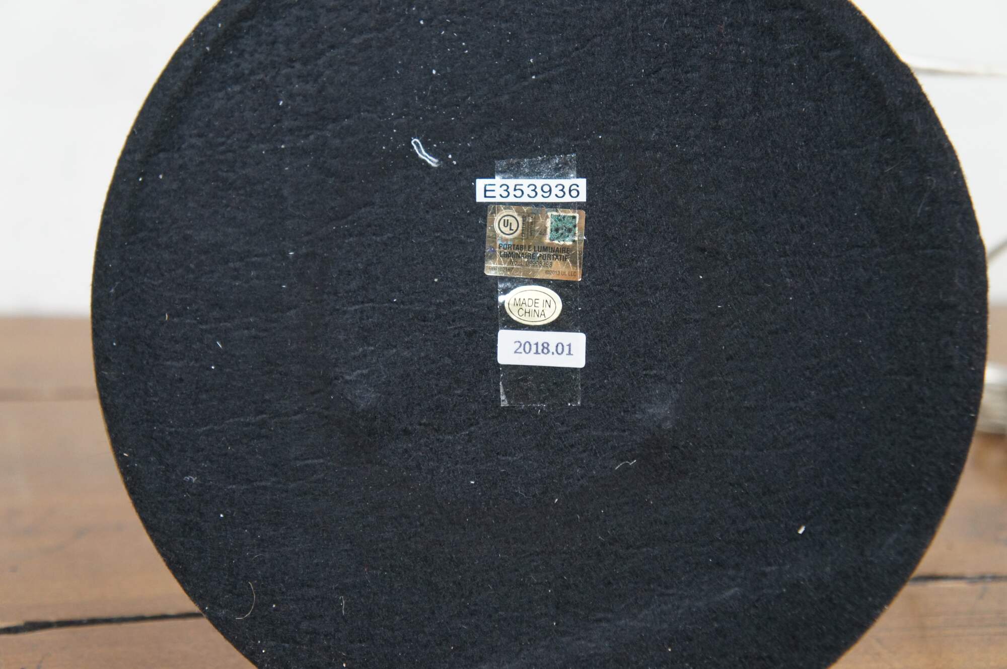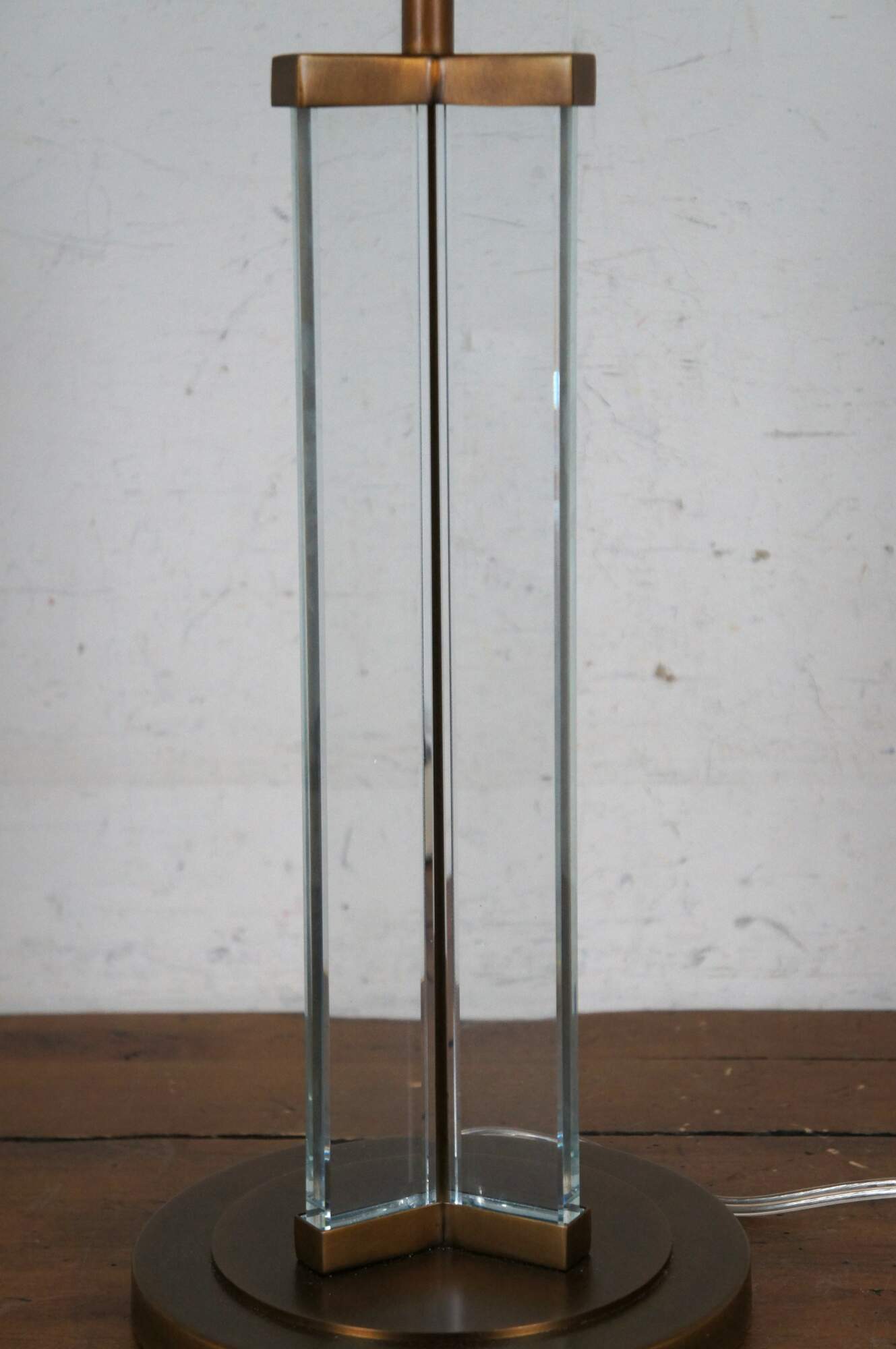 Late 20th century Robert Abbey table lamp featuring a round antiqued brass base supporting a geometric tri / star / Y shaped beveled glass column. Includes harp and cylindrical finial.
