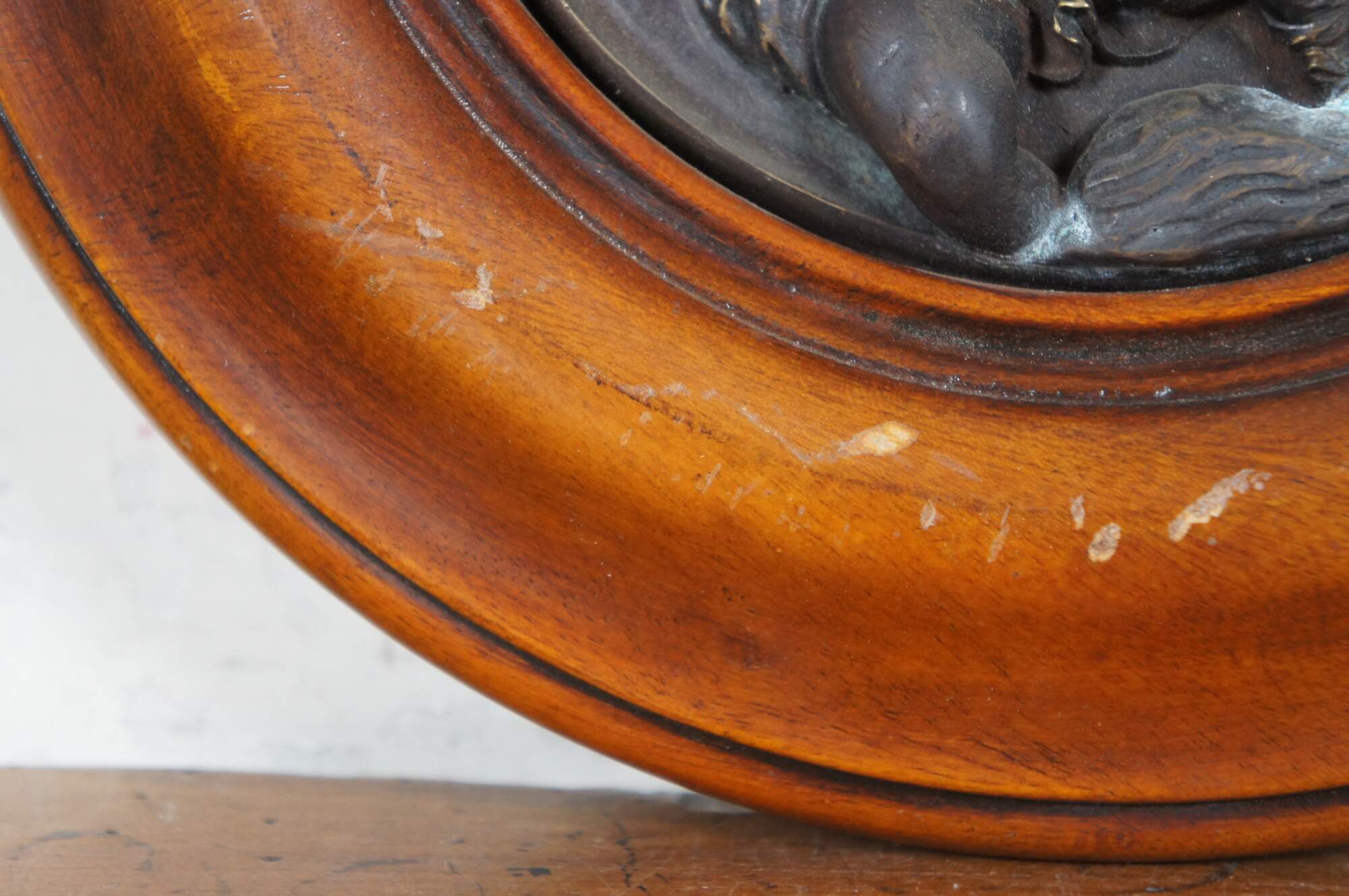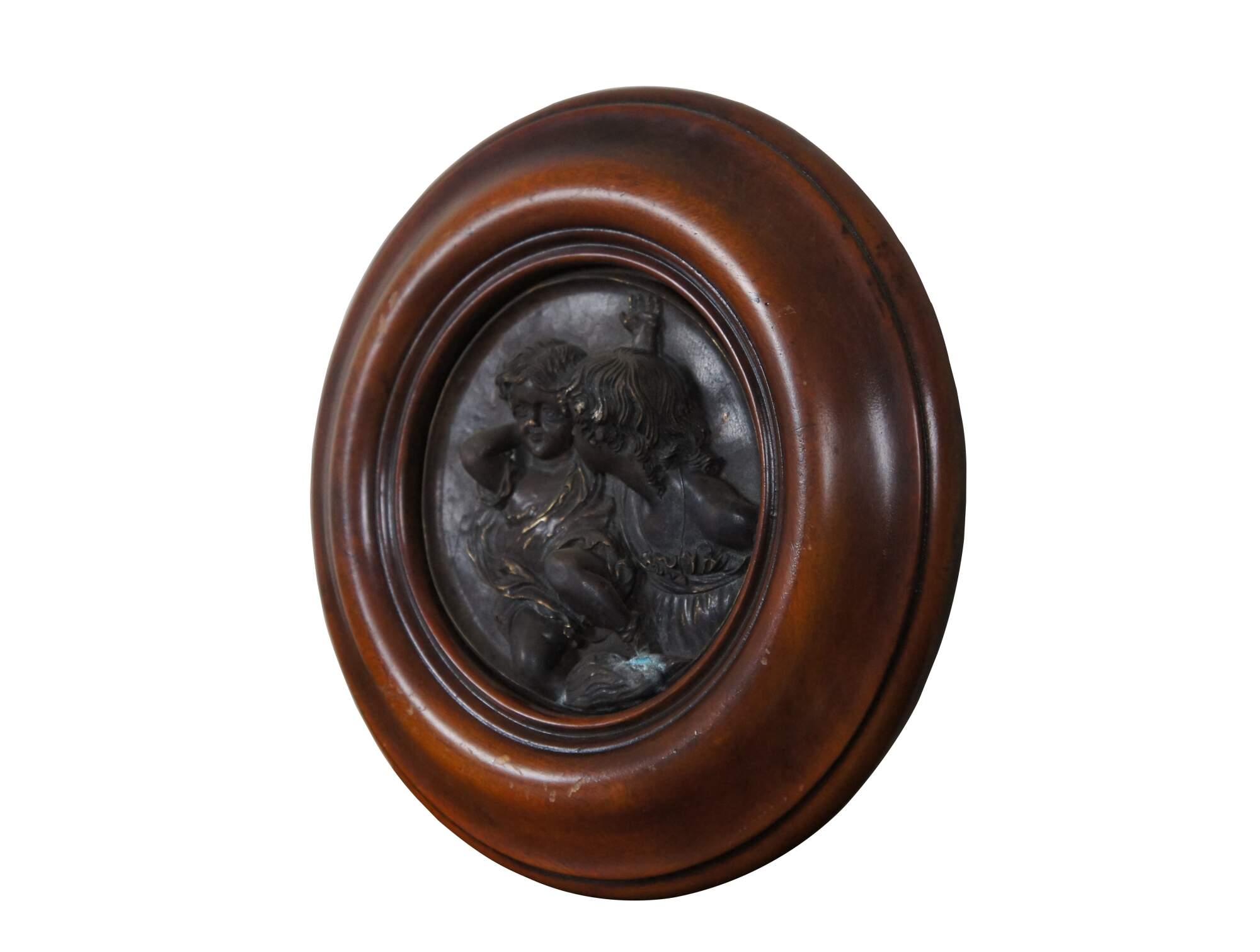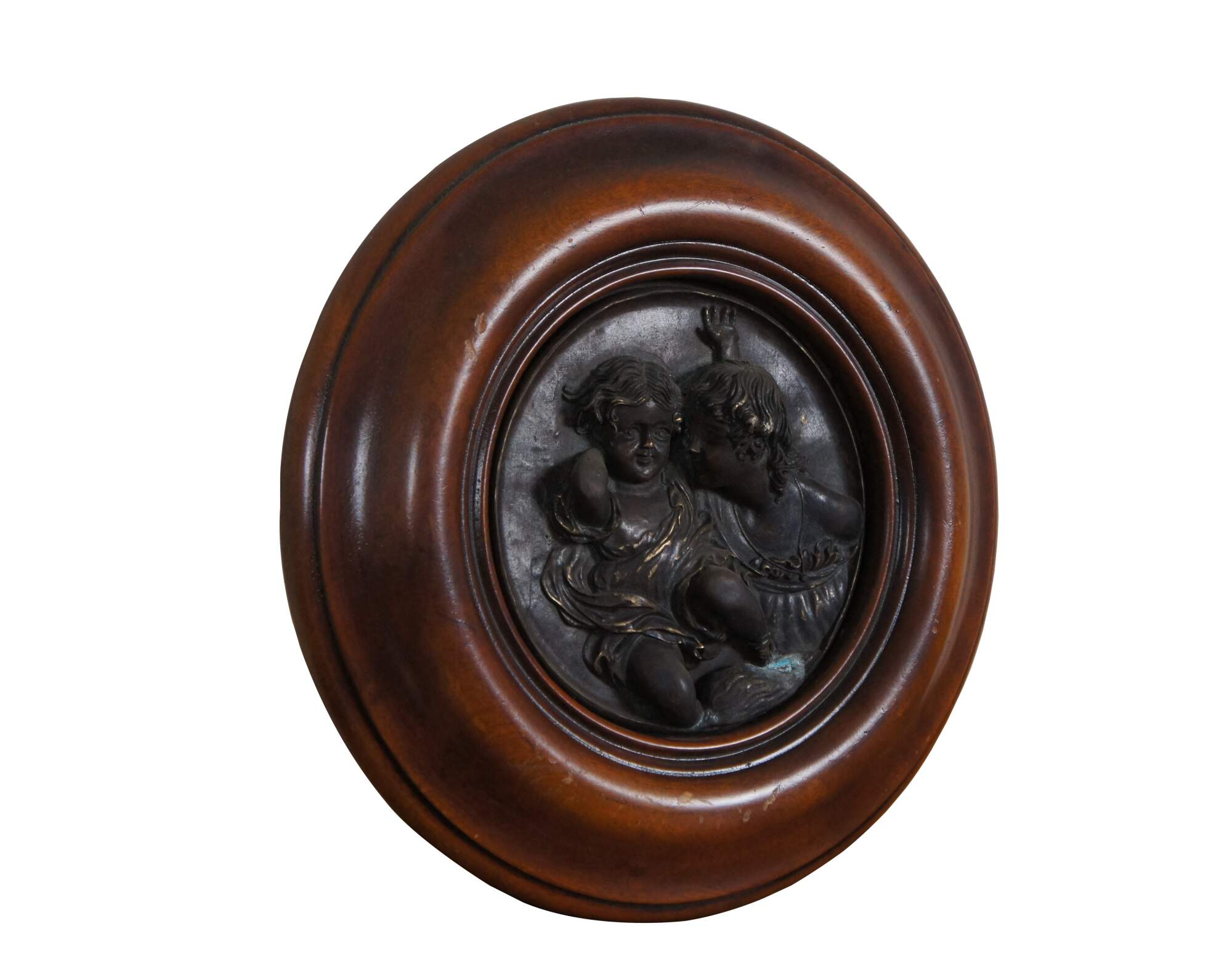 Vintage Theodore Alexander wall hanging plaque framed in walnut around a bas relief in bronze of "The Calmady Children," by Edward William Wyon - after the painting by Sir Thomas Lawrence.
