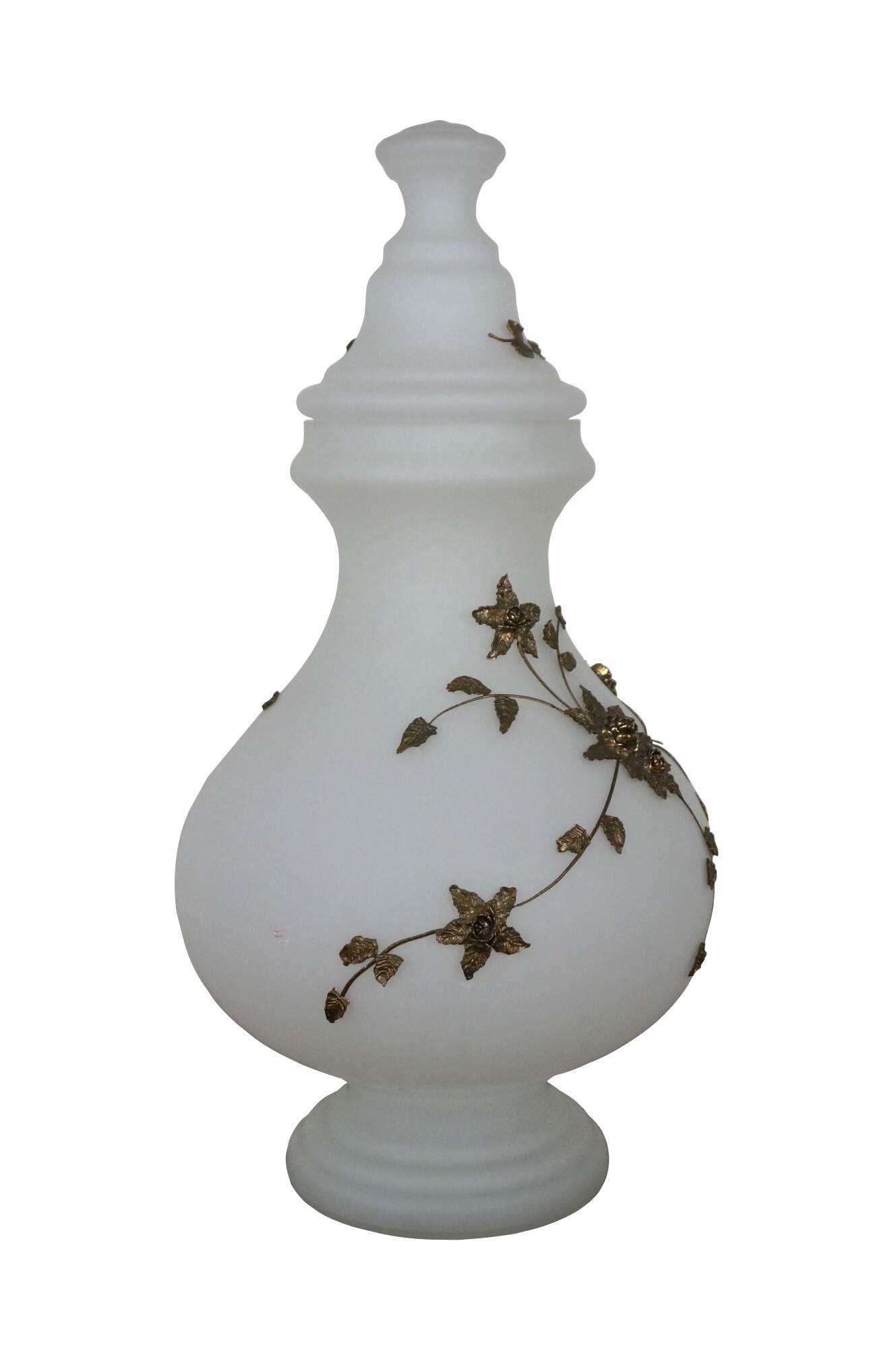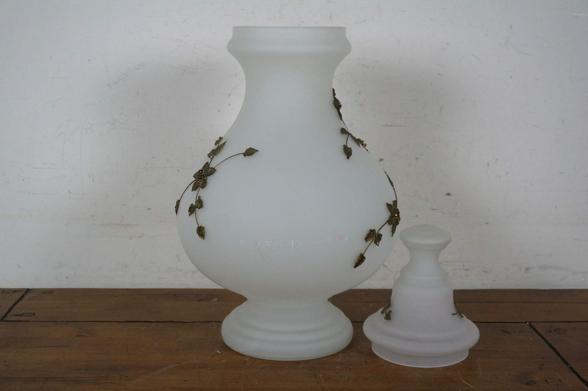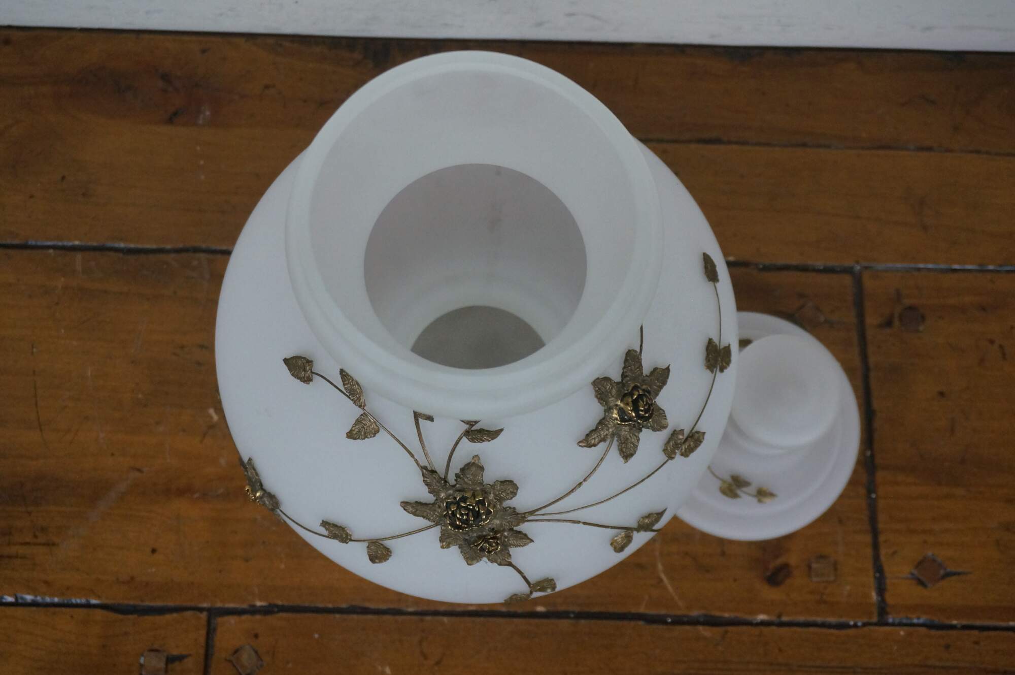 Mid 20th century Carl Falkenstein / Hollywood Regency style lidded urn / jar, made of white frosted glass with a design of applied bronze flowers and leaves.