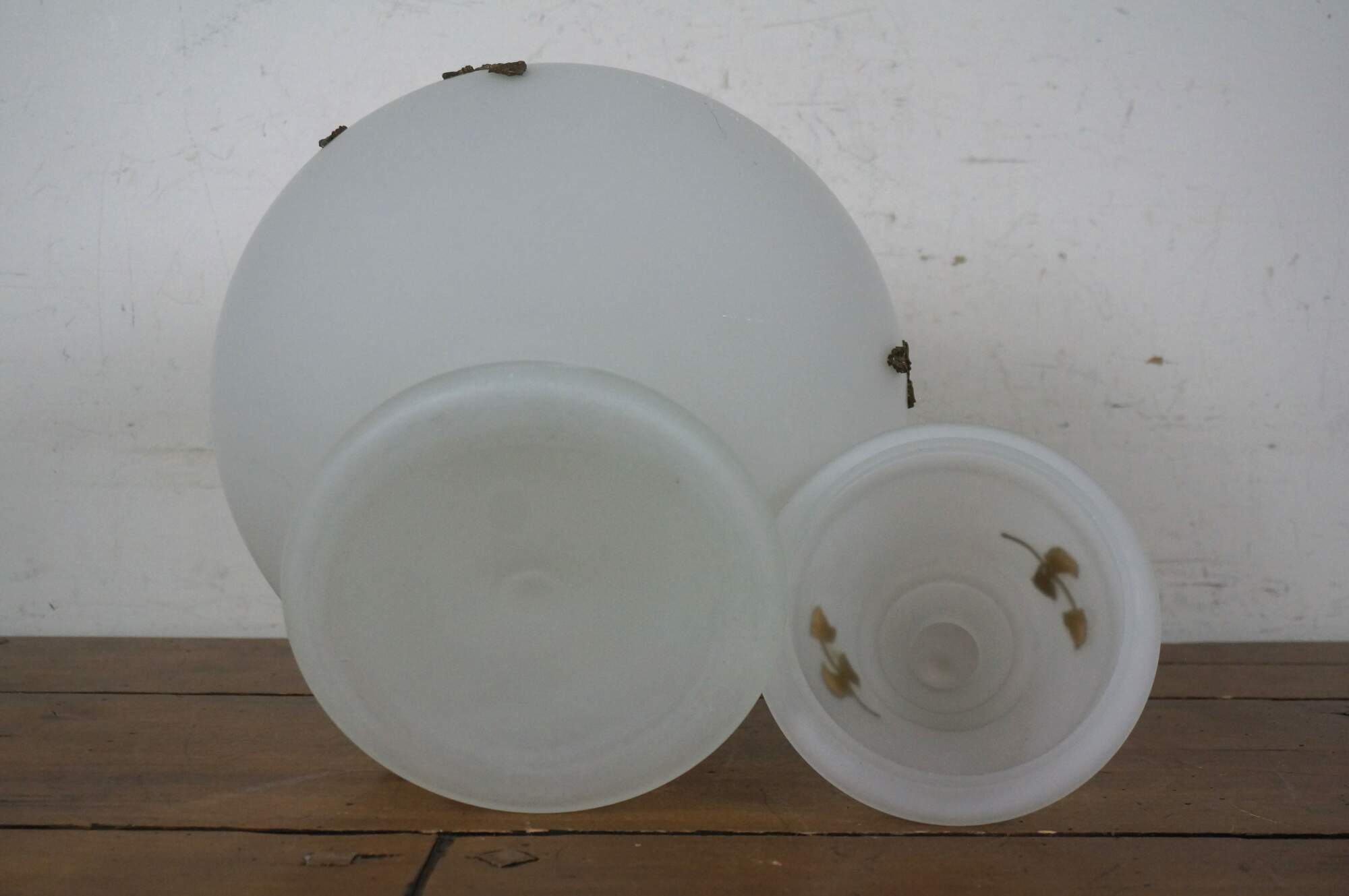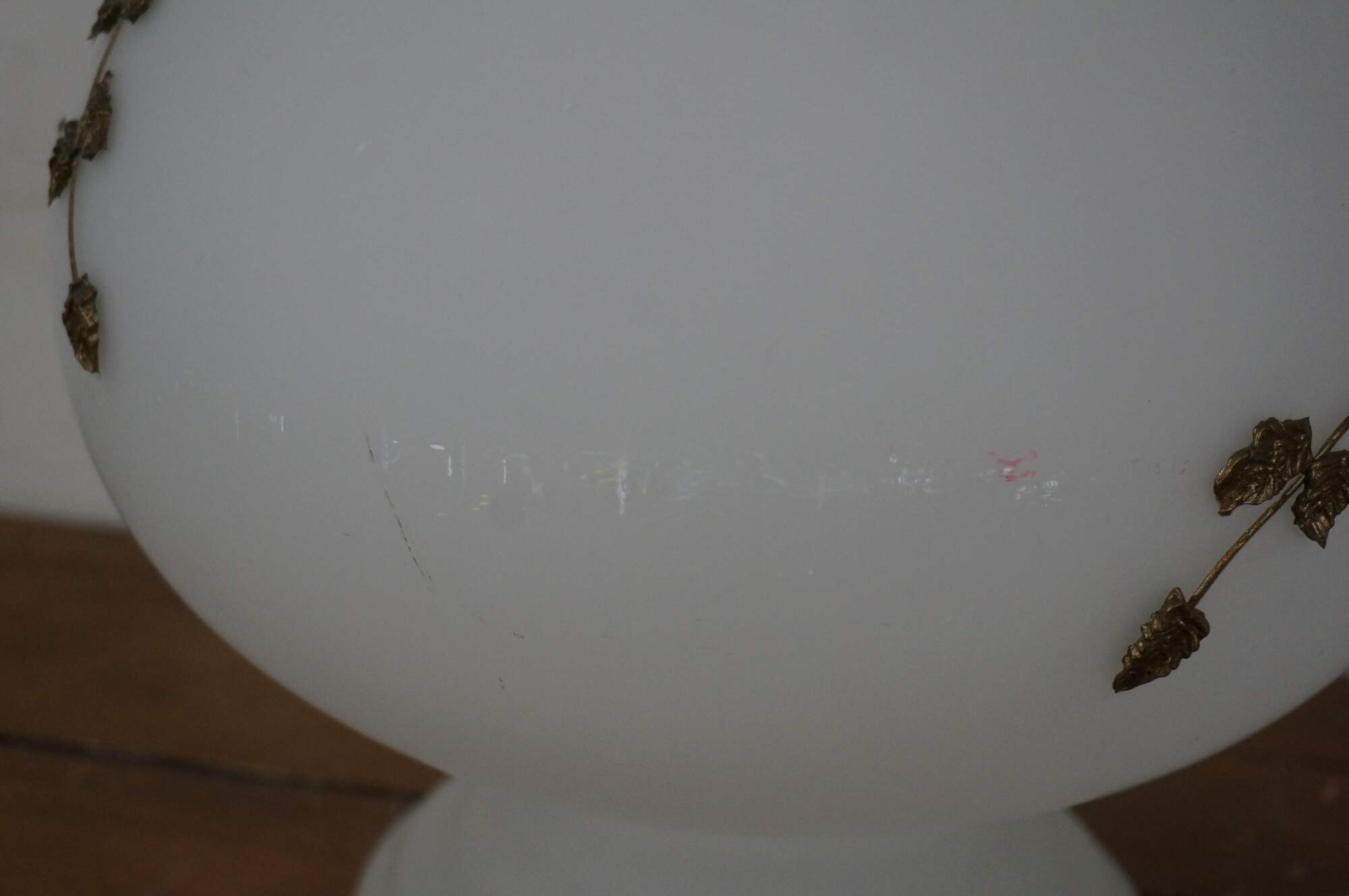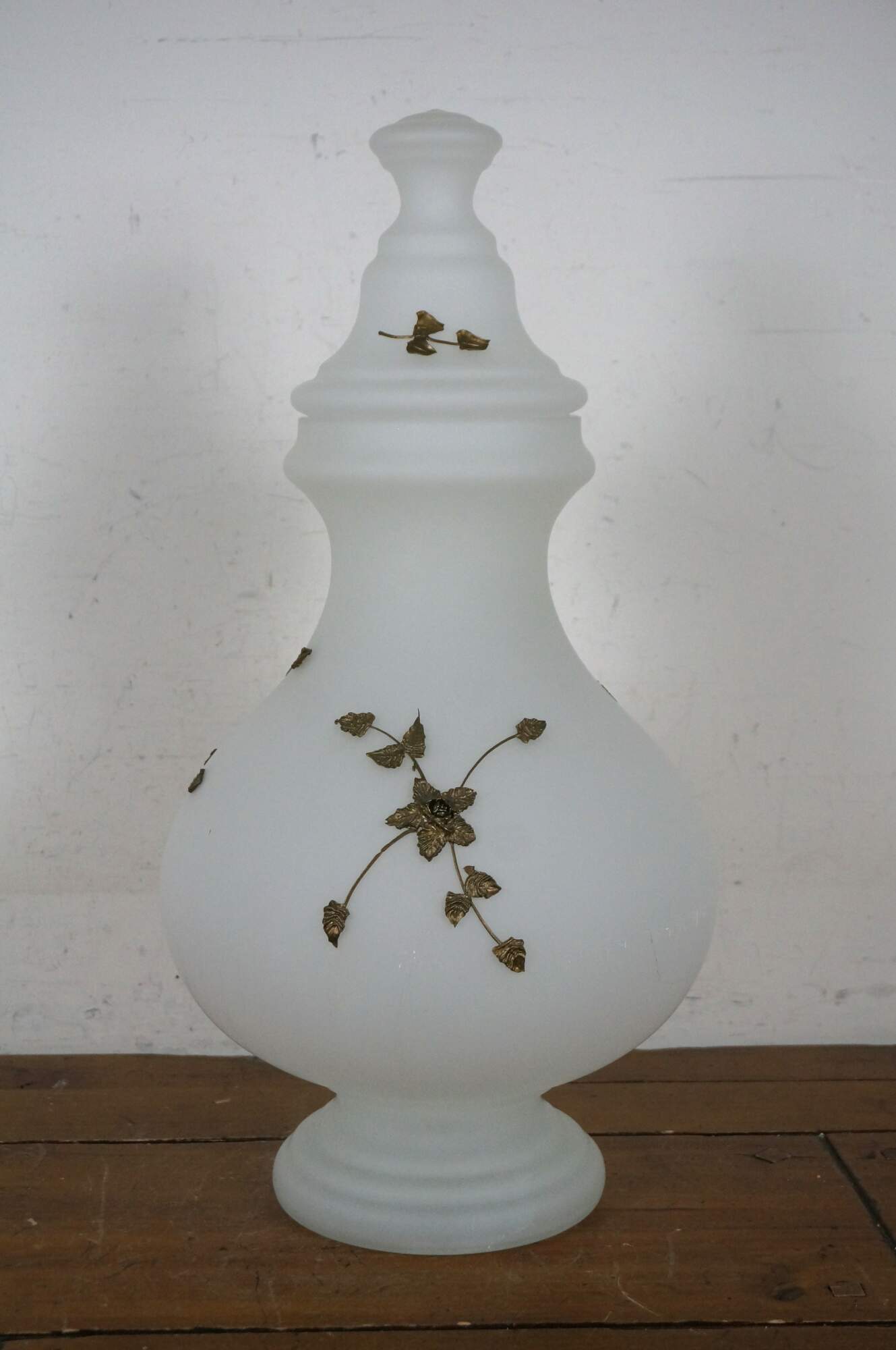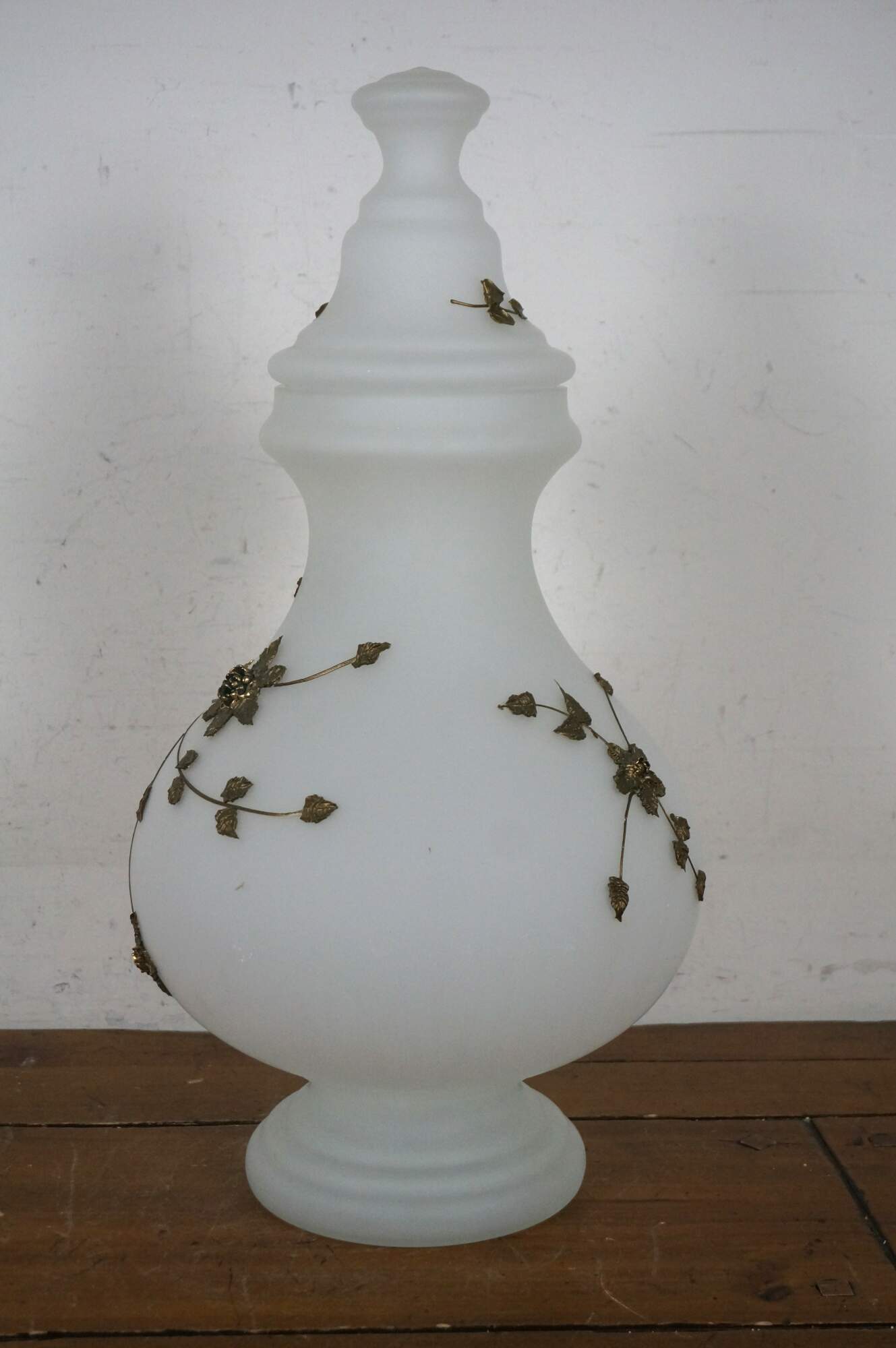 Mid 20th century Carl Falkenstein / Hollywood Regency style lidded urn / jar, made of white frosted glass with a design of applied bronze flowers and leaves.