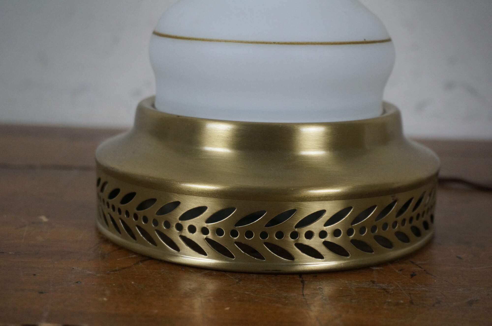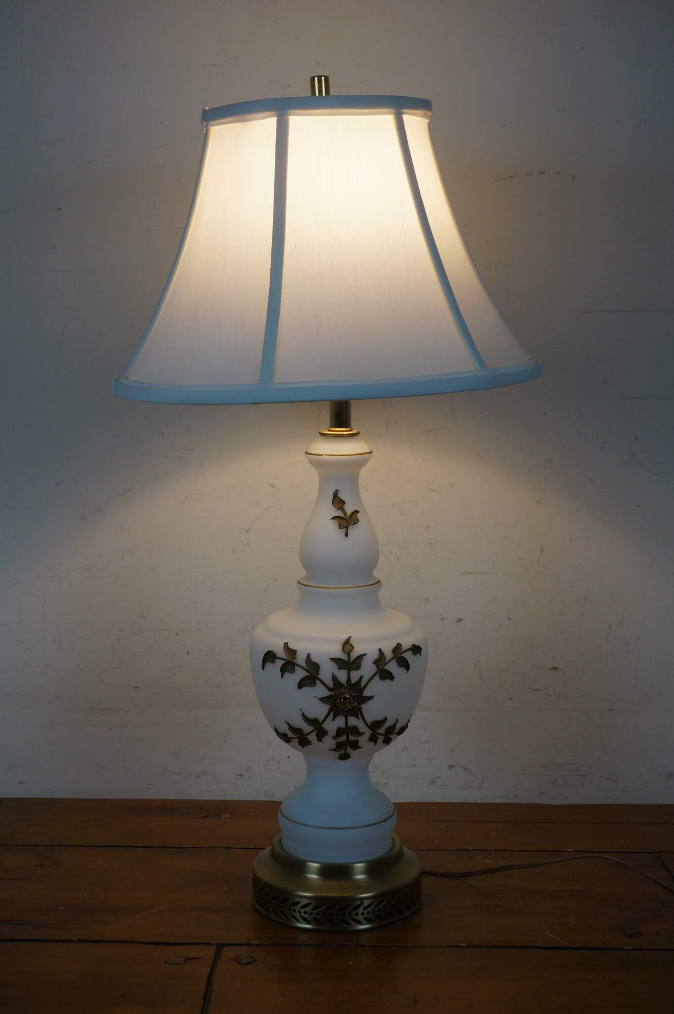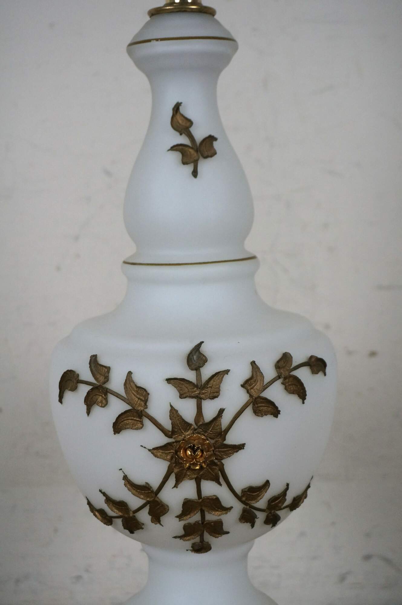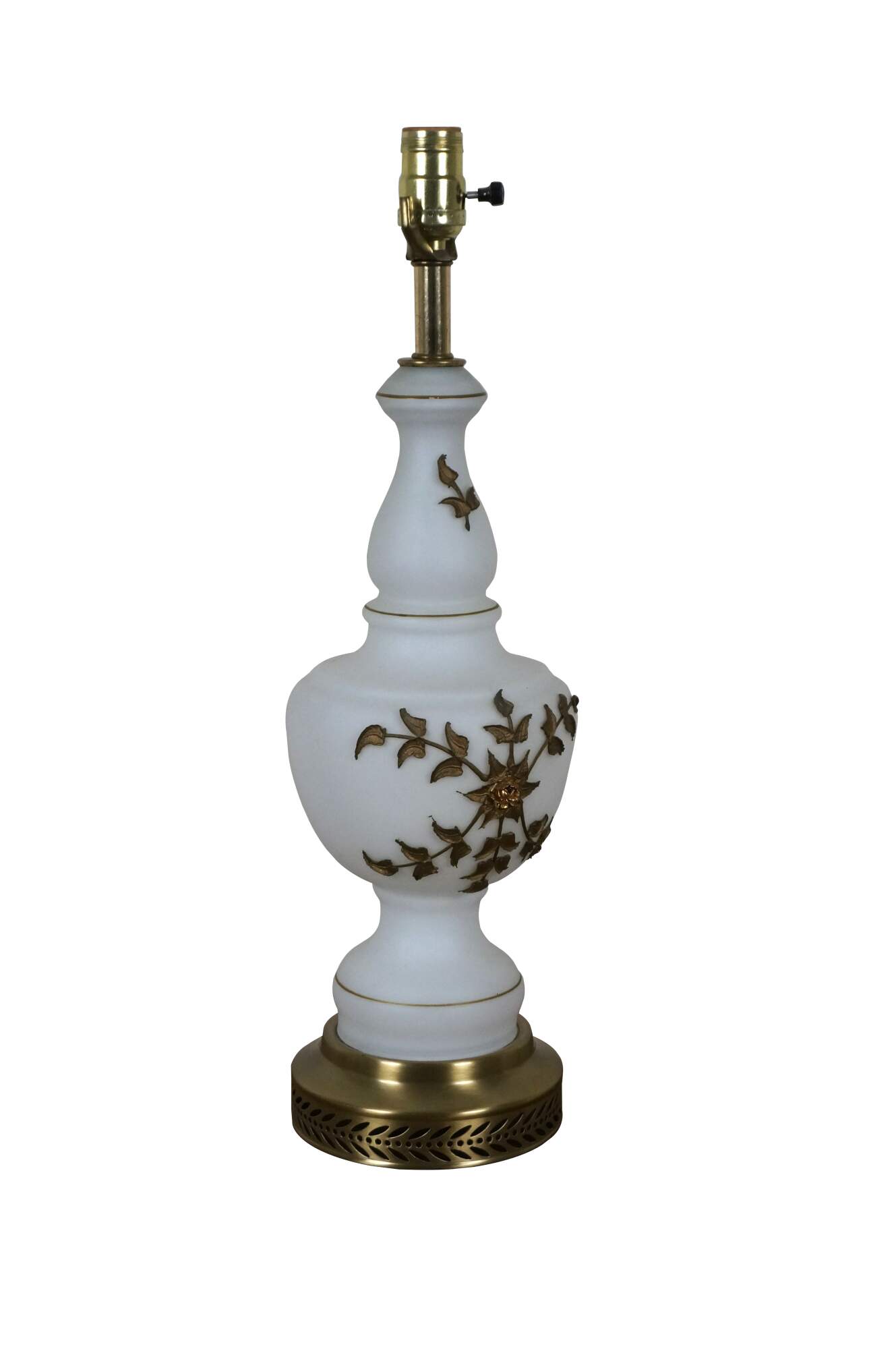 Mid 20th century Carl Falkenstein / Hollywood Regency style white frosted glass table lamp featuring a leaf pierced brass base and a design of applied bronze flowers and leaves. Includes harp, brass cap shaped finial, and white fabric shade.