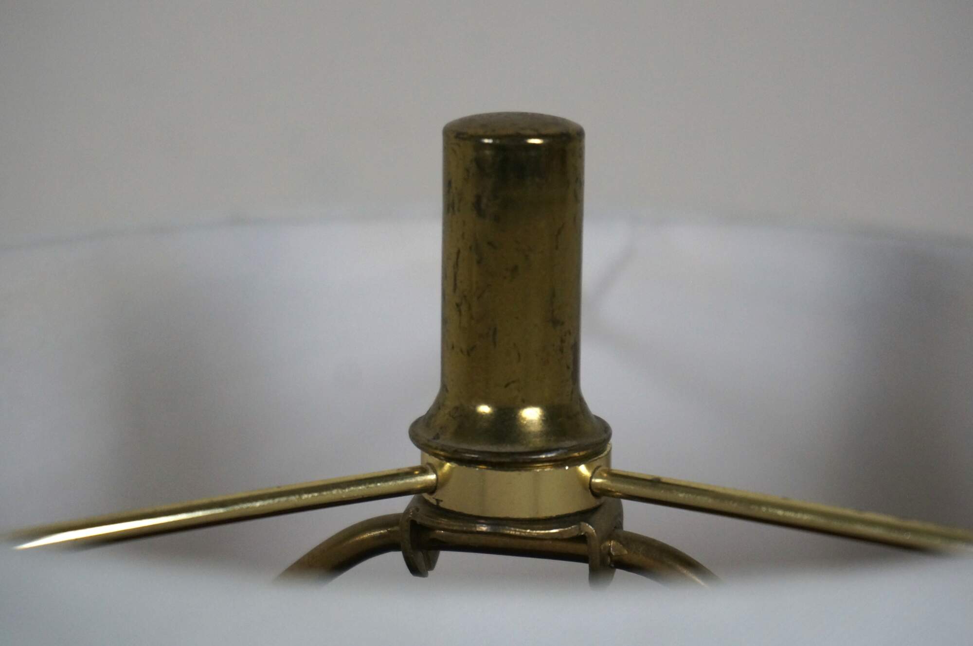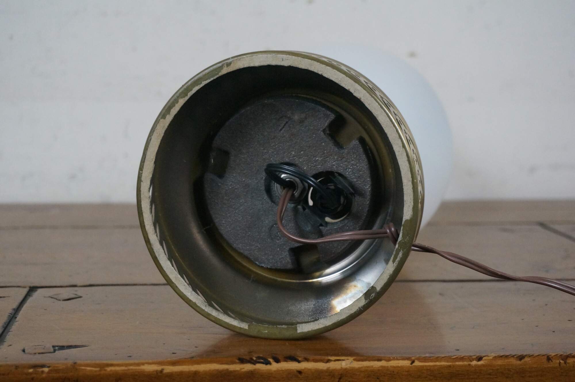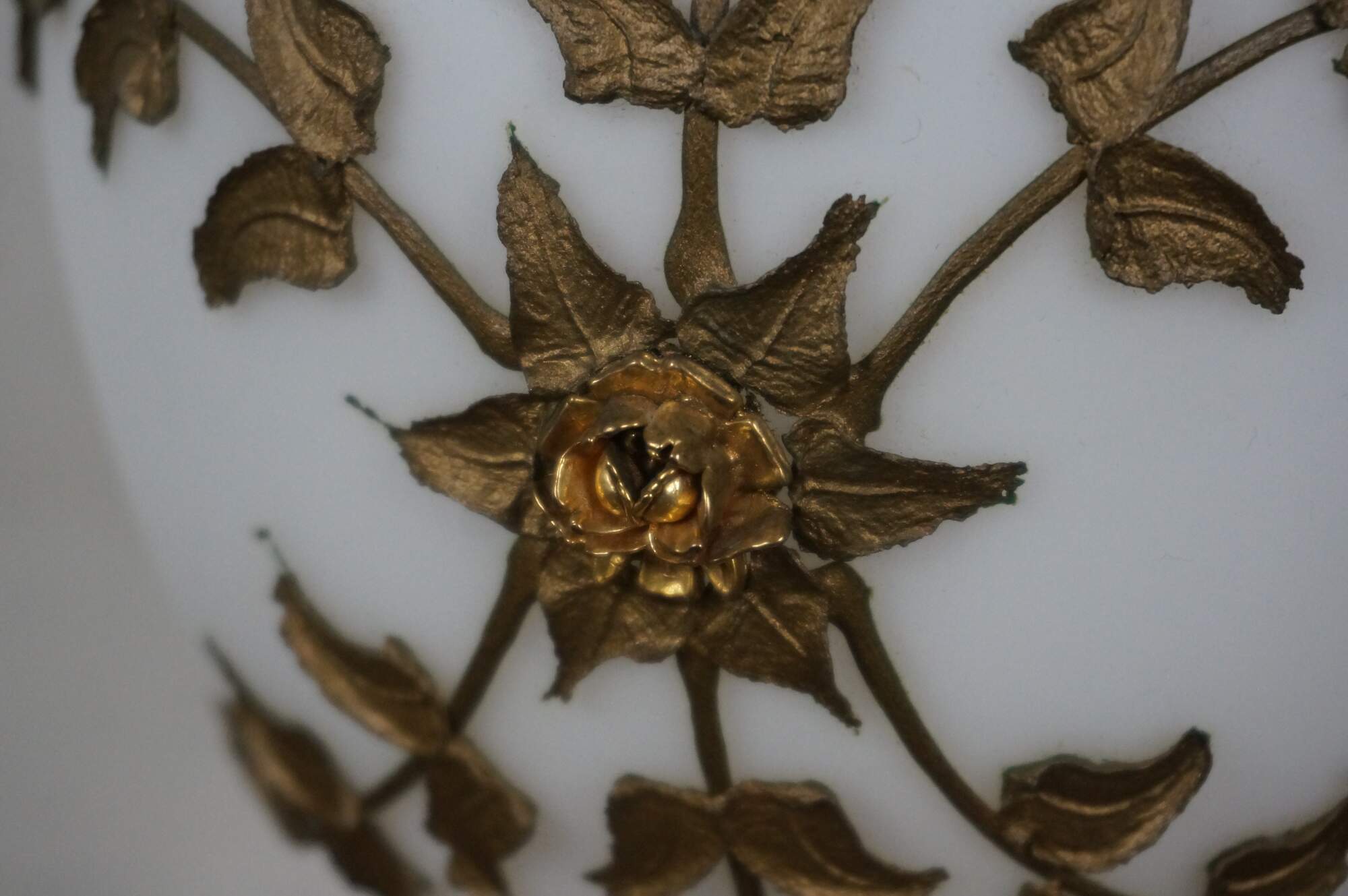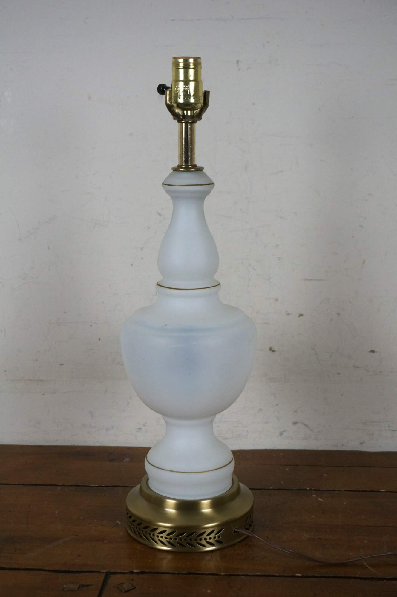 Mid 20th century Carl Falkenstein / Hollywood Regency style white frosted glass table lamp featuring a leaf pierced brass base and a design of applied bronze flowers and leaves. Includes harp, brass cap shaped finial, and white fabric shade.
