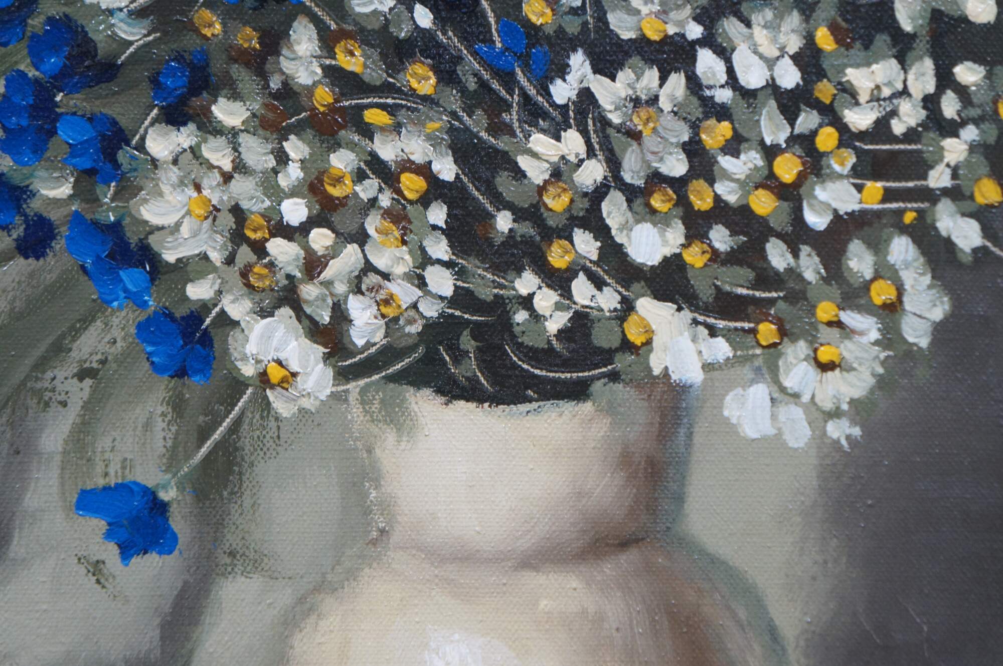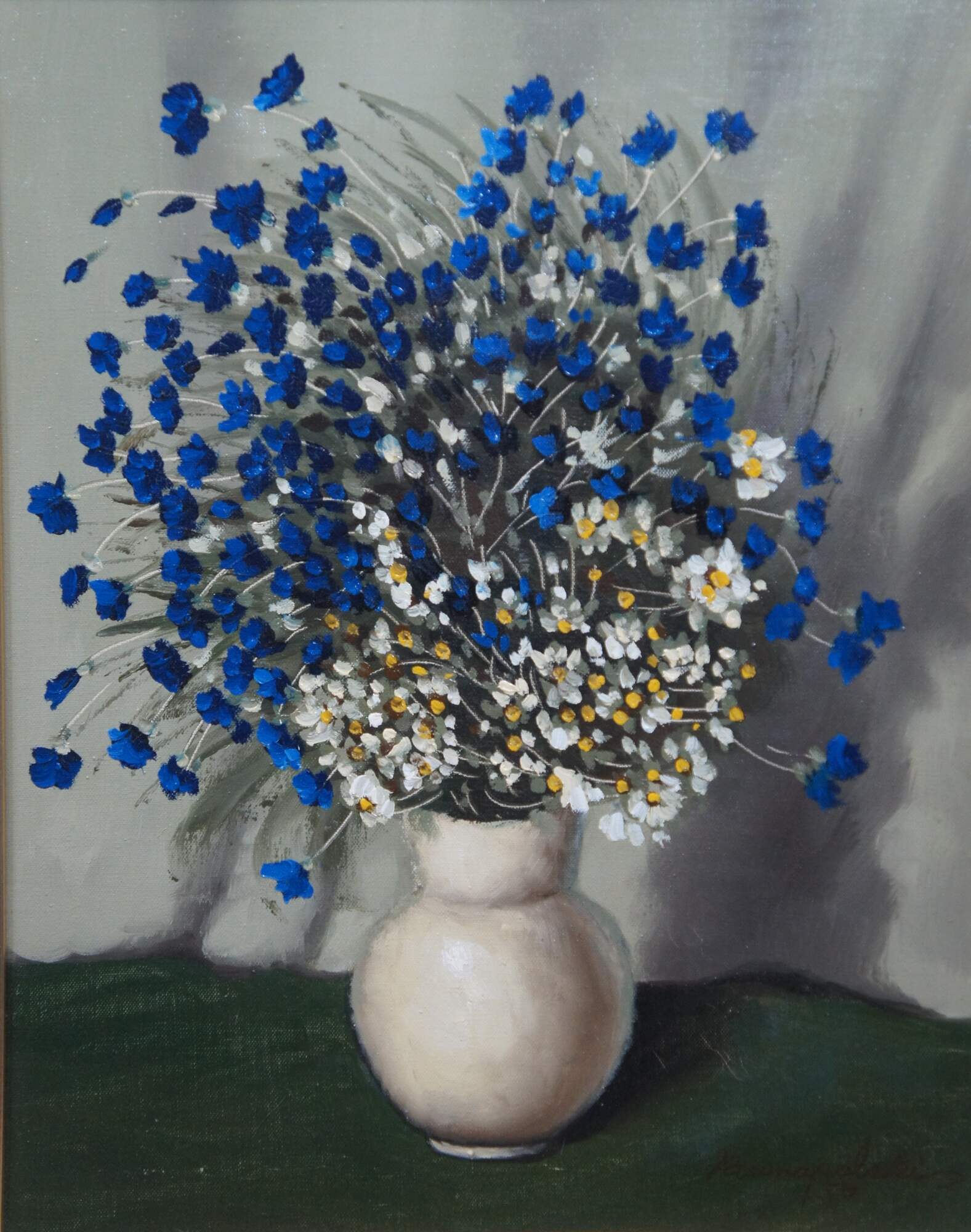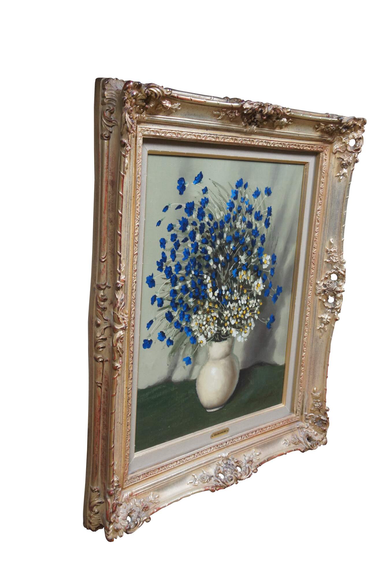 Circa 1970's oil on canvas still life painting by Stanley Krasnapolski, depicting a white vase filled with blue and white flowers, on a green and gray background. Signed in lower right corner. Made in USA for TMC - Chicago. Beveled giltwood frame with foliate corners and details; white linen mat.