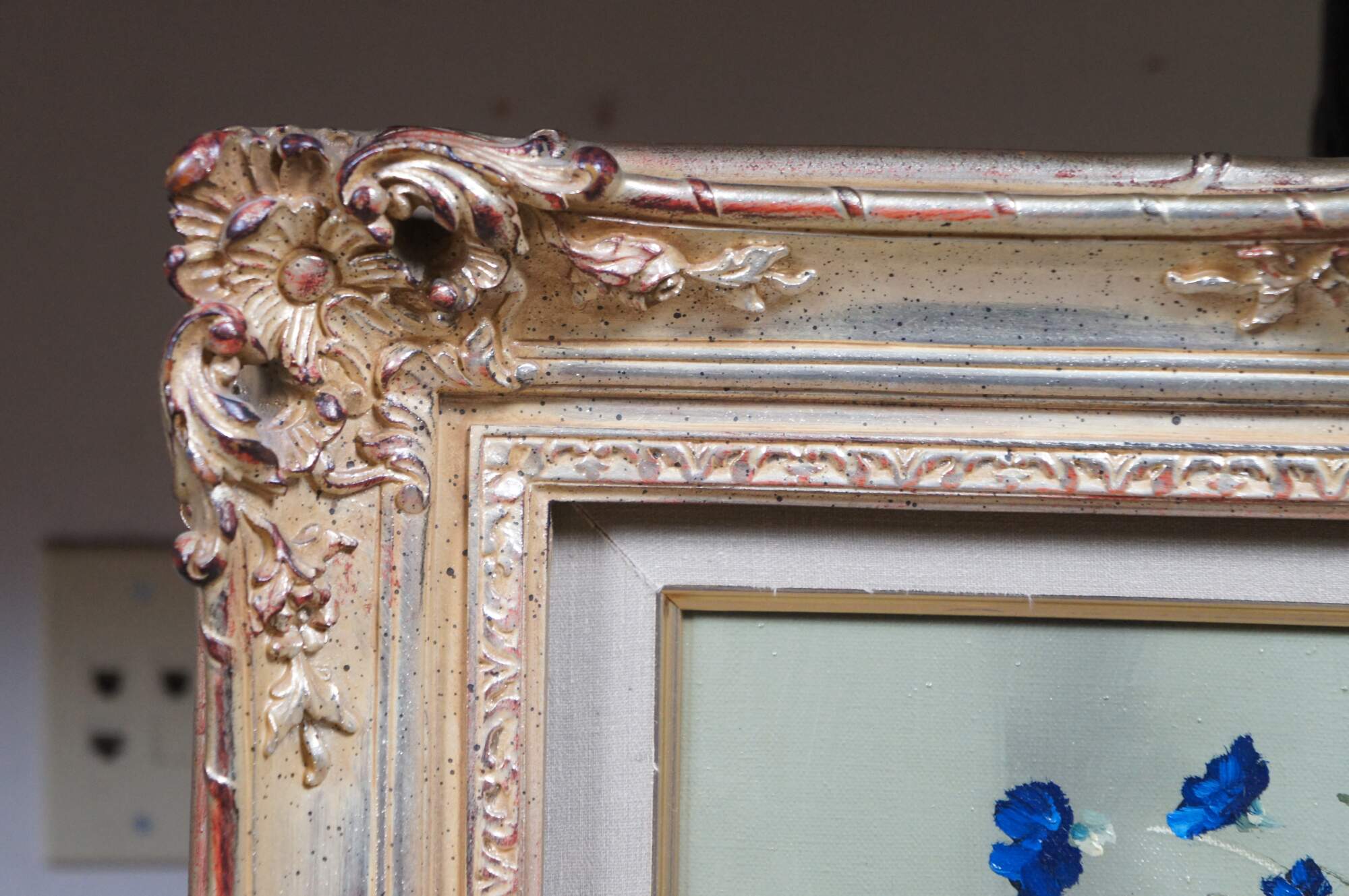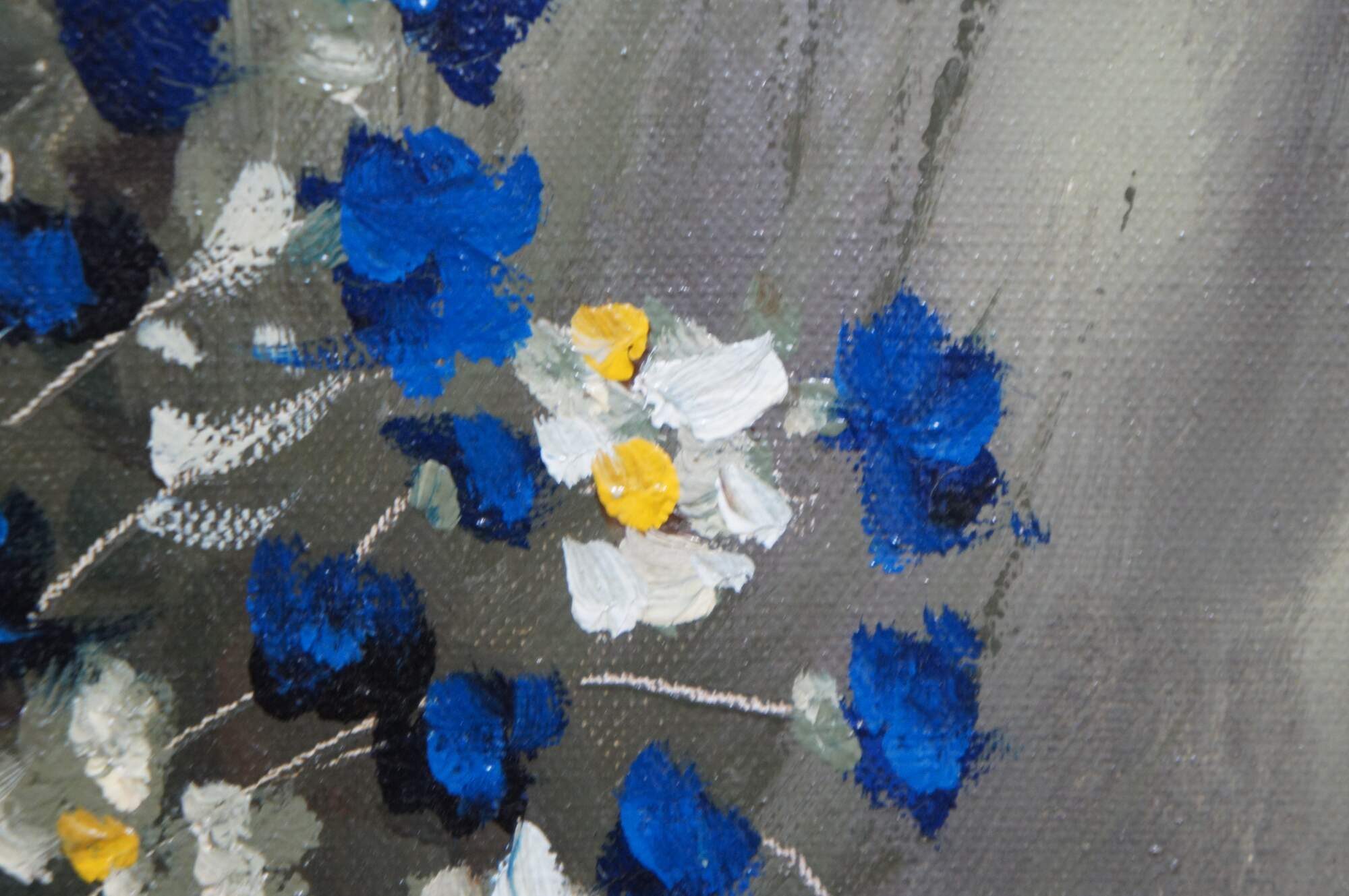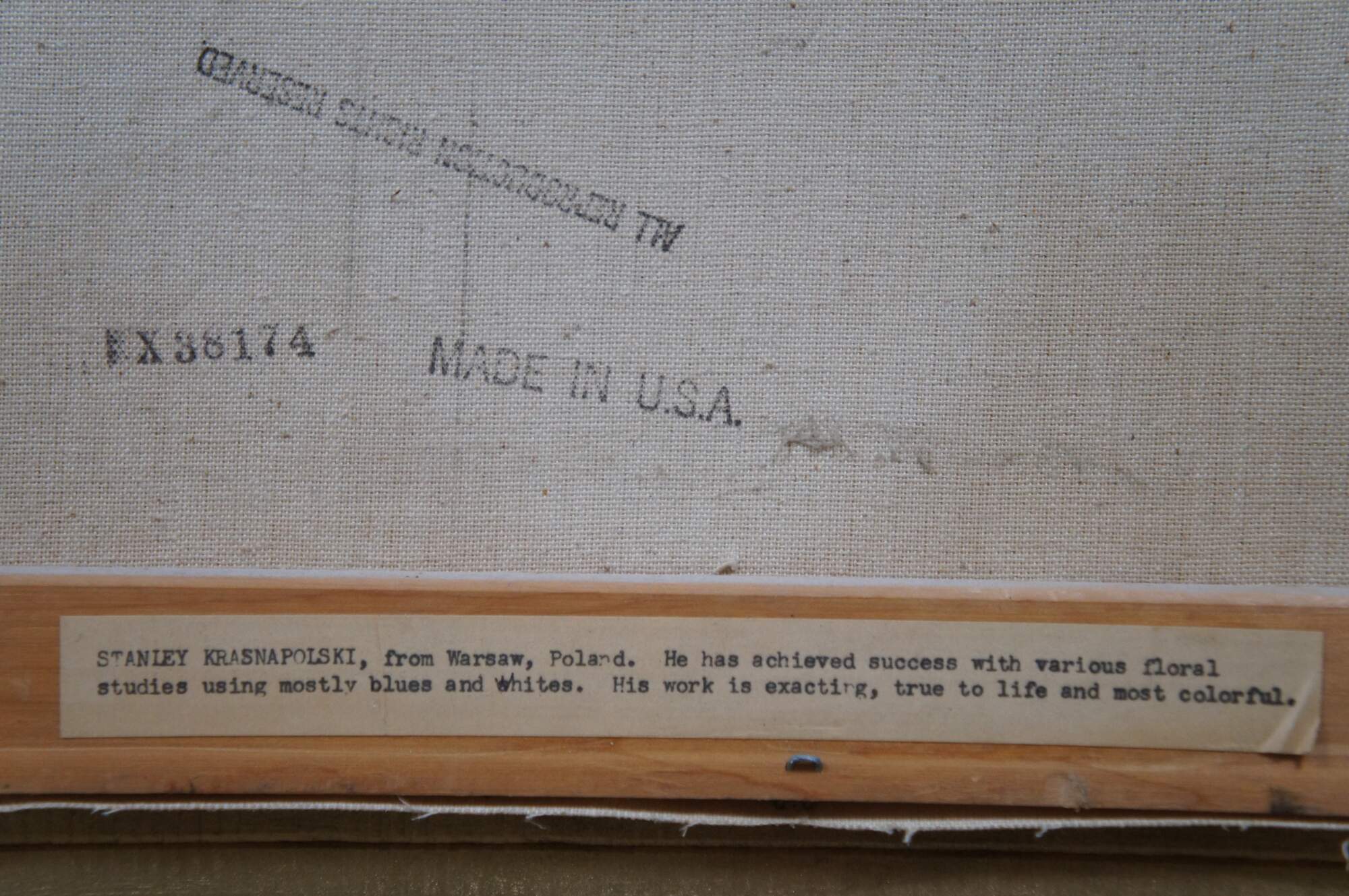 "Stanley Krasnapolski, from Warsaw, Poland. He has achieved success with various floral studies using mostly blues and whites. His work is exacting, true to life and most colorful." (TMC Chicago Label)