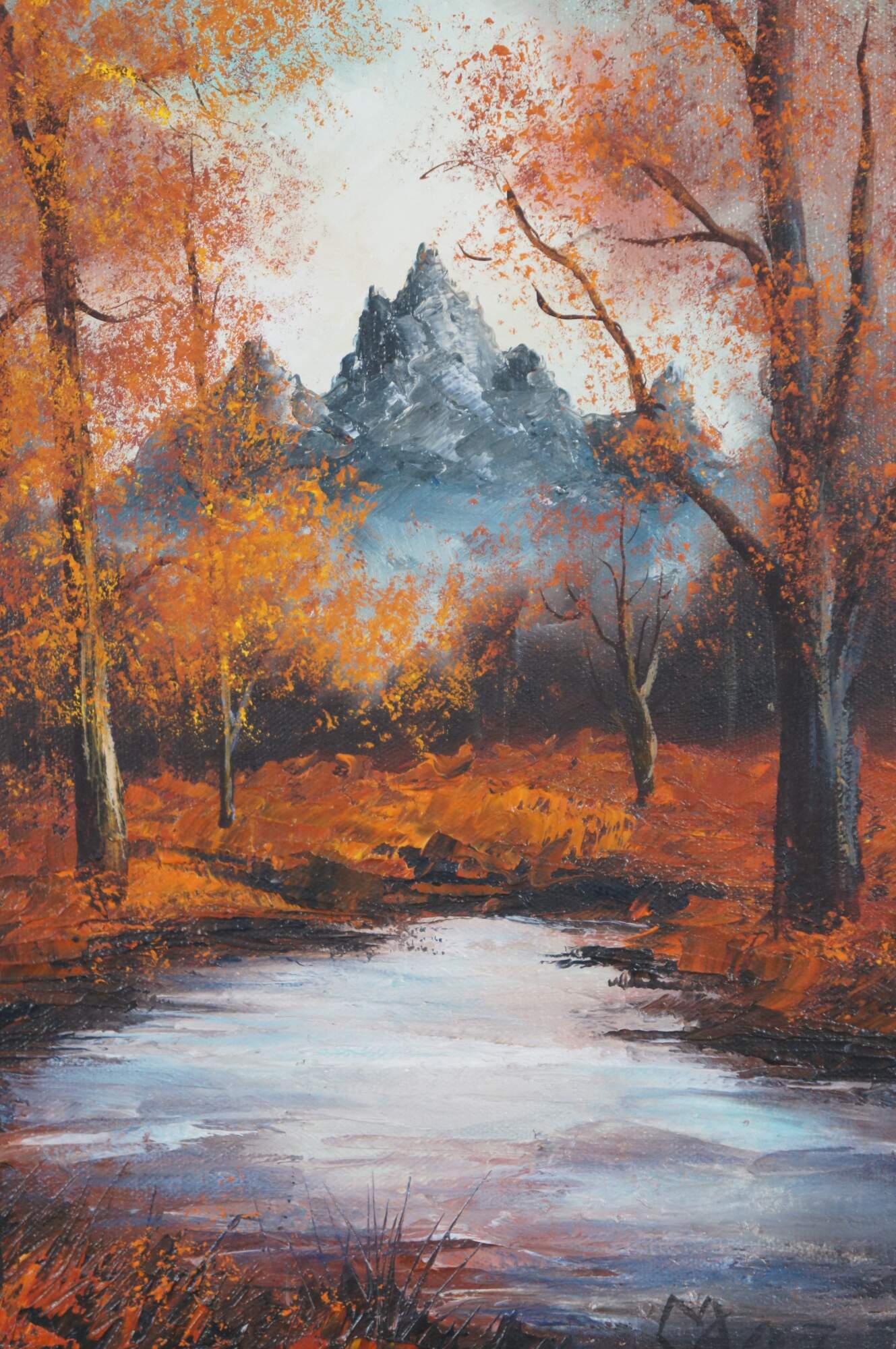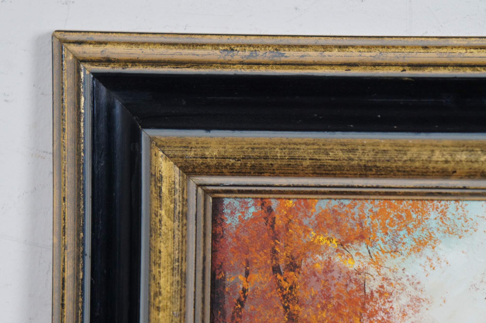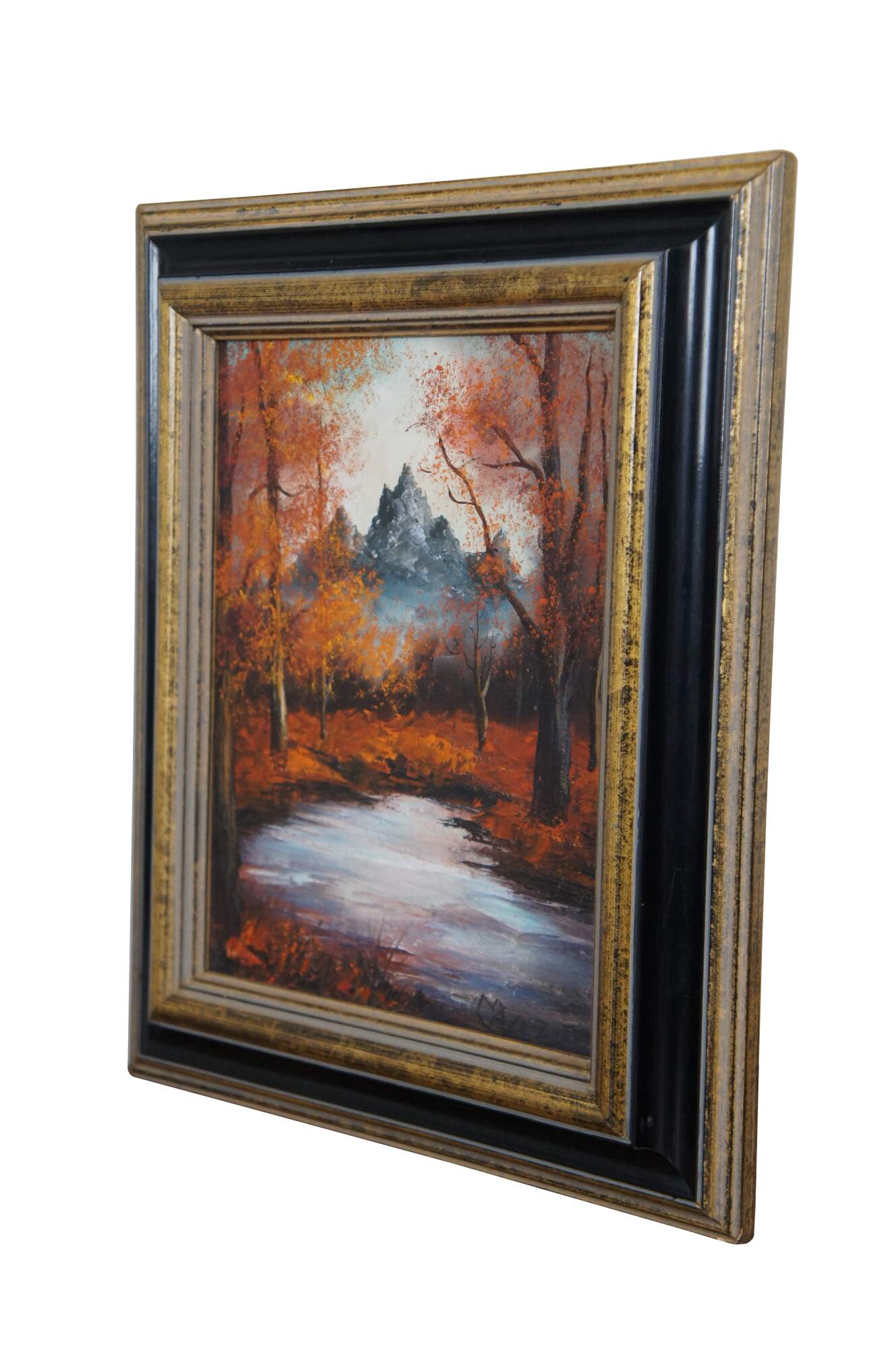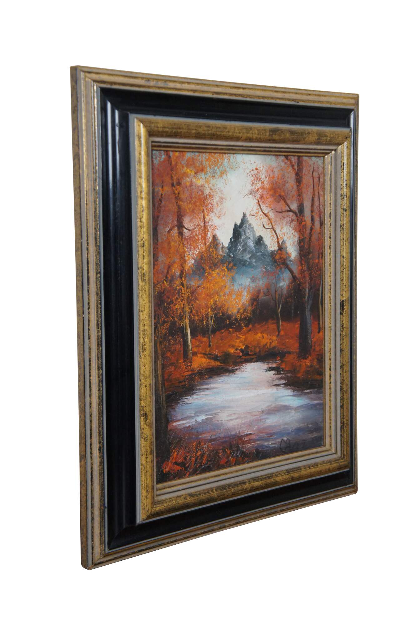 Late 20th-century oil painting on canvas depicting a richly colored impressionist-style autumn forest of red and orange trees around a small pond, with a bare mountain in the distance. Signed at lower right edge. Beveled giltwood frame with black painted detail.