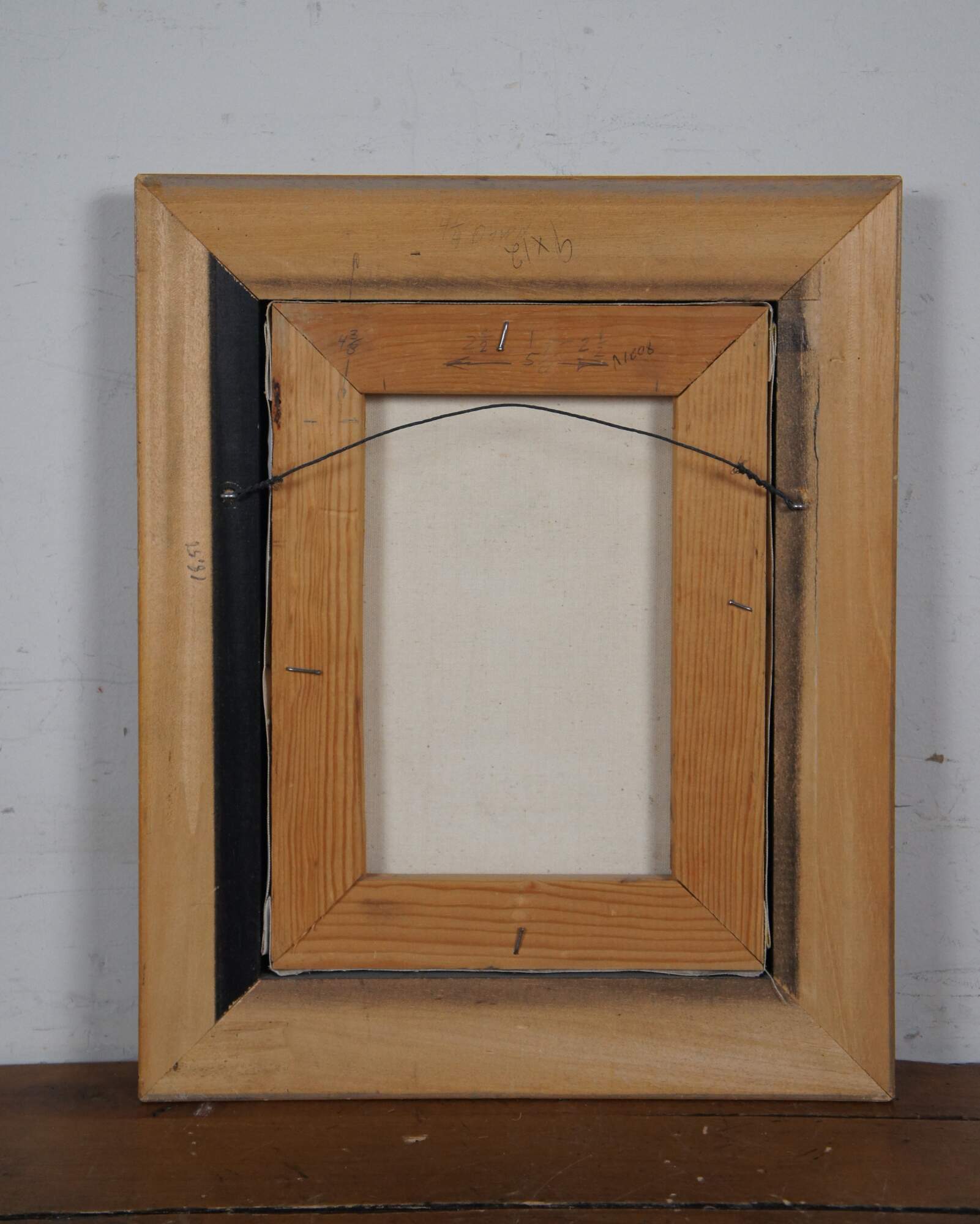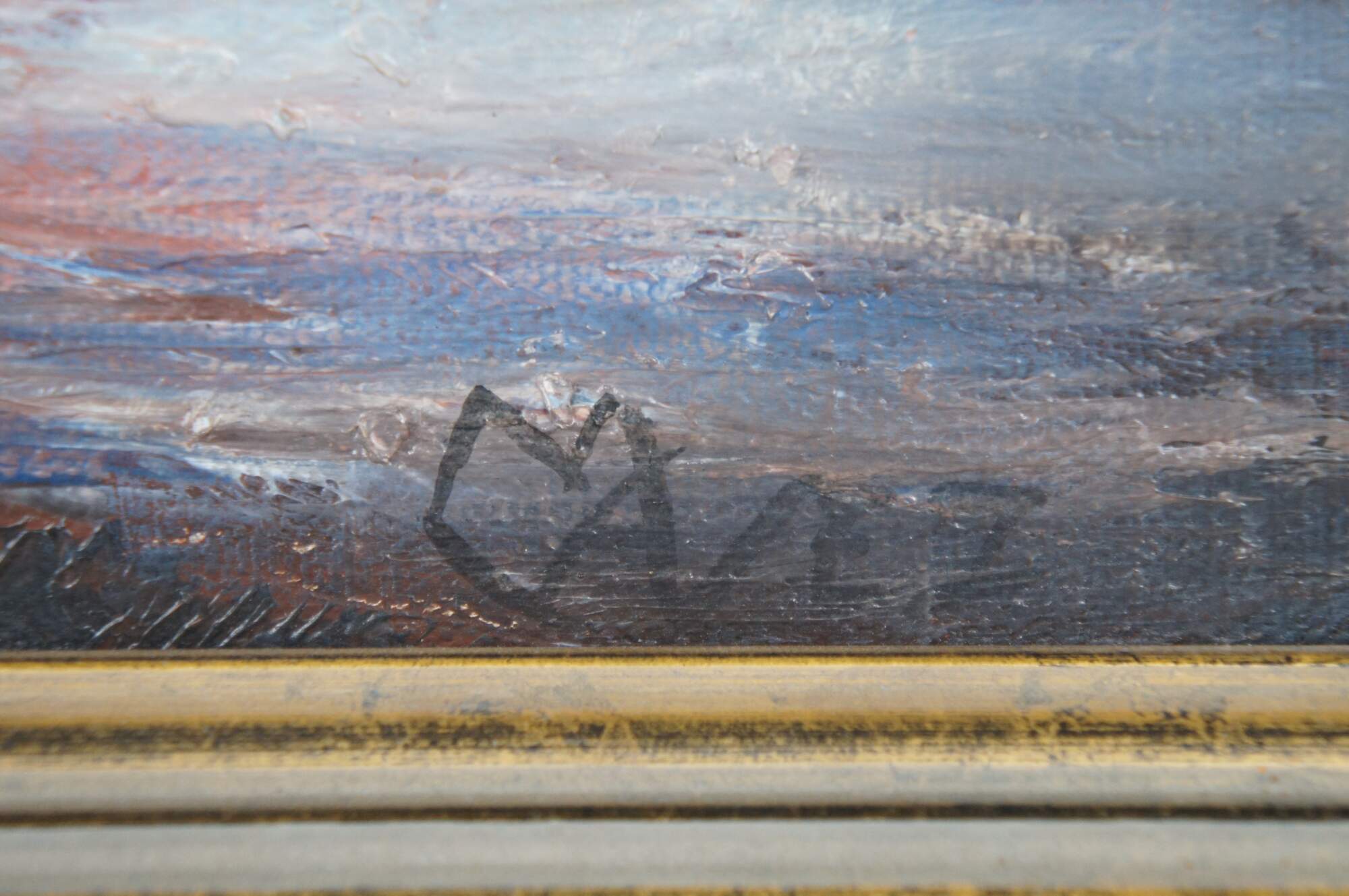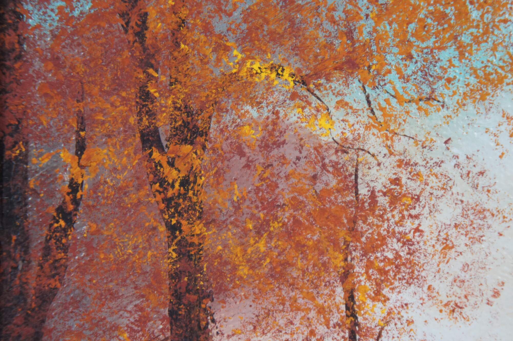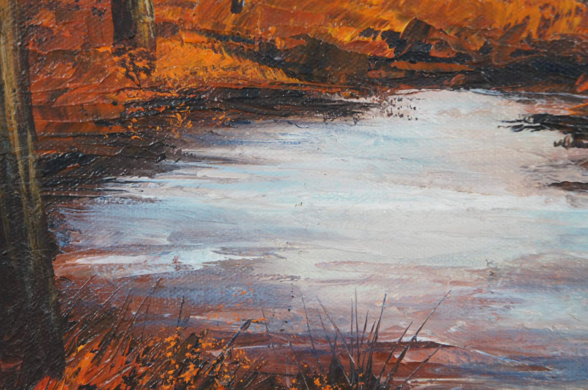 Late 20th-century oil painting on canvas depicting a richly colored impressionist-style autumn forest of red and orange trees around a small pond, with a bare mountain in the distance. Signed at lower right edge. Beveled giltwood frame with black painted detail.