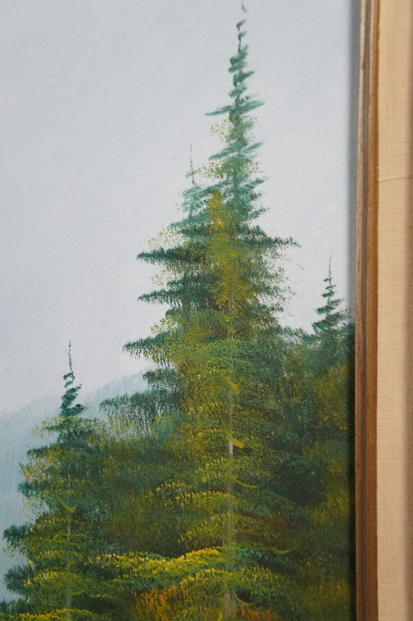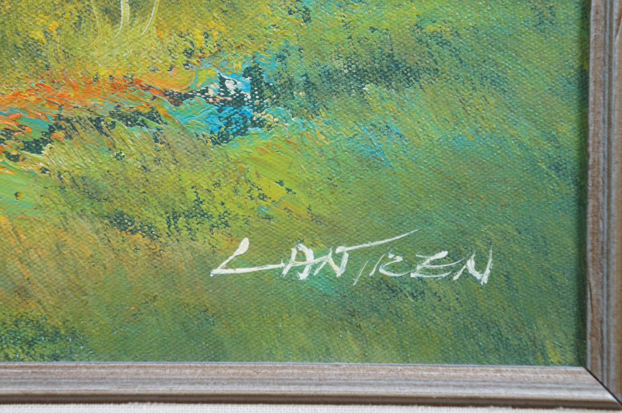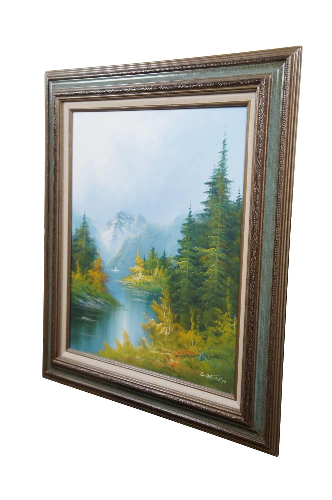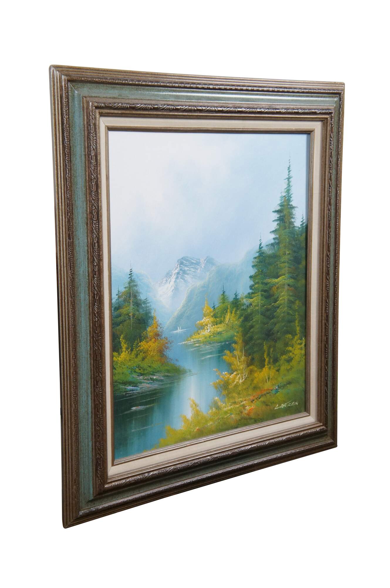 Vintage oil painting on canvas depicting a lush mountain nature landscape of pines along a river/lake. Signed Lantren in the lower right corner. Carved champagne gilt wood frame with green painted detail; white linen mat.