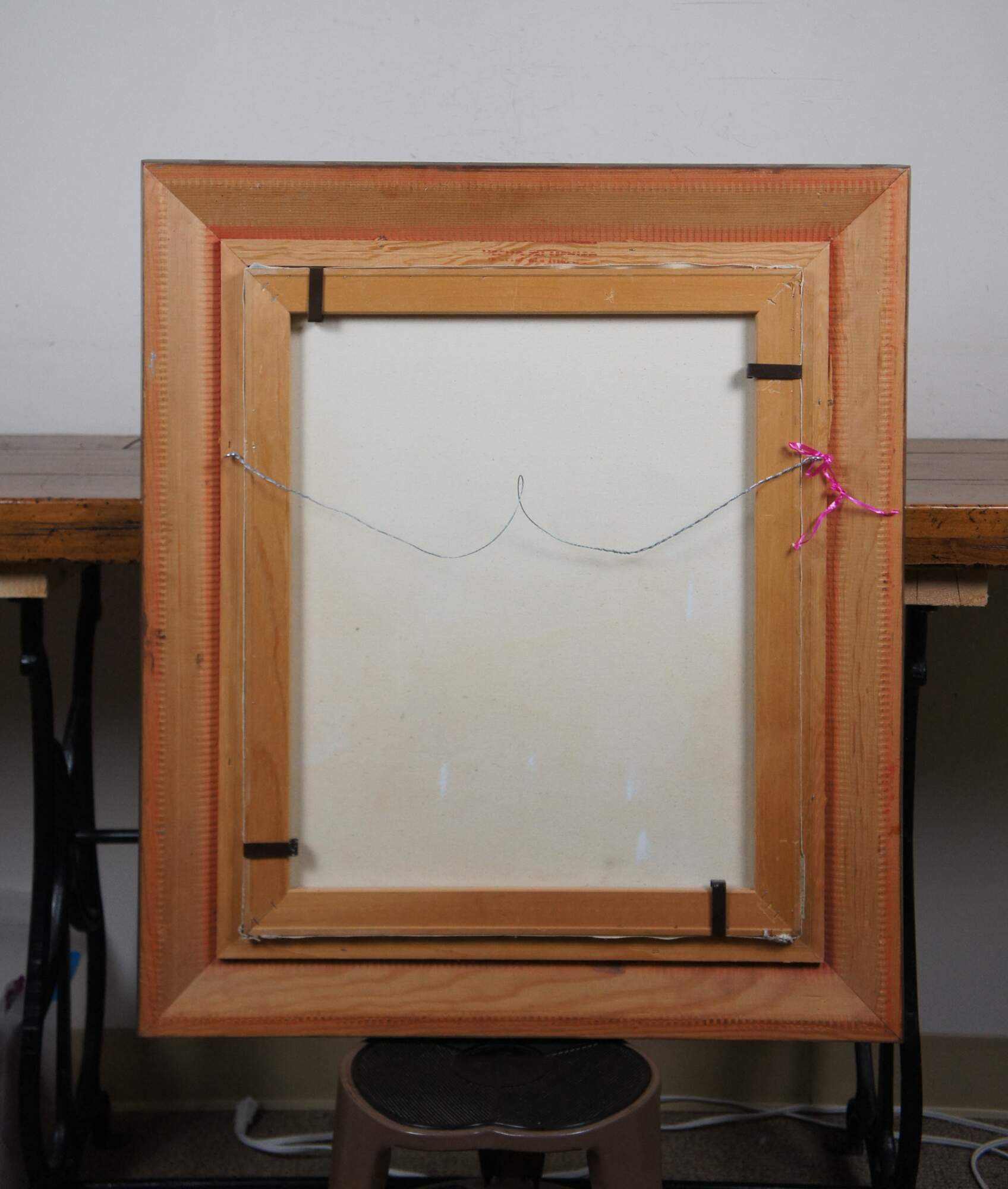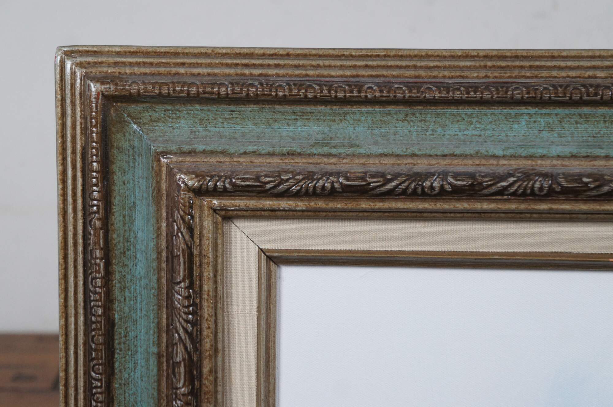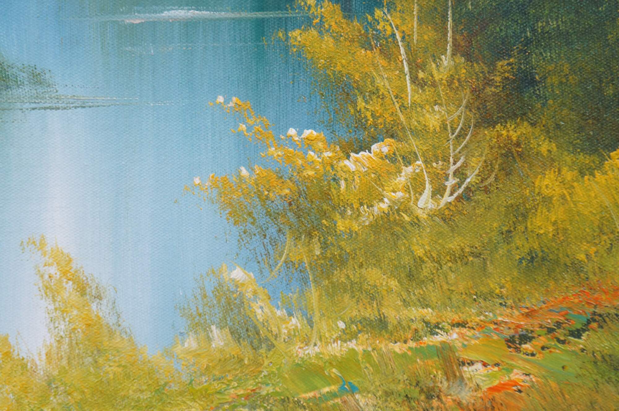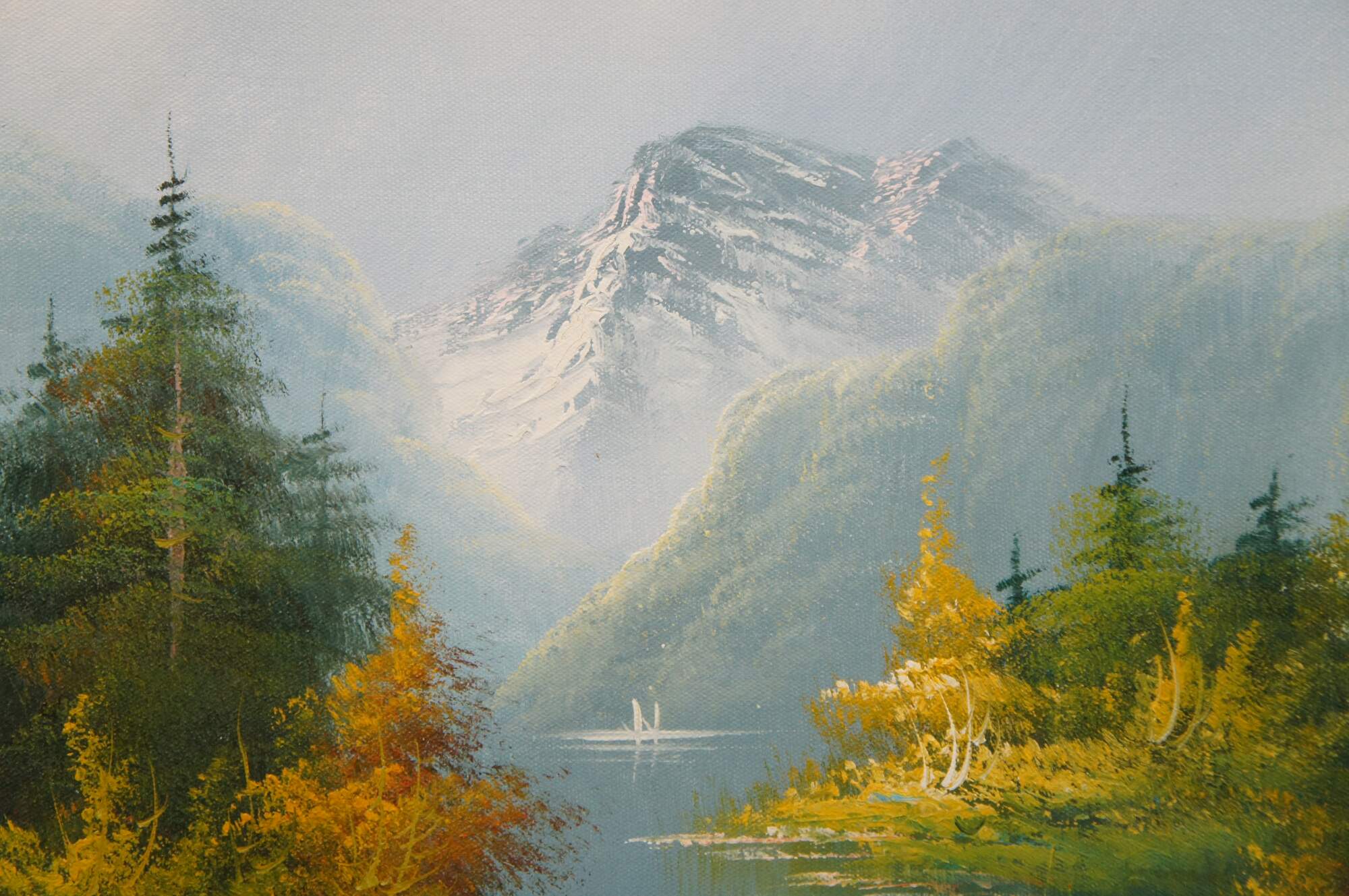 Vintage oil painting on canvas depicting a lush mountain nature landscape of pines along a river/lake. Signed Lantren in the lower right corner. Carved champagne gilt wood frame with green painted detail; white linen mat.