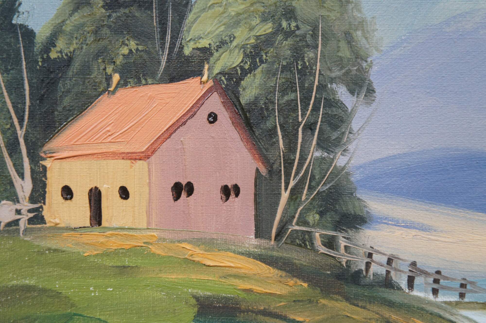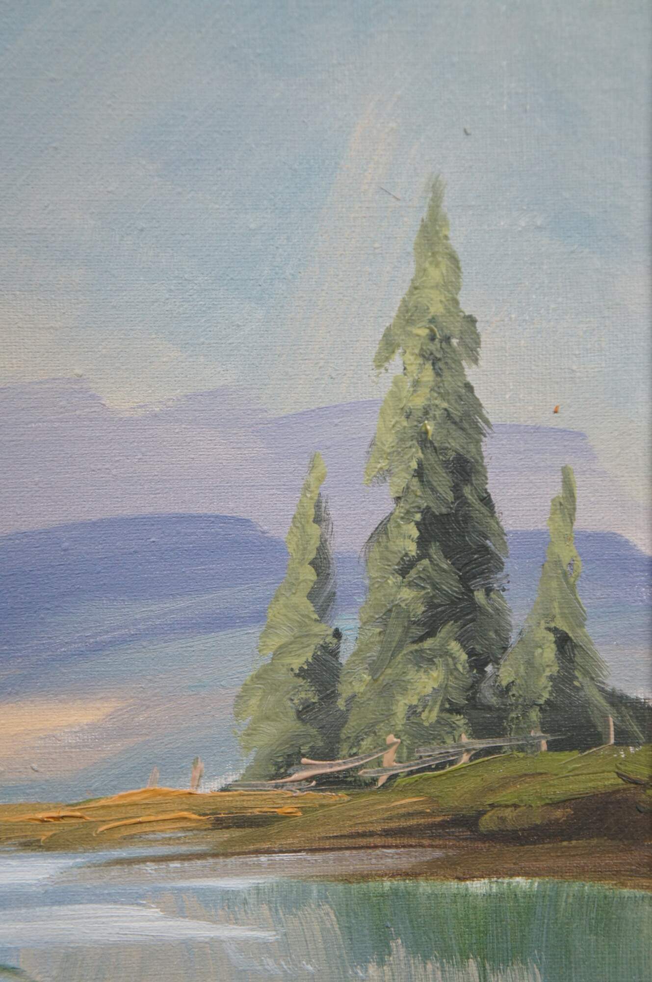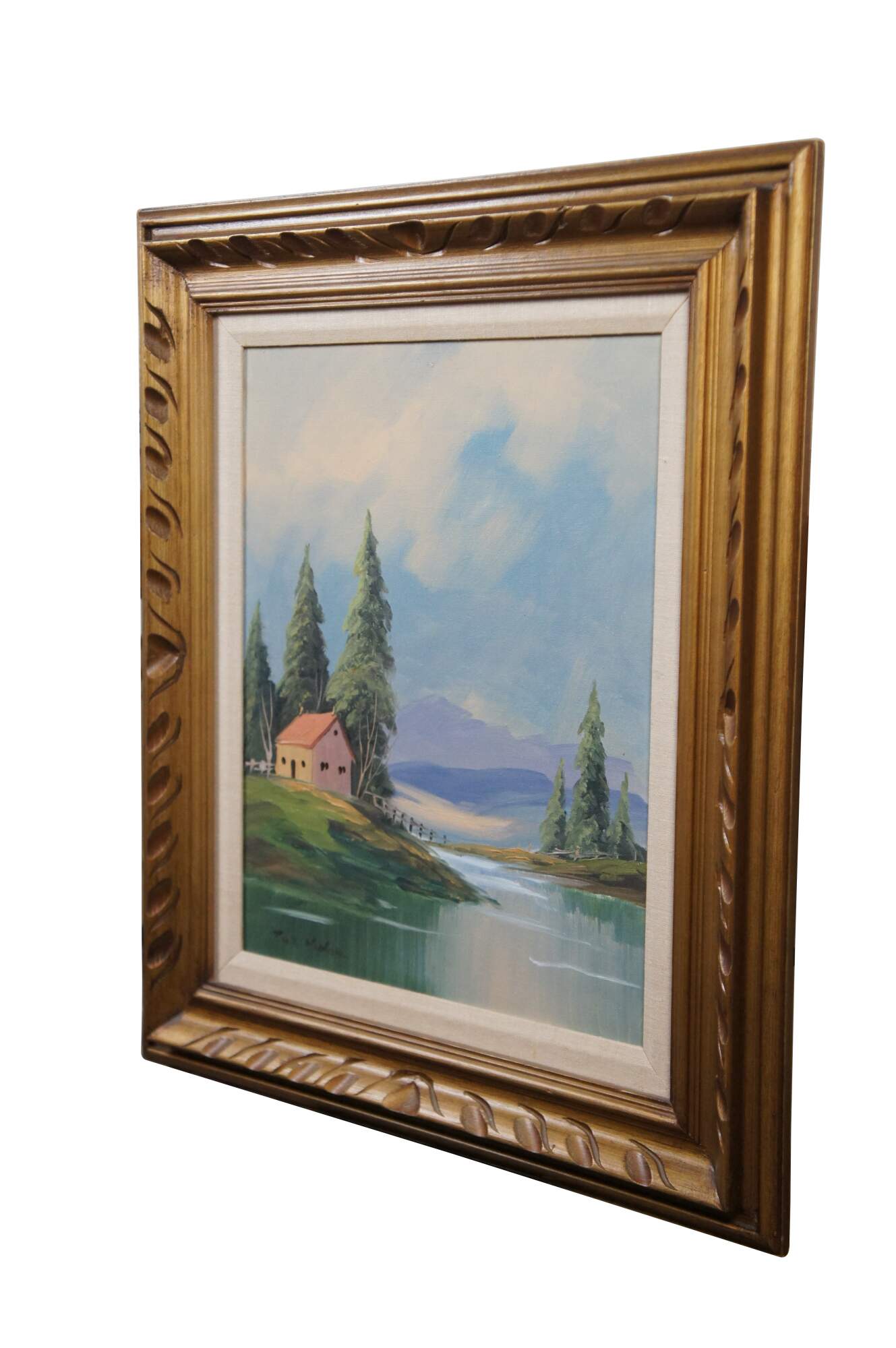 Late 20th century landscape oil painting on canvas depicting a cottage backed with pines, at the edge of a lake with hazy mountains in the background. Signed Taz in lower left corner. Carved and beveled giltwood frame; white linen mat.