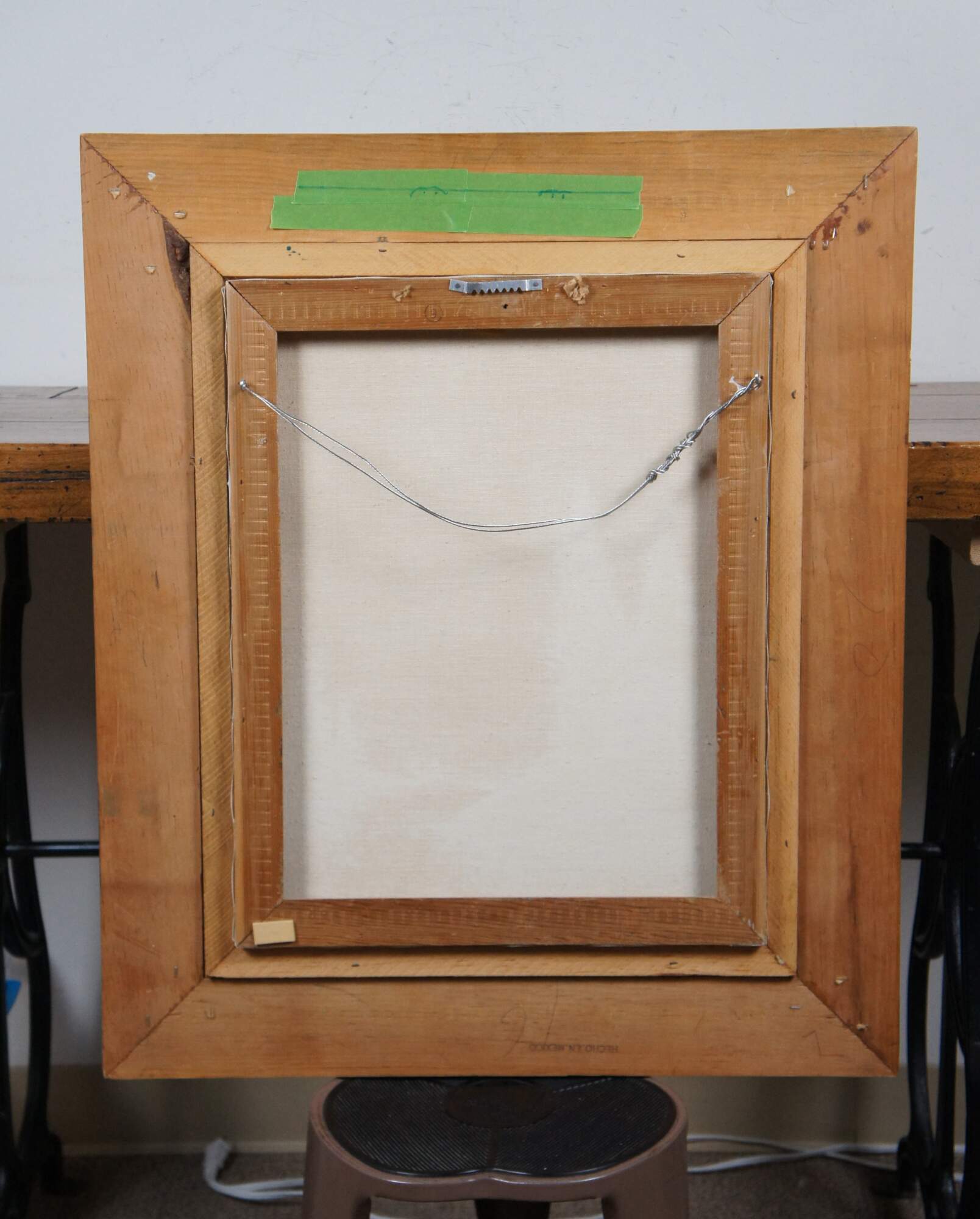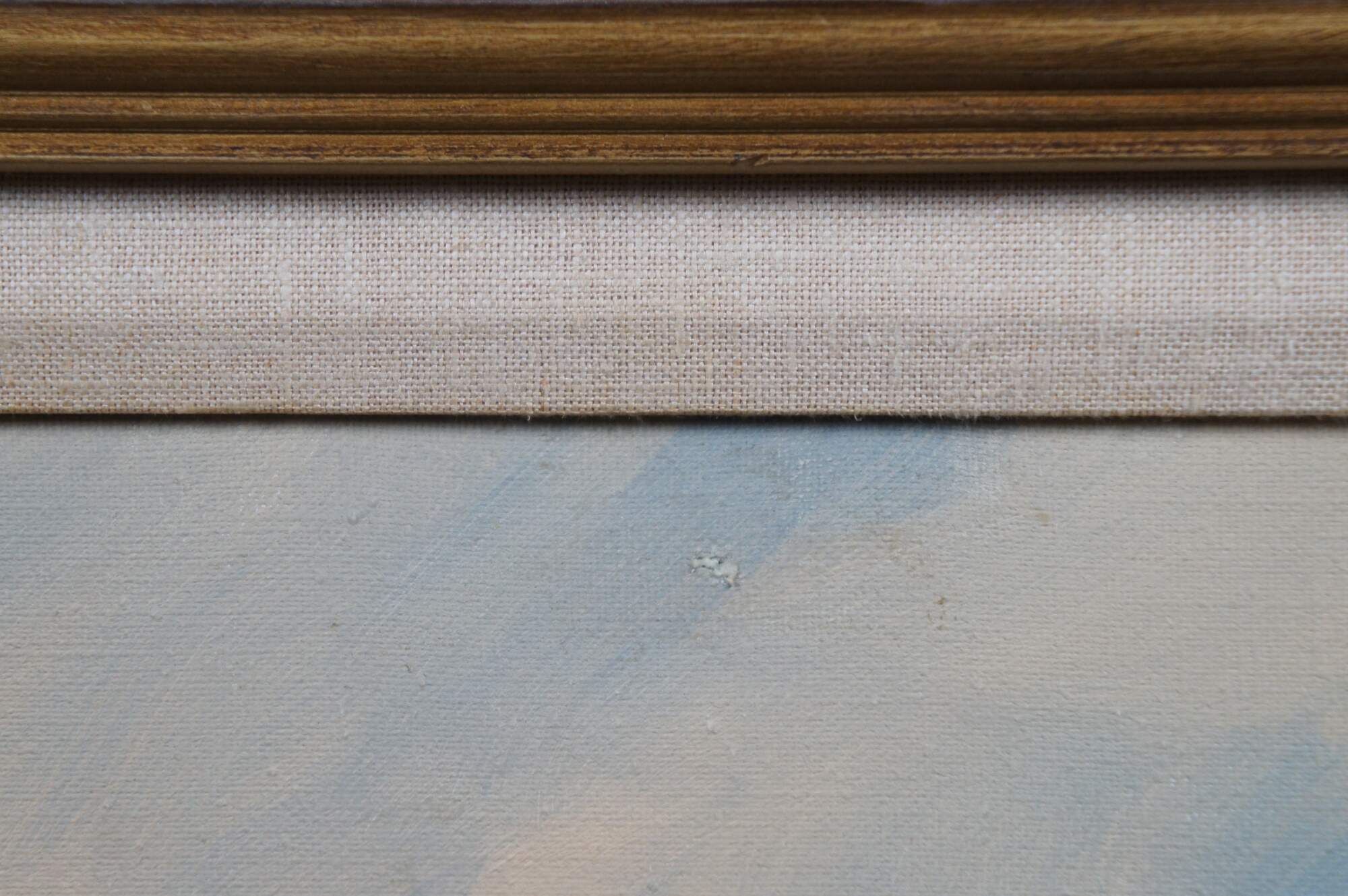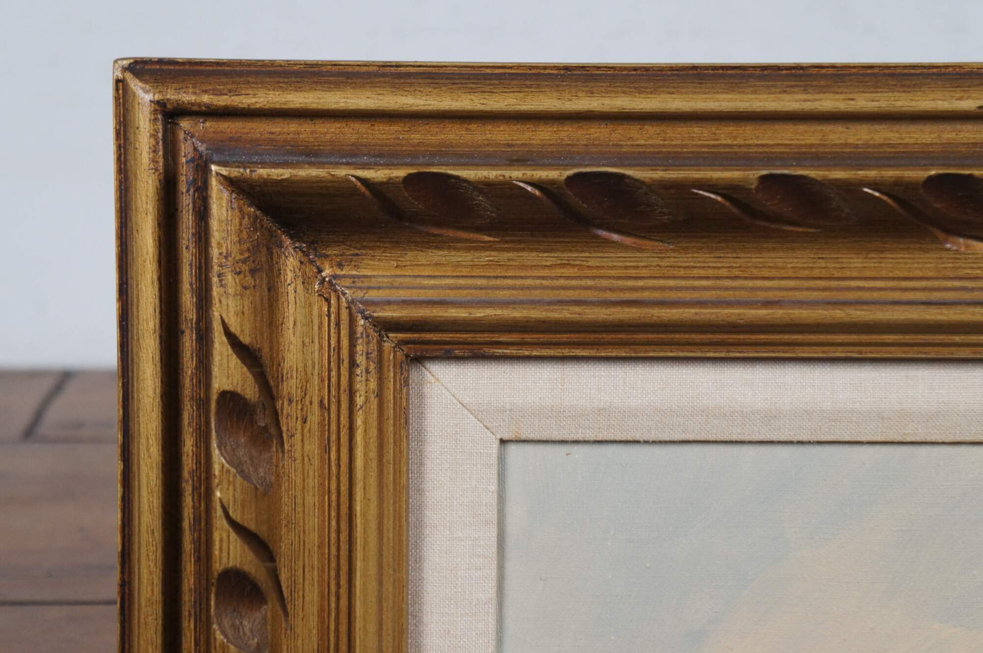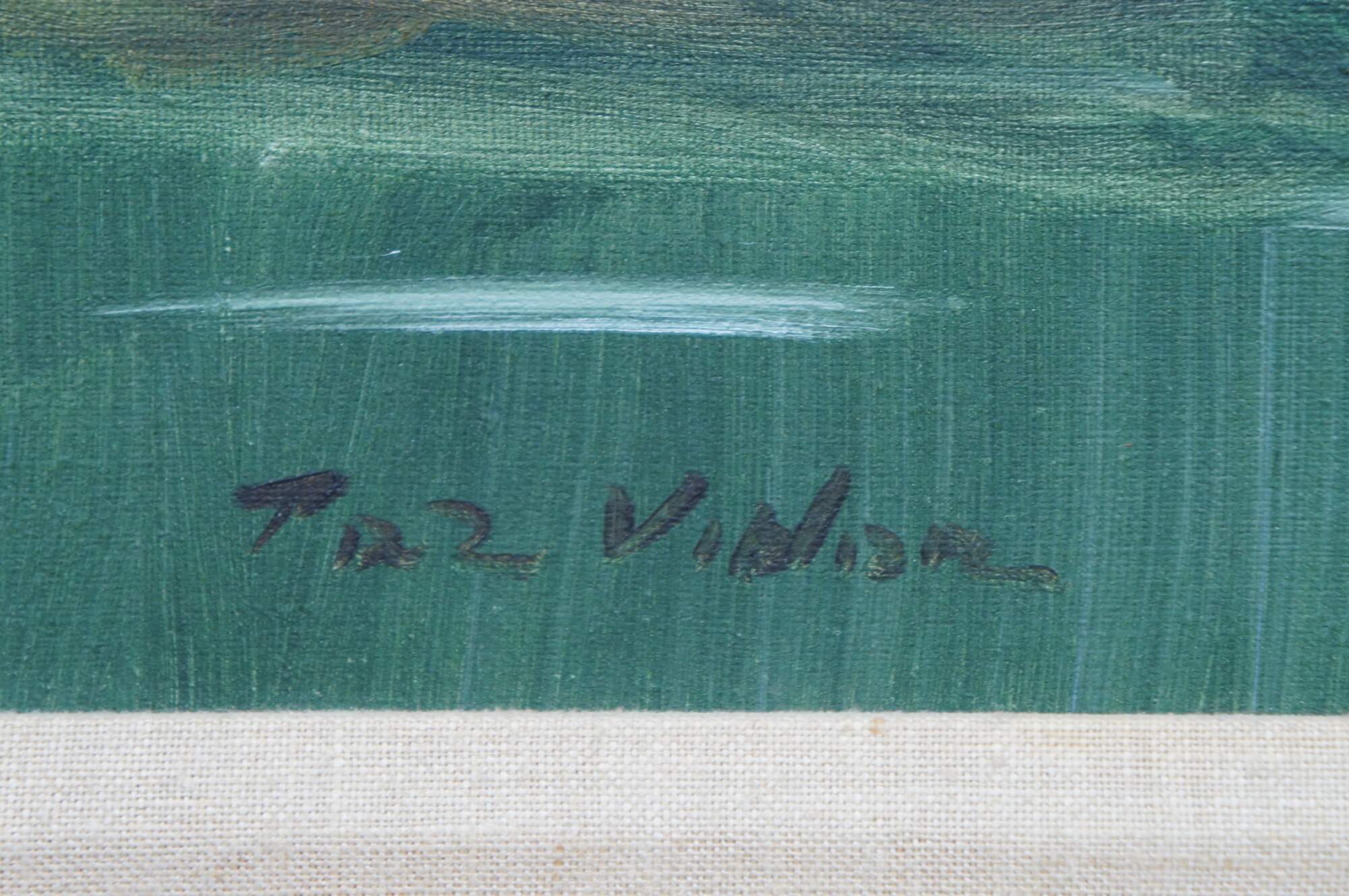 Late 20th century landscape oil painting on canvas depicting a cottage backed with pines, at the edge of a lake with hazy mountains in the background. Signed Taz in lower left corner. Carved and beveled giltwood frame; white linen mat.