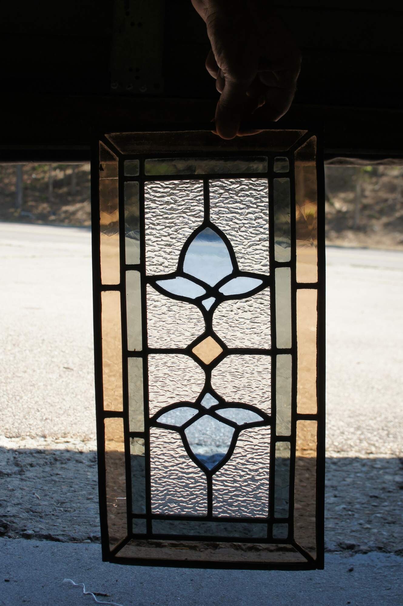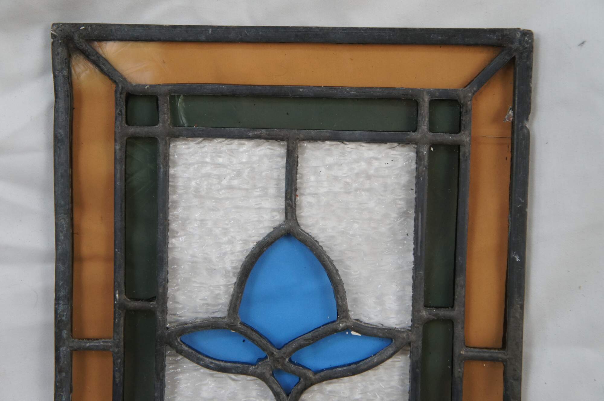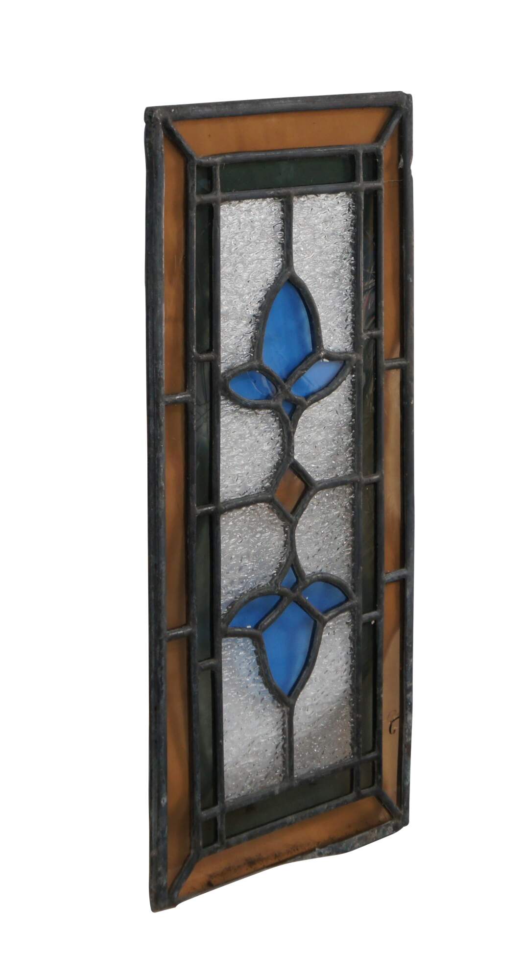 Antique reclaimed leaded stained glass window panel. Features a diamond at the center offset by two blue roses. The window is framed with an amber border outside of a green tinted border.