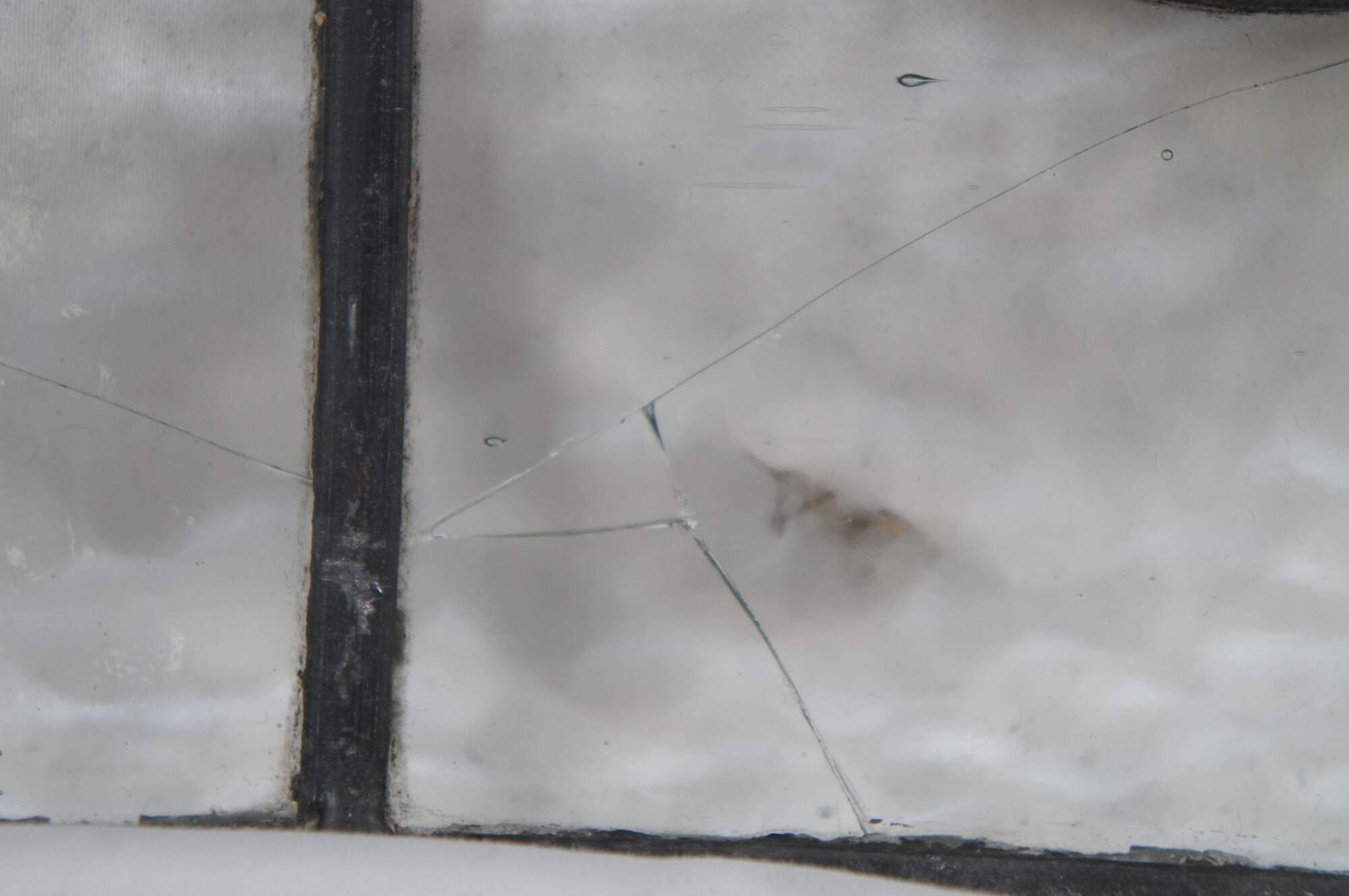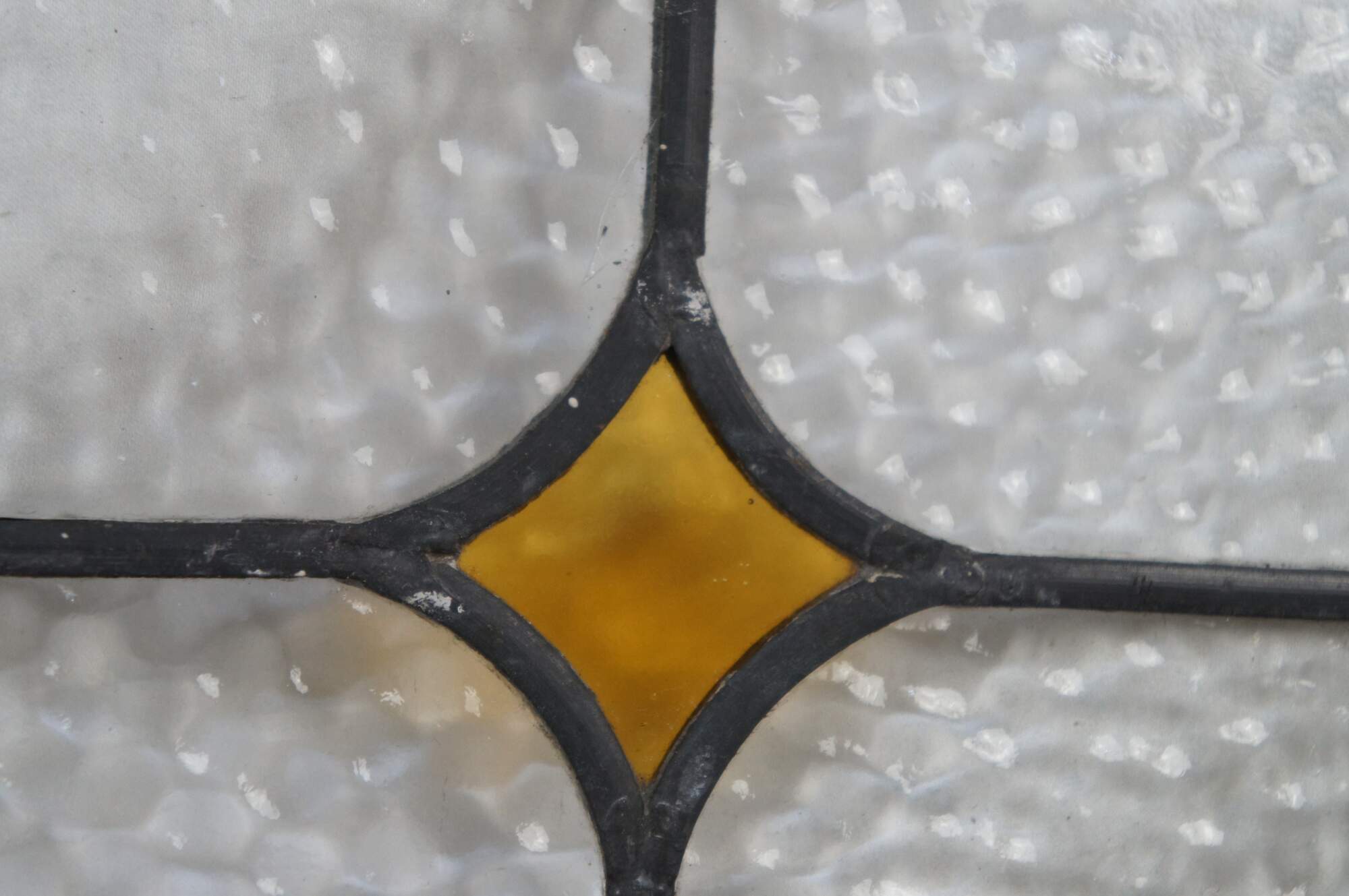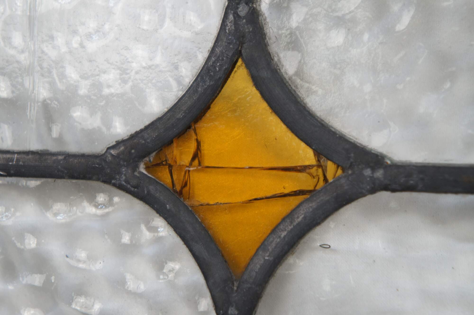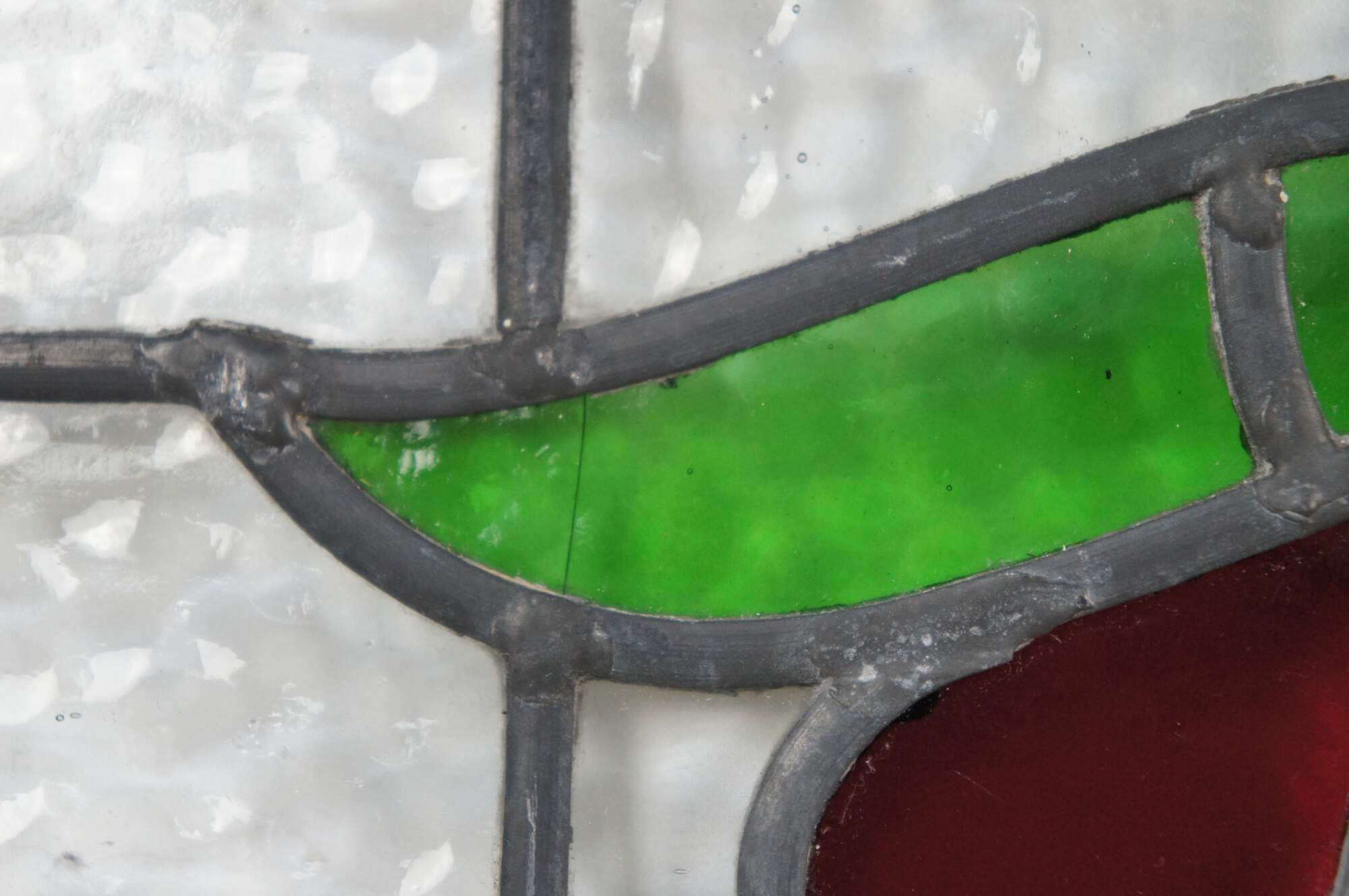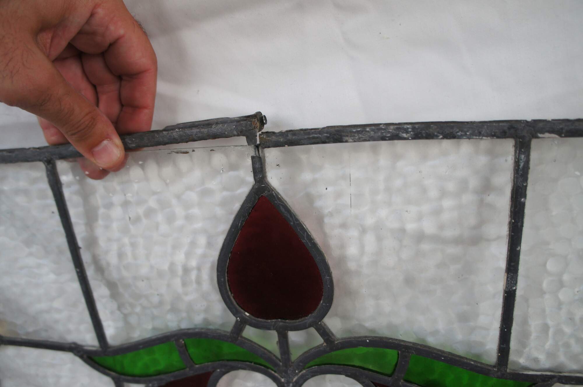 Beautiful antique leaded stained glass Art Nouveau transom window. Features a floral design at the center in a ruby tone with green leaves flanked by amber colored diamonds and a pebbled glass foreground. Perfect for use over a doorway.