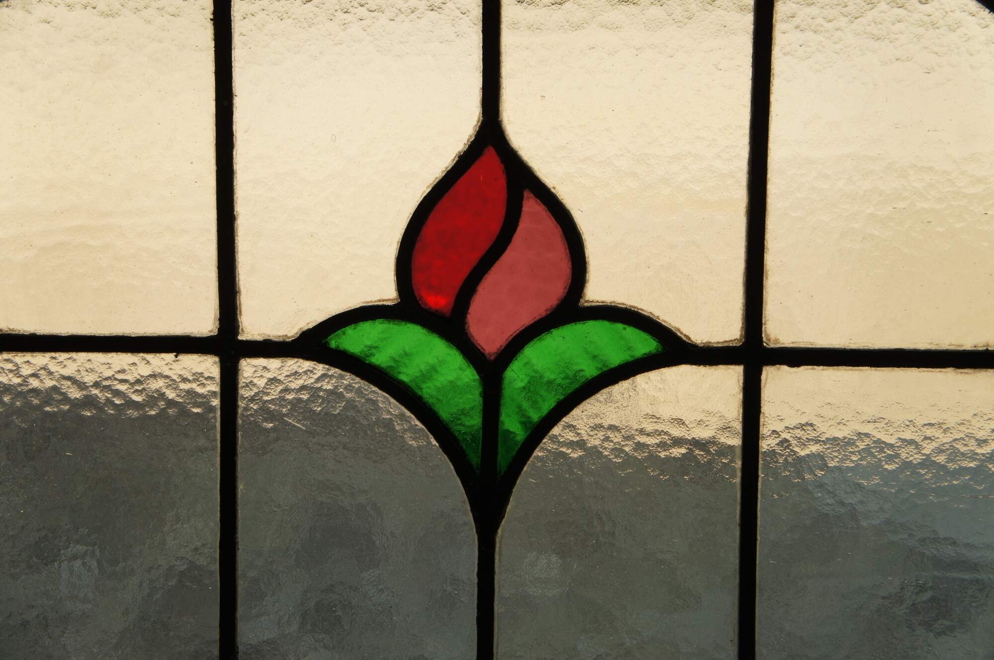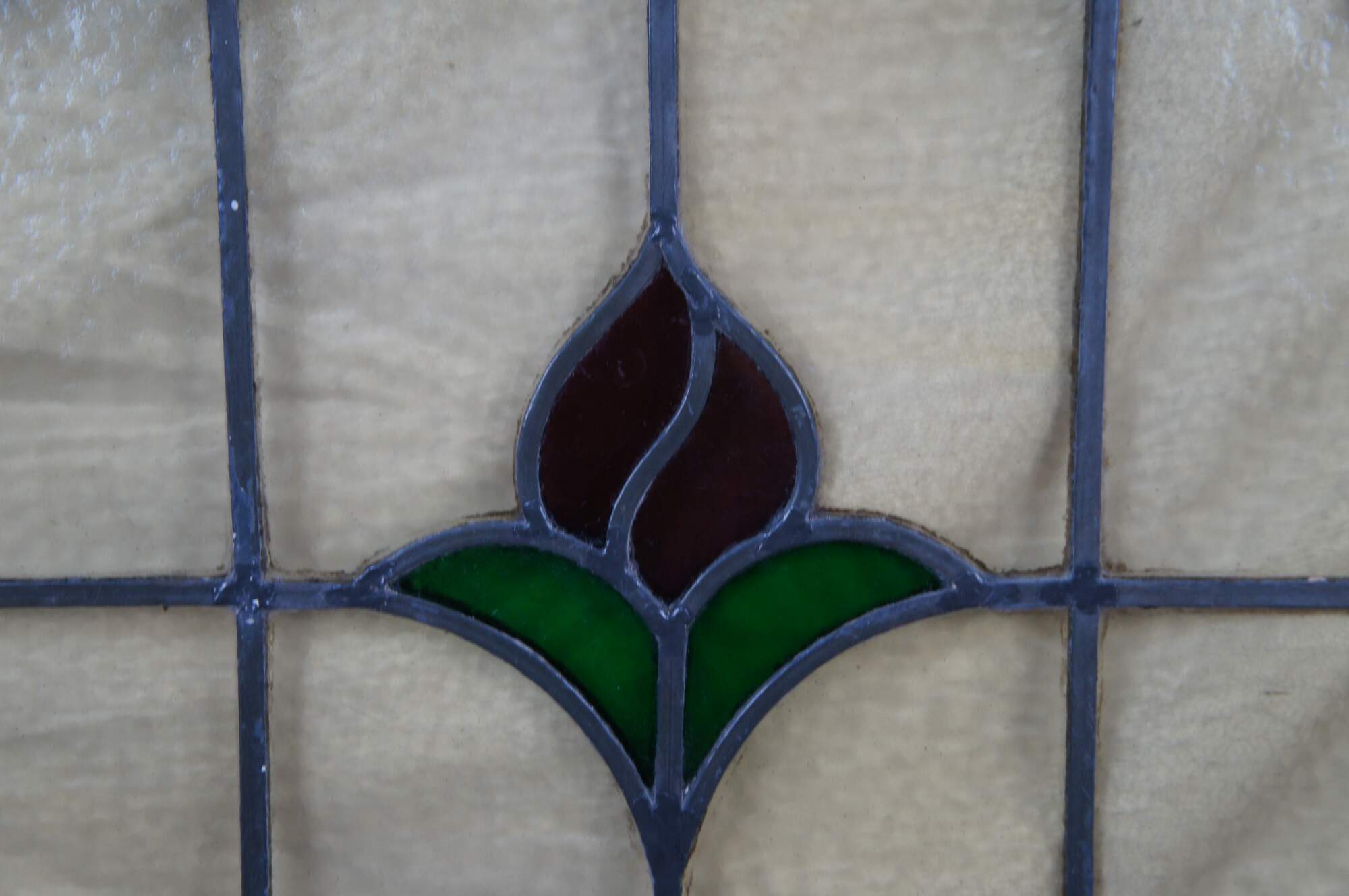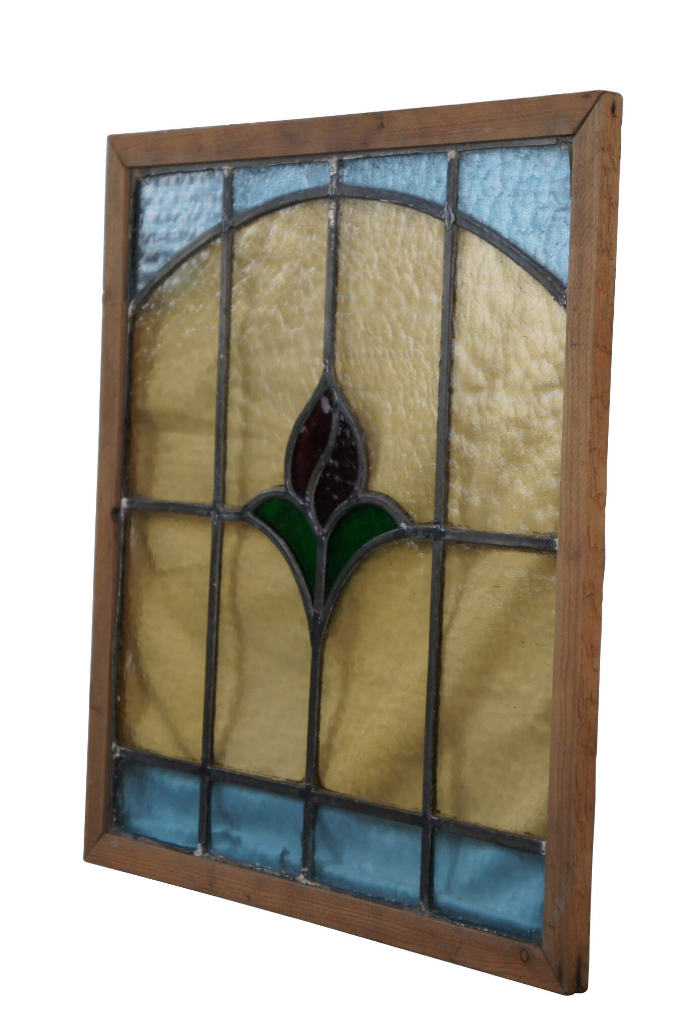 An antique reclaimed leaded stained glass window panel featuring a rose over a lattice background of blue and yellow / gold. Framed in pine.