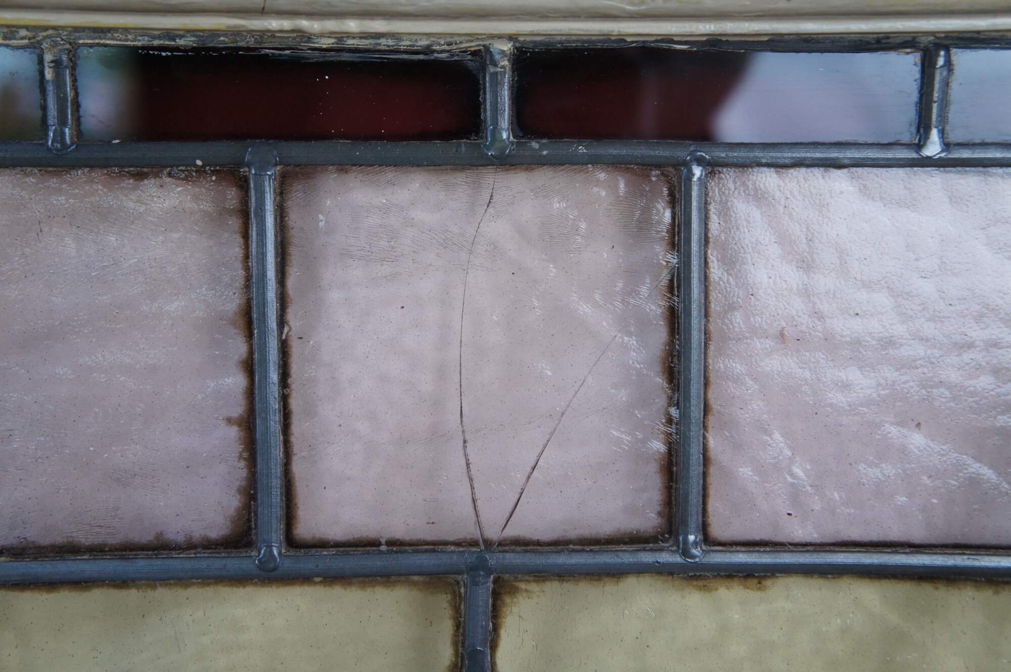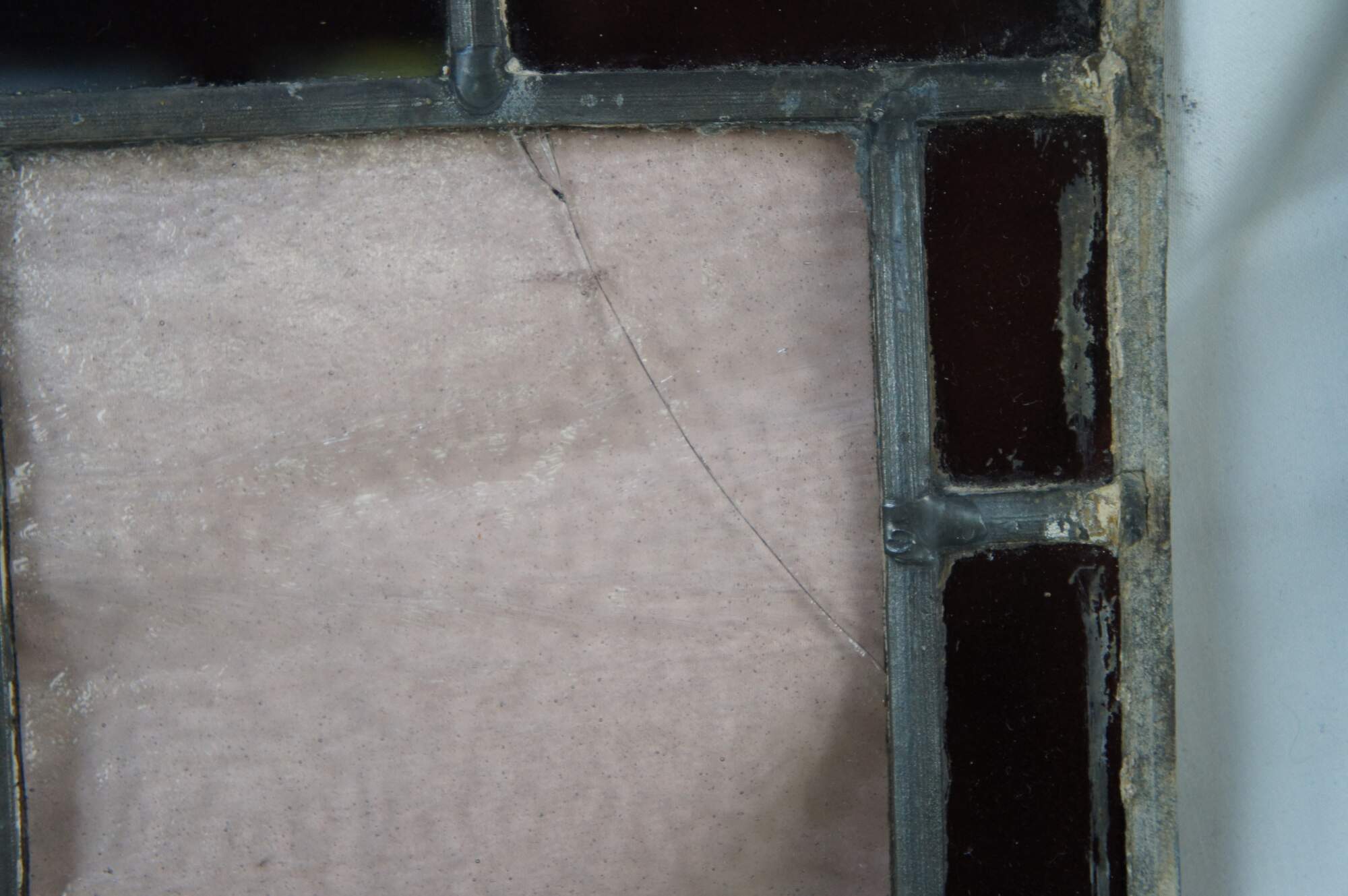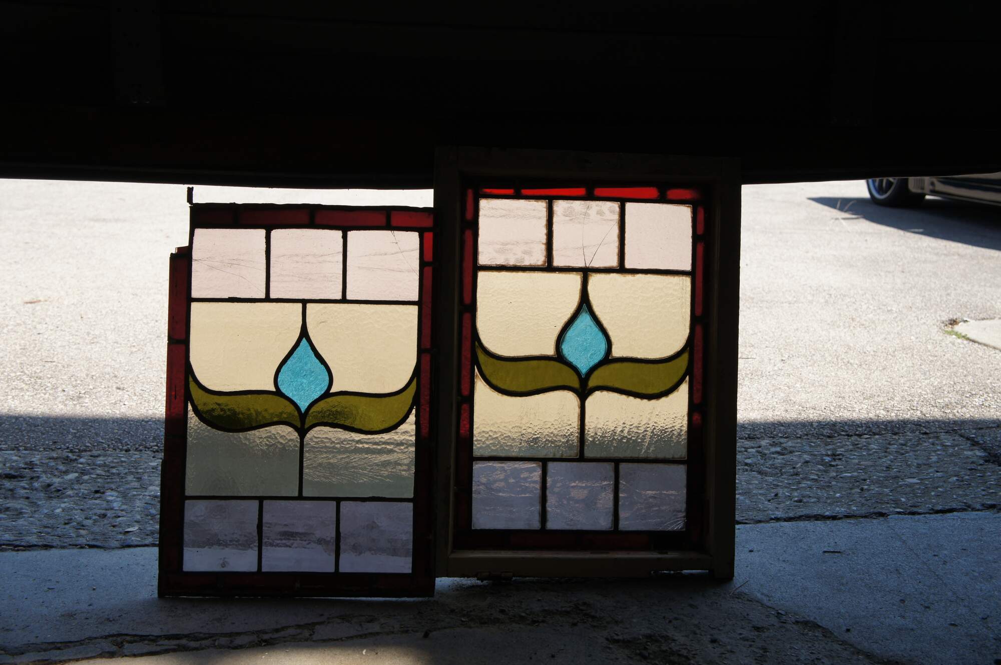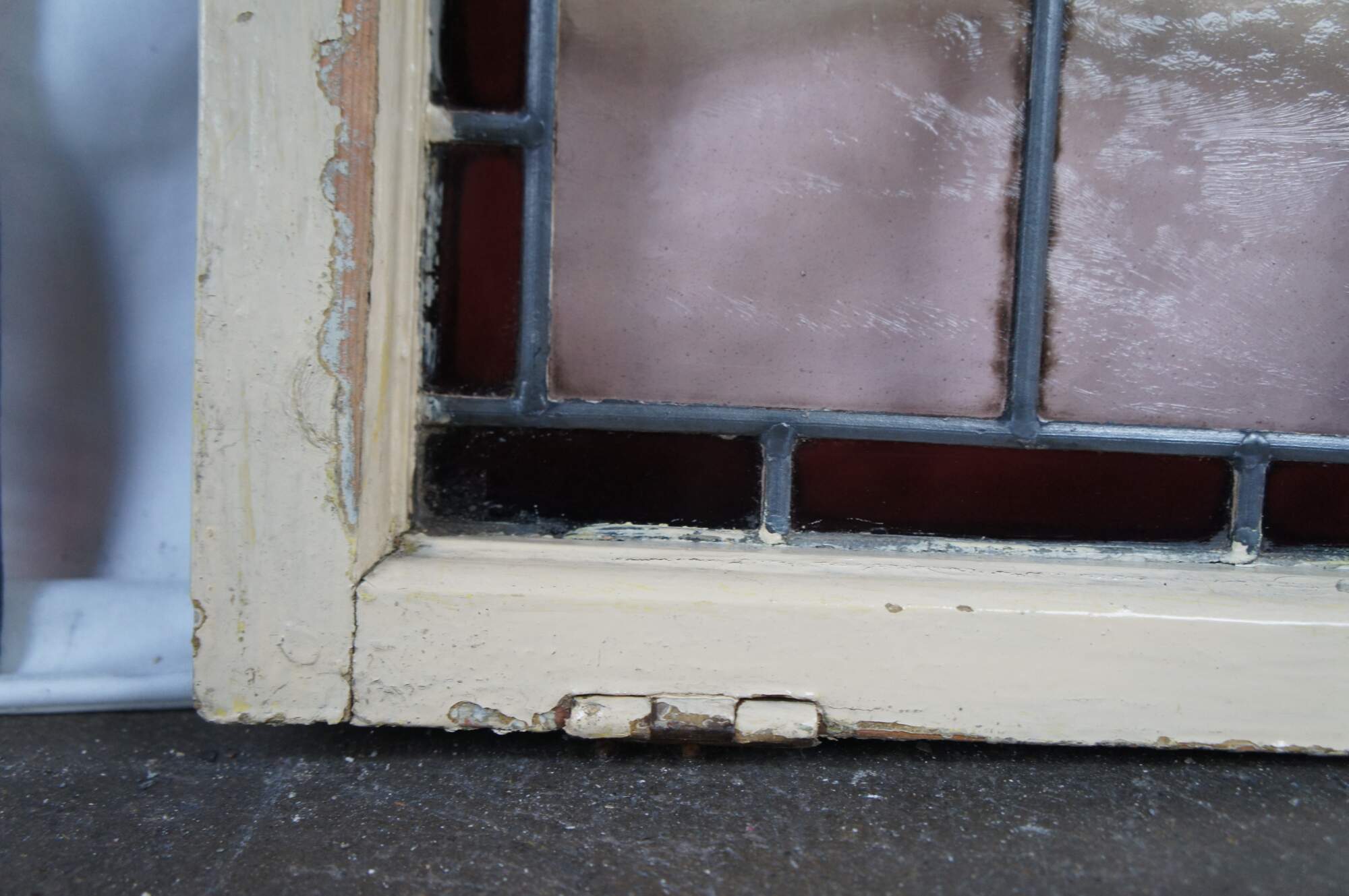 Fair; framed window is in good condition with a few small hairlines in two panels as well as a chip to the wood / piece of missing wood to the frame. Unframed window is missing some stained glass sa well as several hairlines and a missing piece of leaded frame