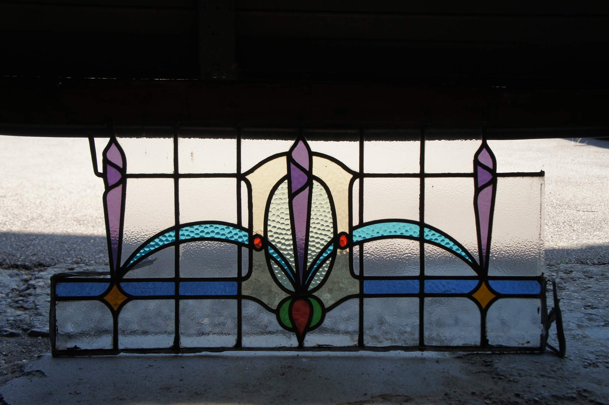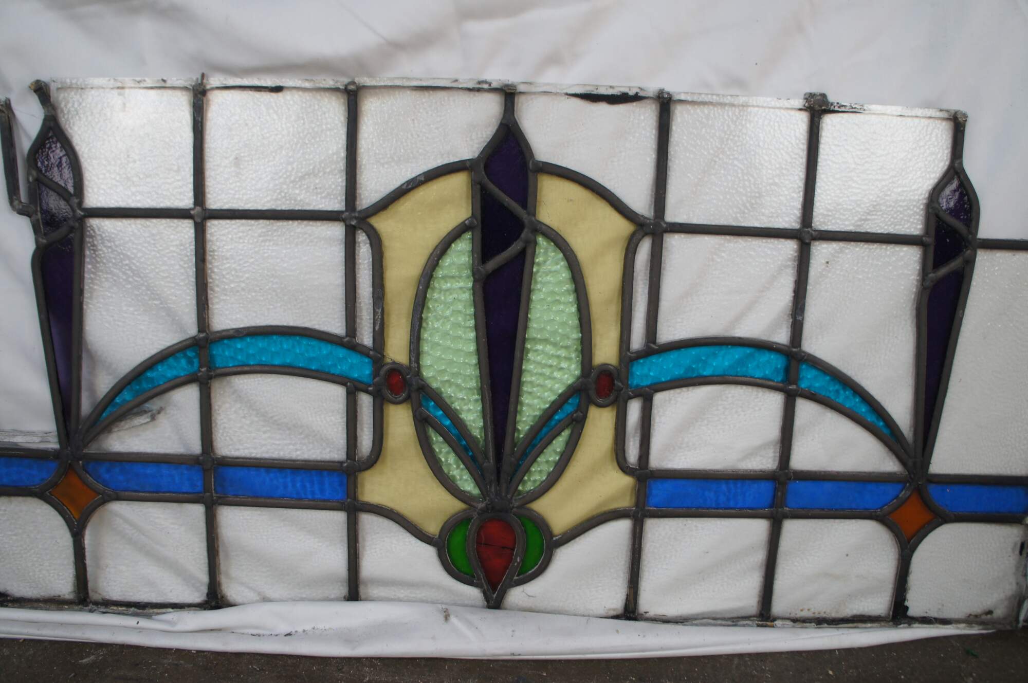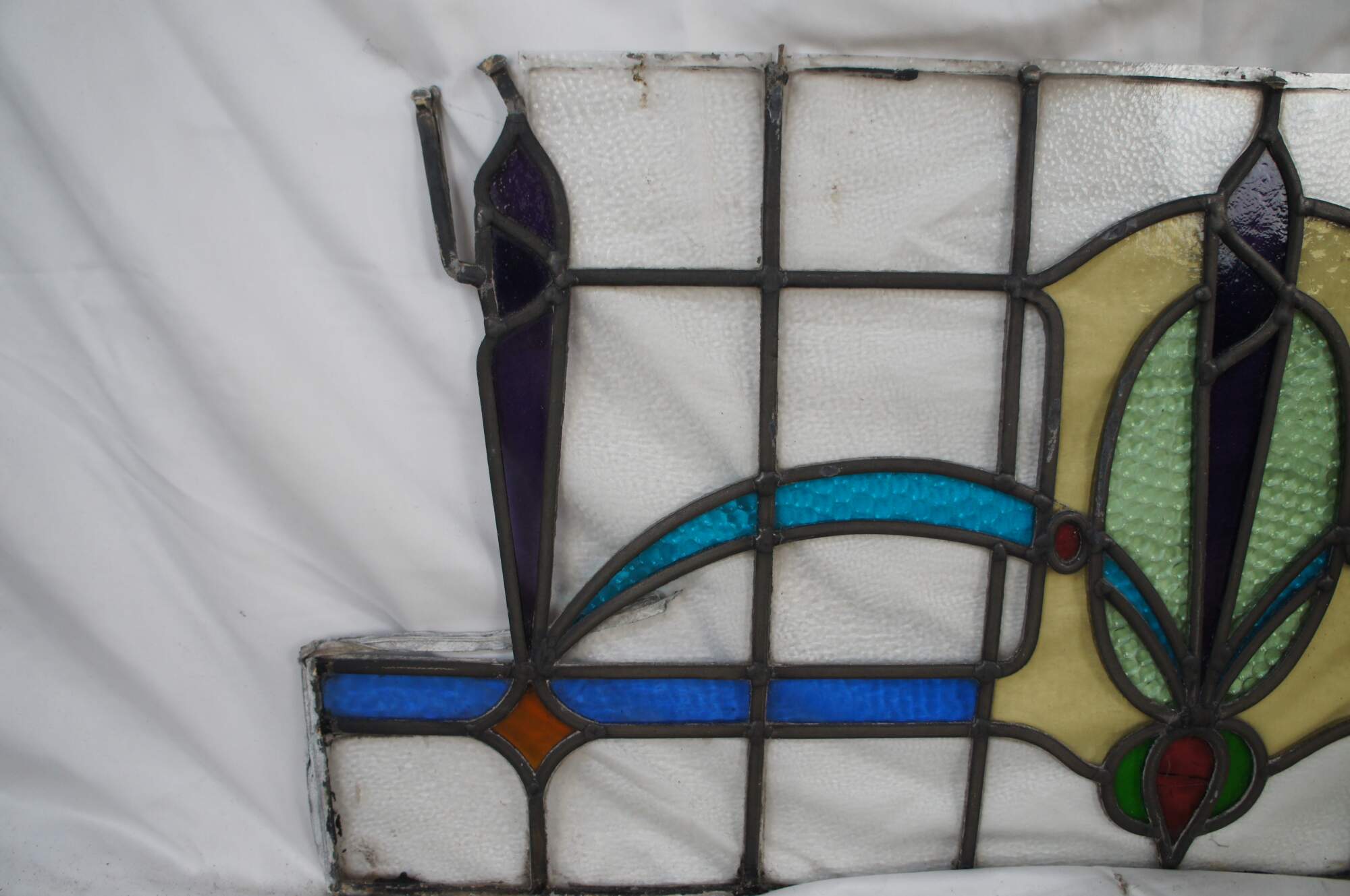 Lovely Antique Art Nouveau leaded stained glass window transom. Features a beautiful tassel and swag motif with vibrant purple, blue, amber, red green and gold. A great candidate for restoration.