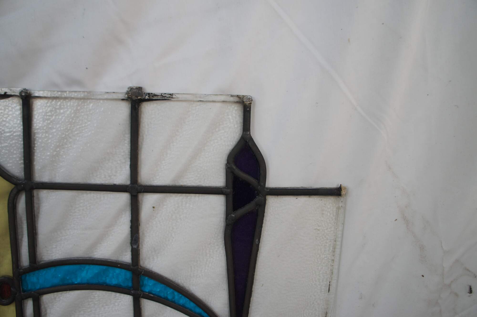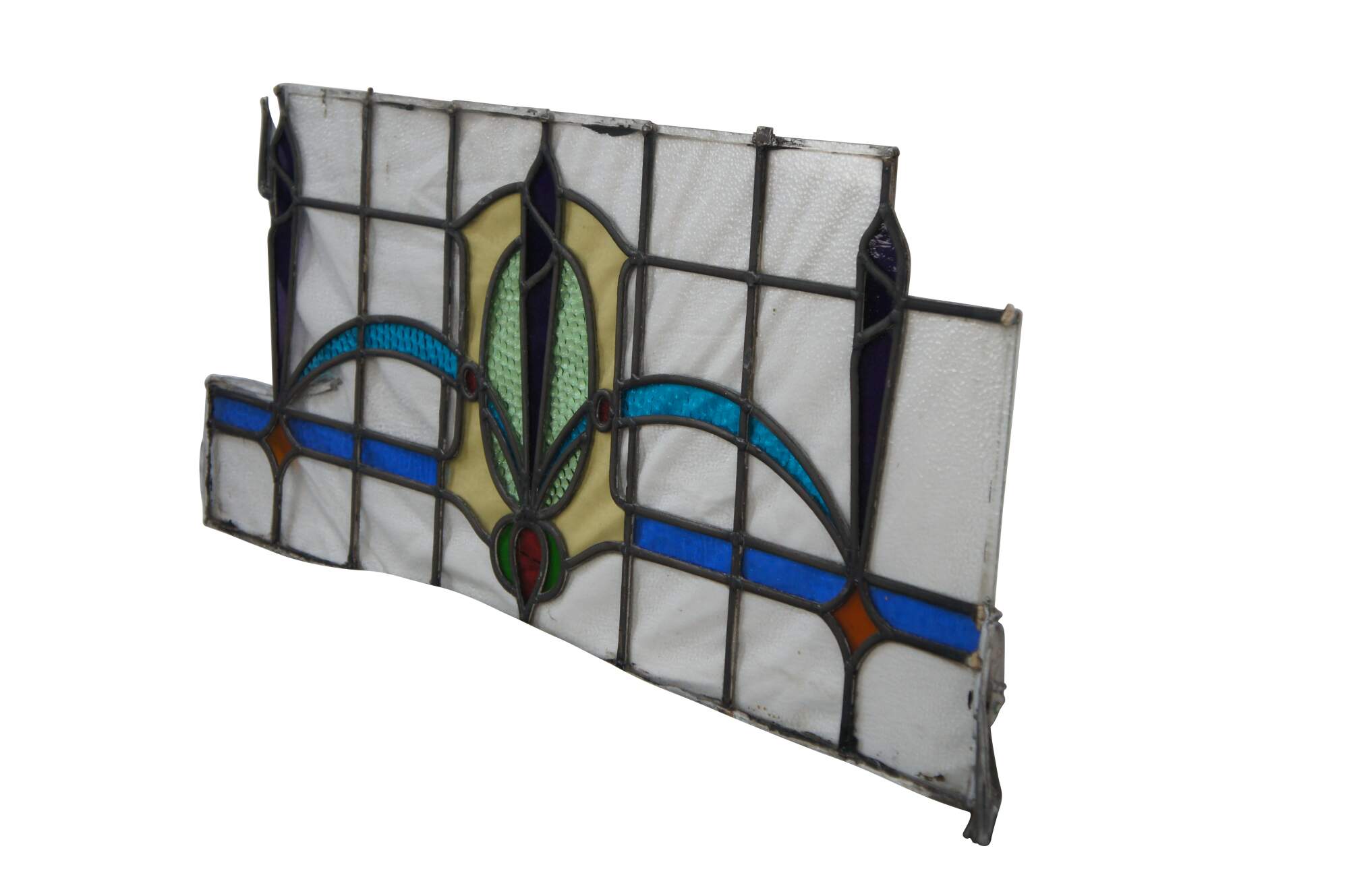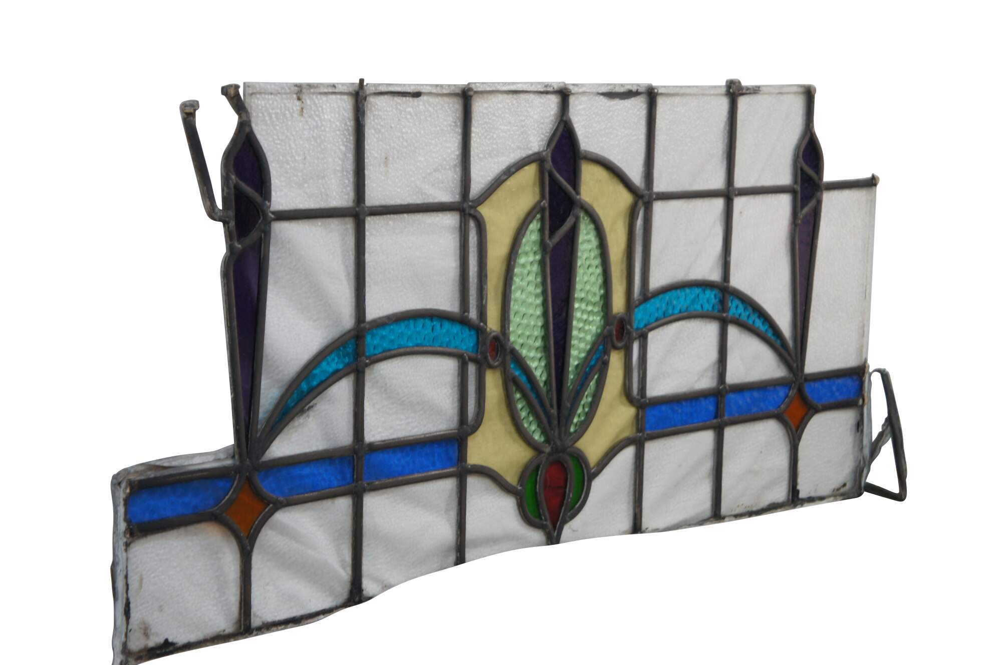 Lovely Antique Art Nouveau leaded stained glass window transom. Features a beautiful tassel and swag motif with vibrant purple, blue, amber, red green and gold. A great candidate for restoration.