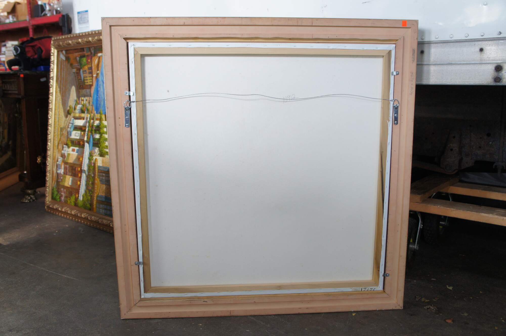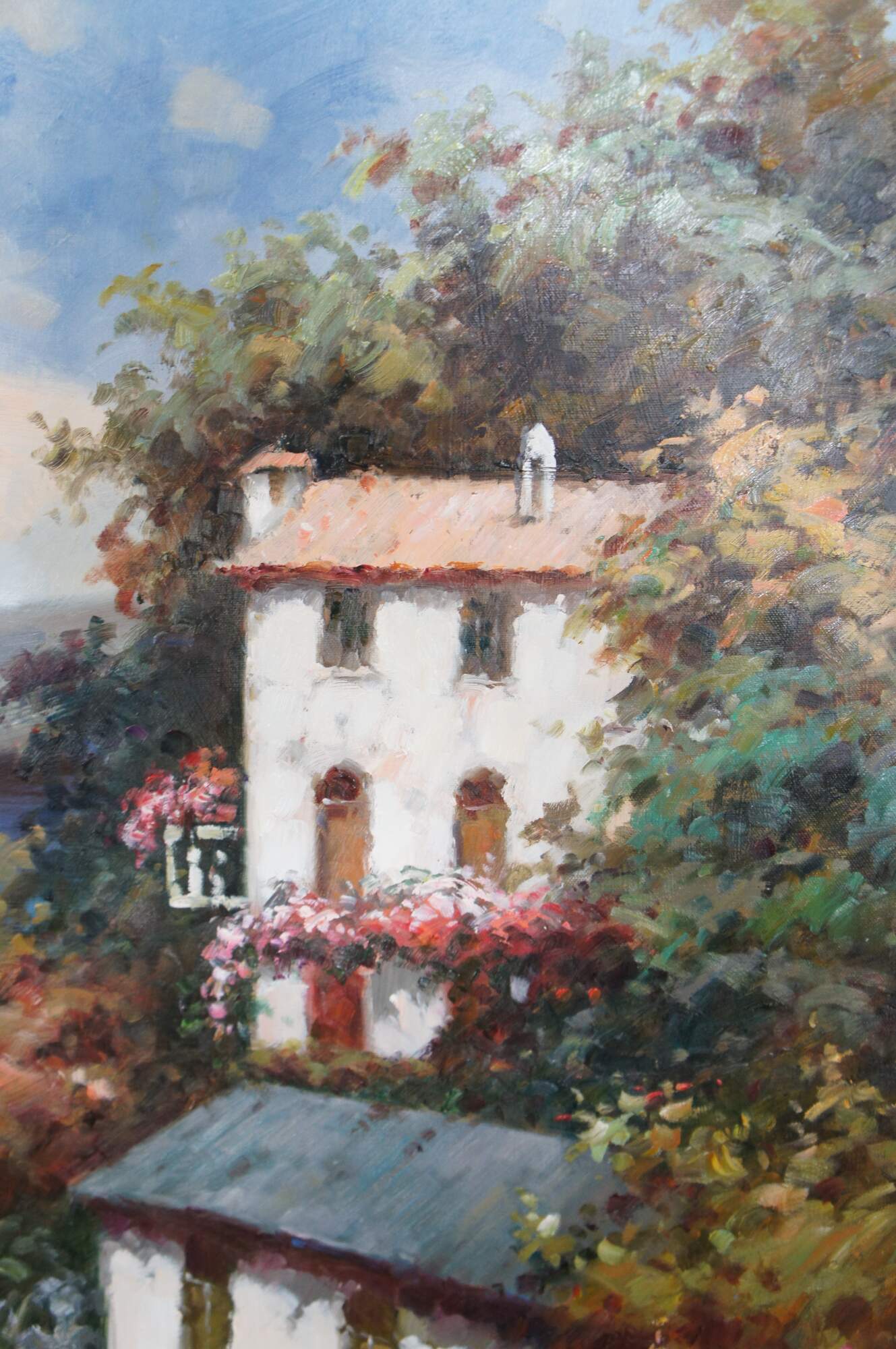 A large impressionist seascape or harbor view in Tuscany. Signed Shirley, cira late 20th century. The oil painting is on canvas and features a view down the hillside on a crisp afternoon with floral sprays amidst houses with a view towards the water. The painting is framed in with with gold finish and foliate relief.
