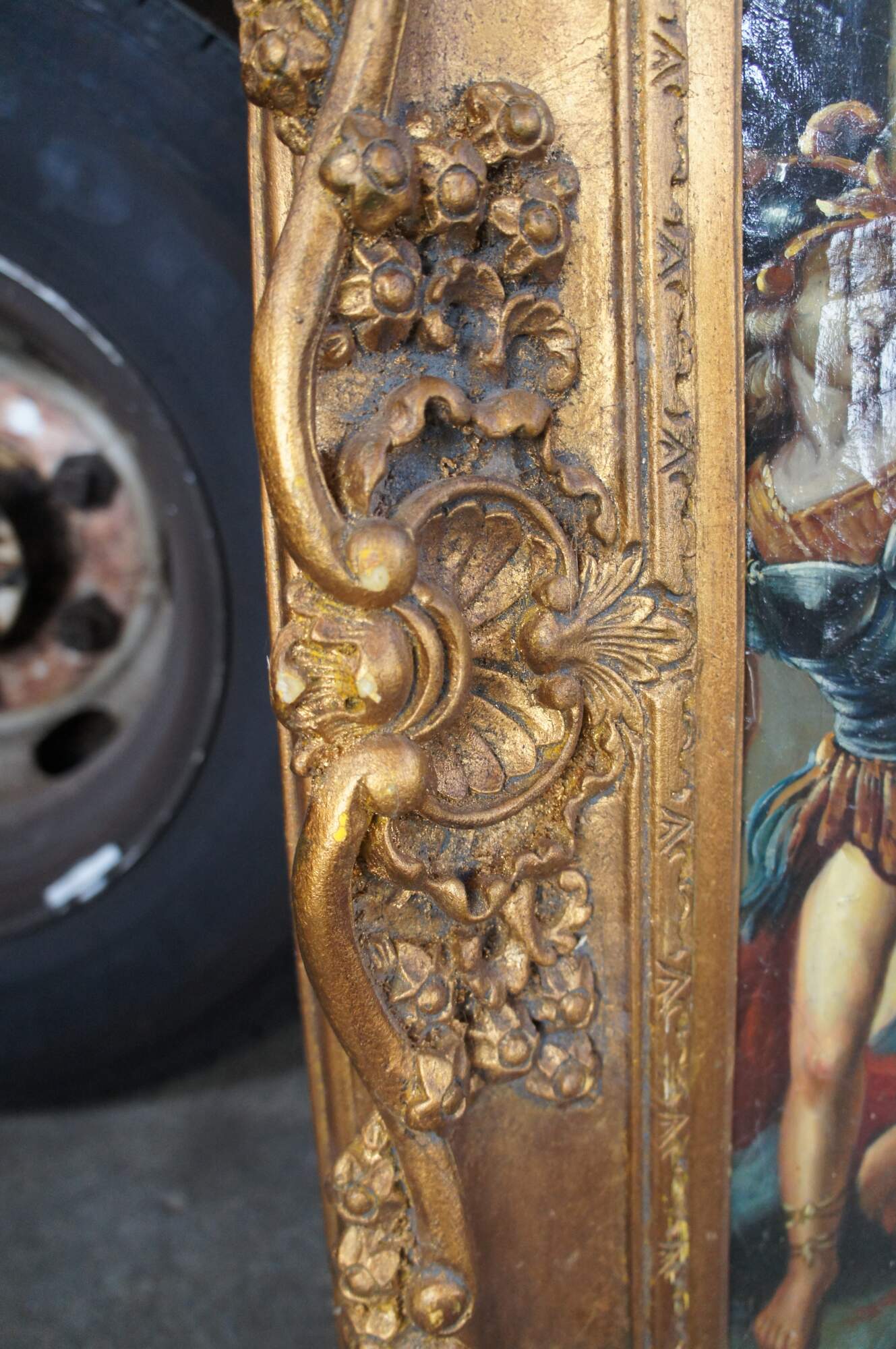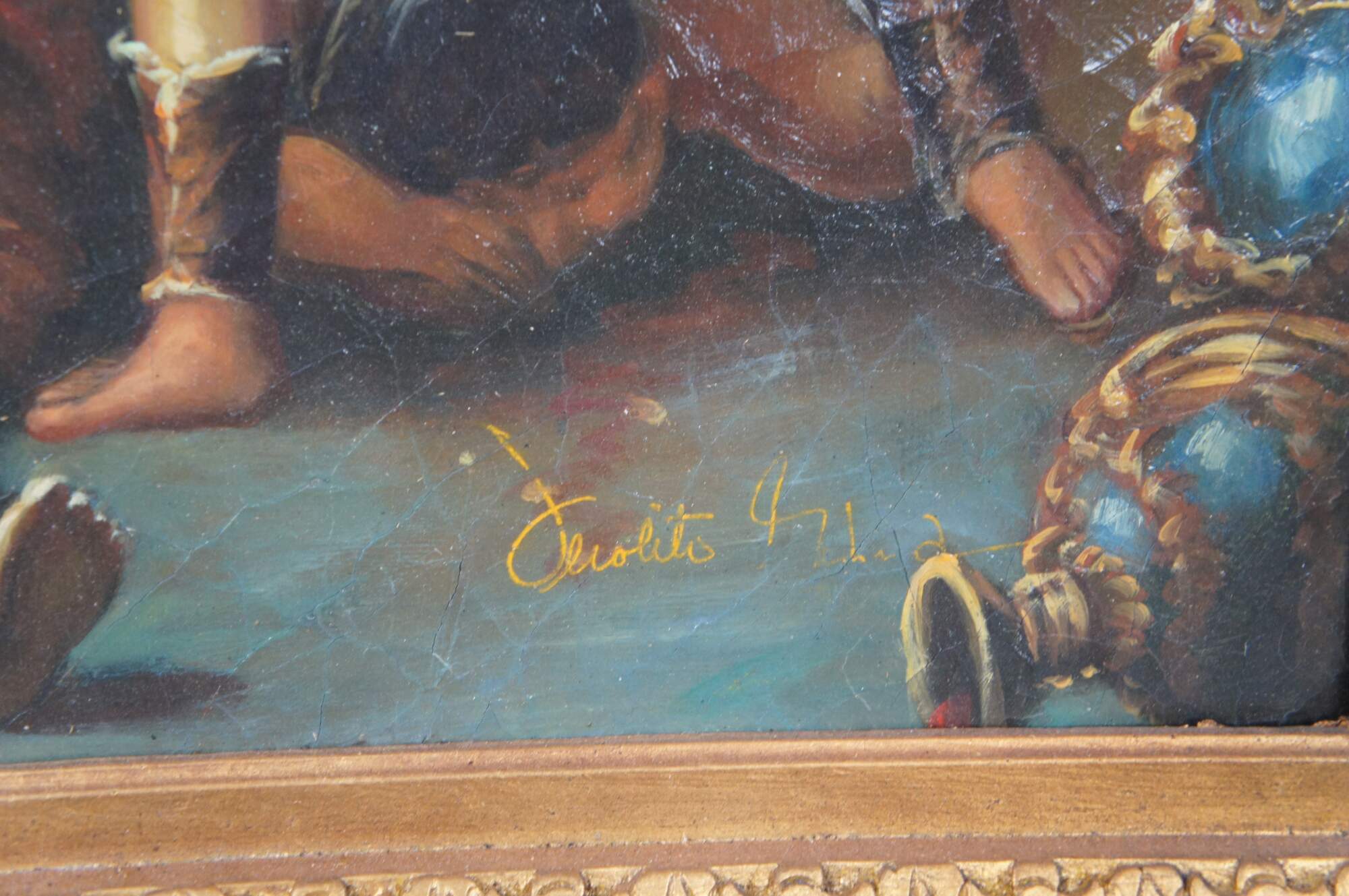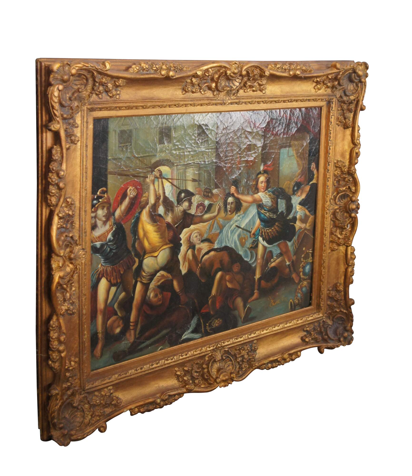 Perseus Turning Phineus and his followers to Stone, After Luca Giordano's famous painting that is in the National Gallery, London. The original mythological masterpiece was painted in the late 17th century. In the painting Perseus is shown holding the head of Medusa, which turns "Phineus and his followers to stone". He cannot look for obvious reasons. The oil is on canvas with natural craquelure to give the canvas an aged look. Singed to the lower right. Signature Illegible, circa last quarter 20th century. Framed in Baroque manner with ornate scalloping.