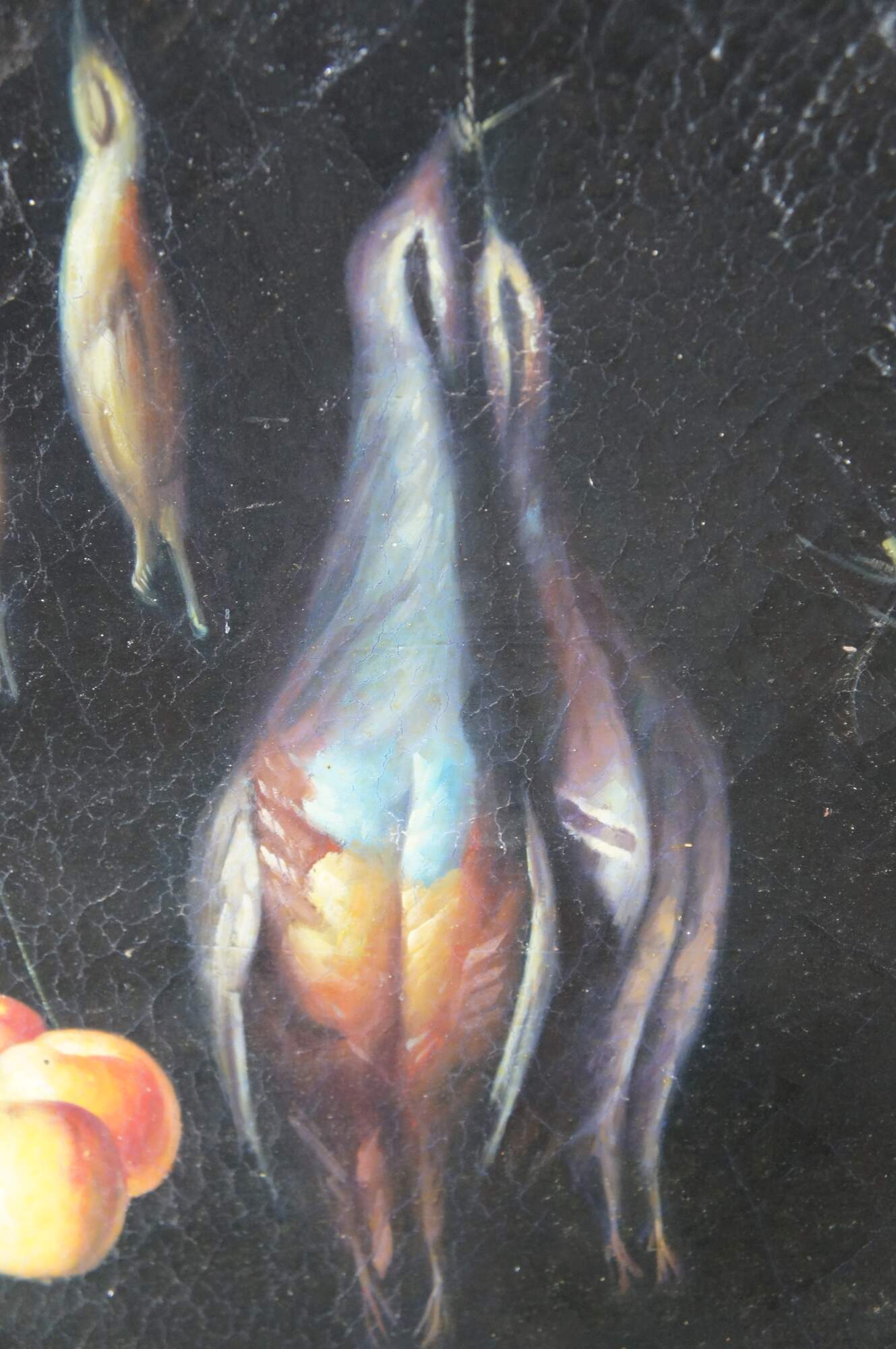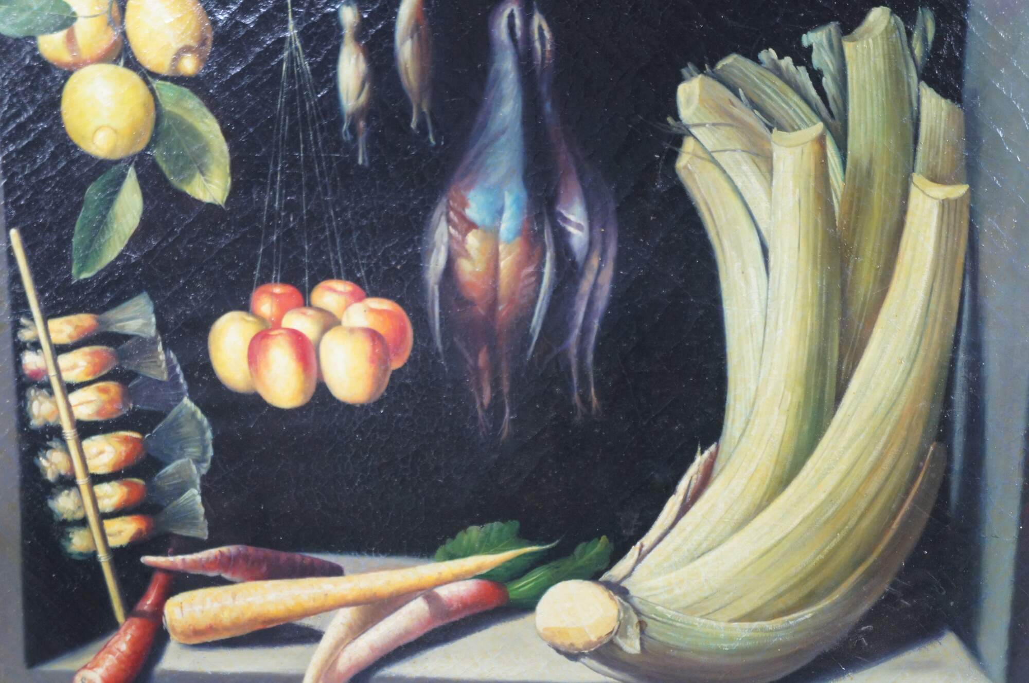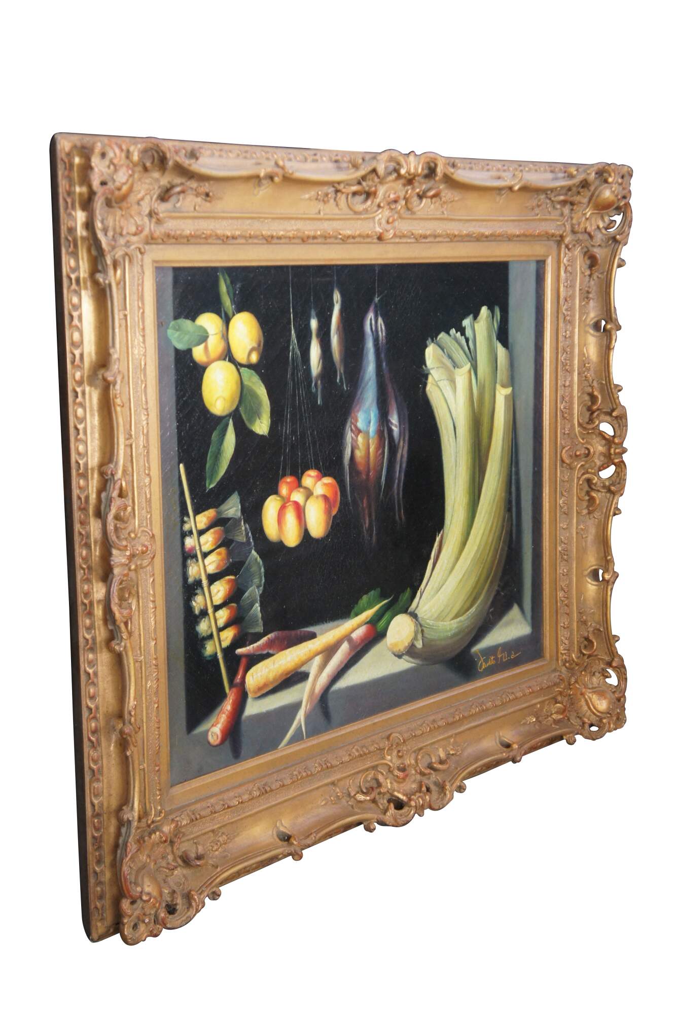 Late 20th century still life featuring watefowl, fruit and vegetables. An oil on craquelure canvas. Ornately framed in Baroque manner