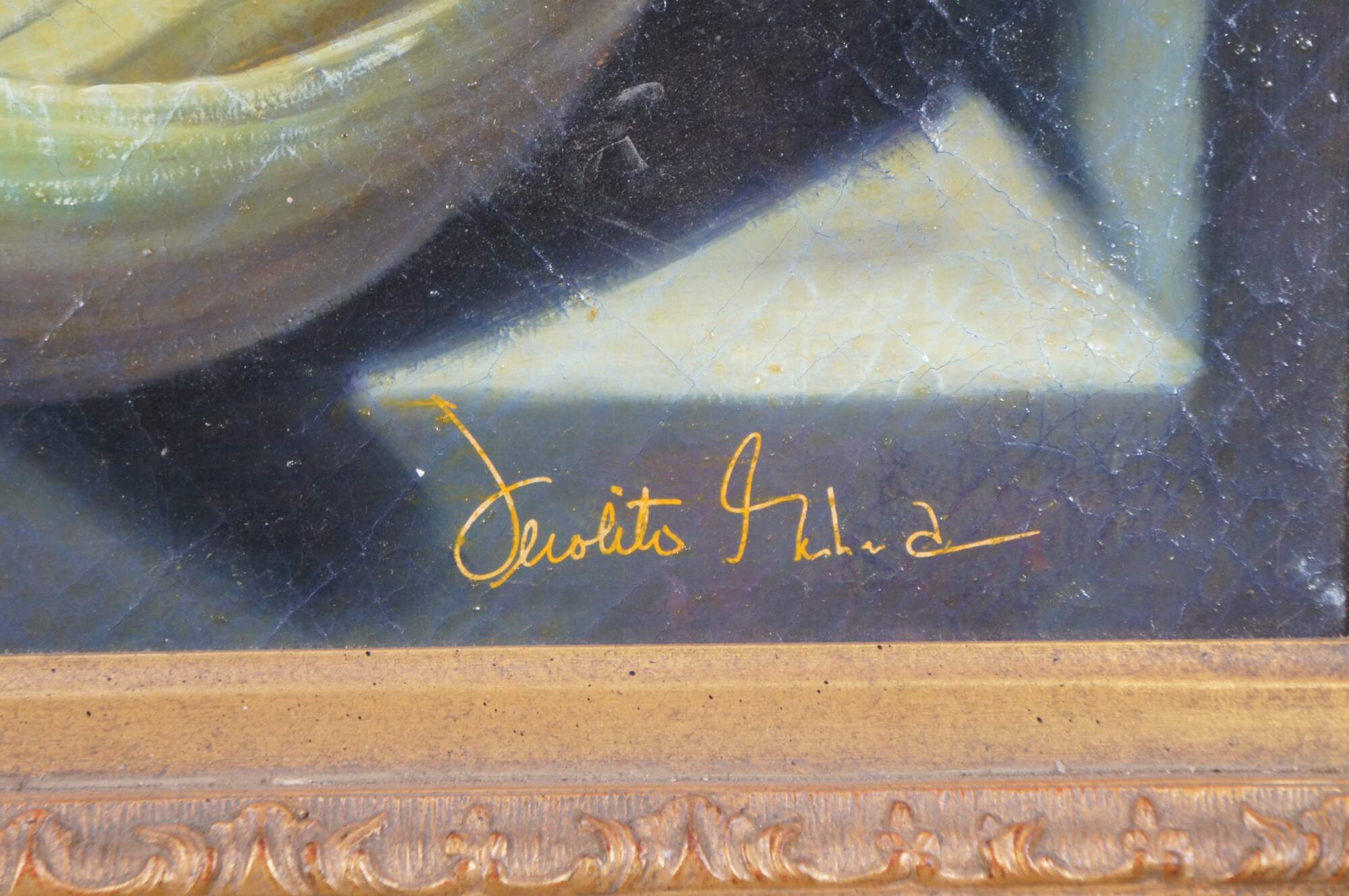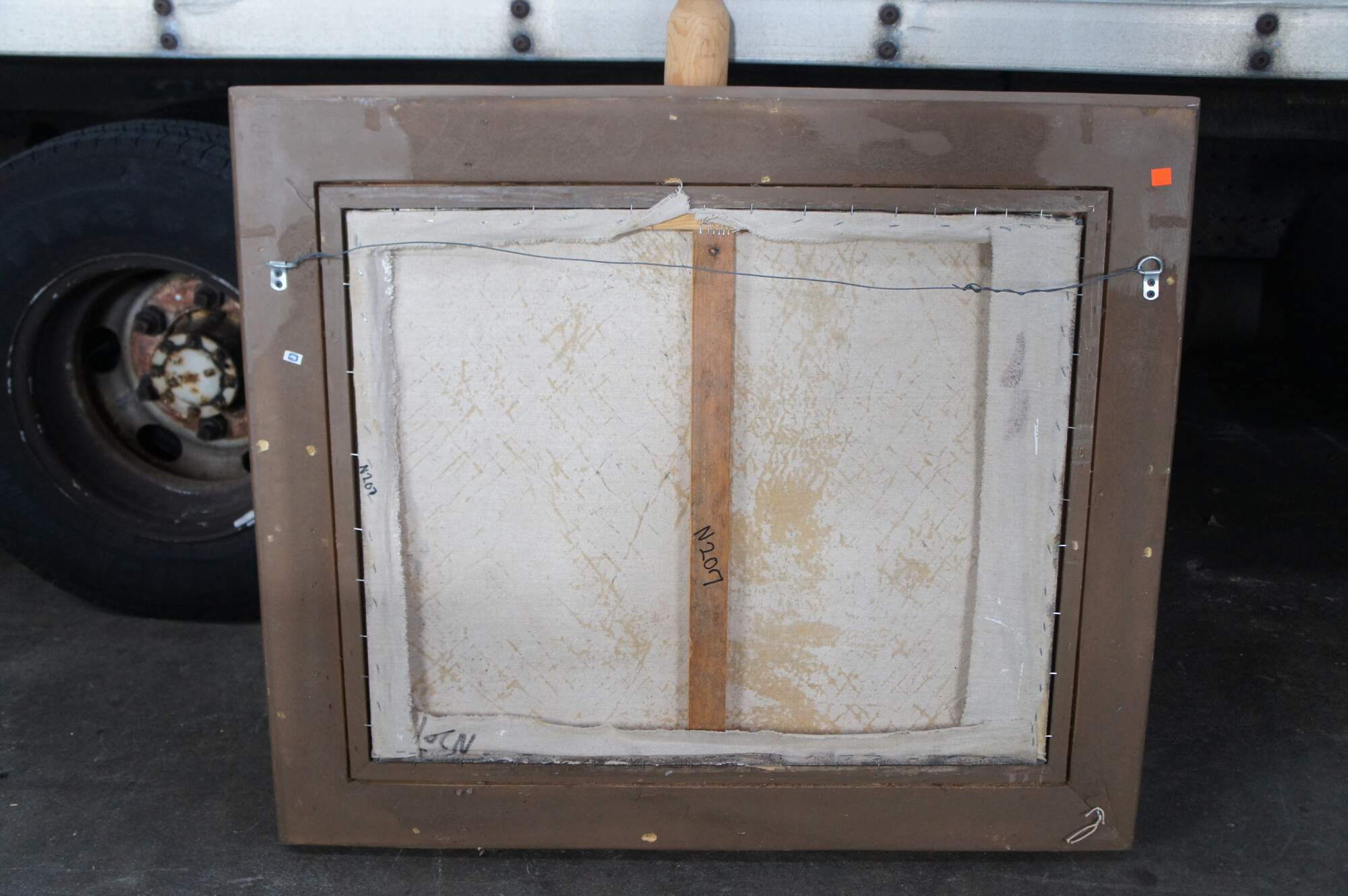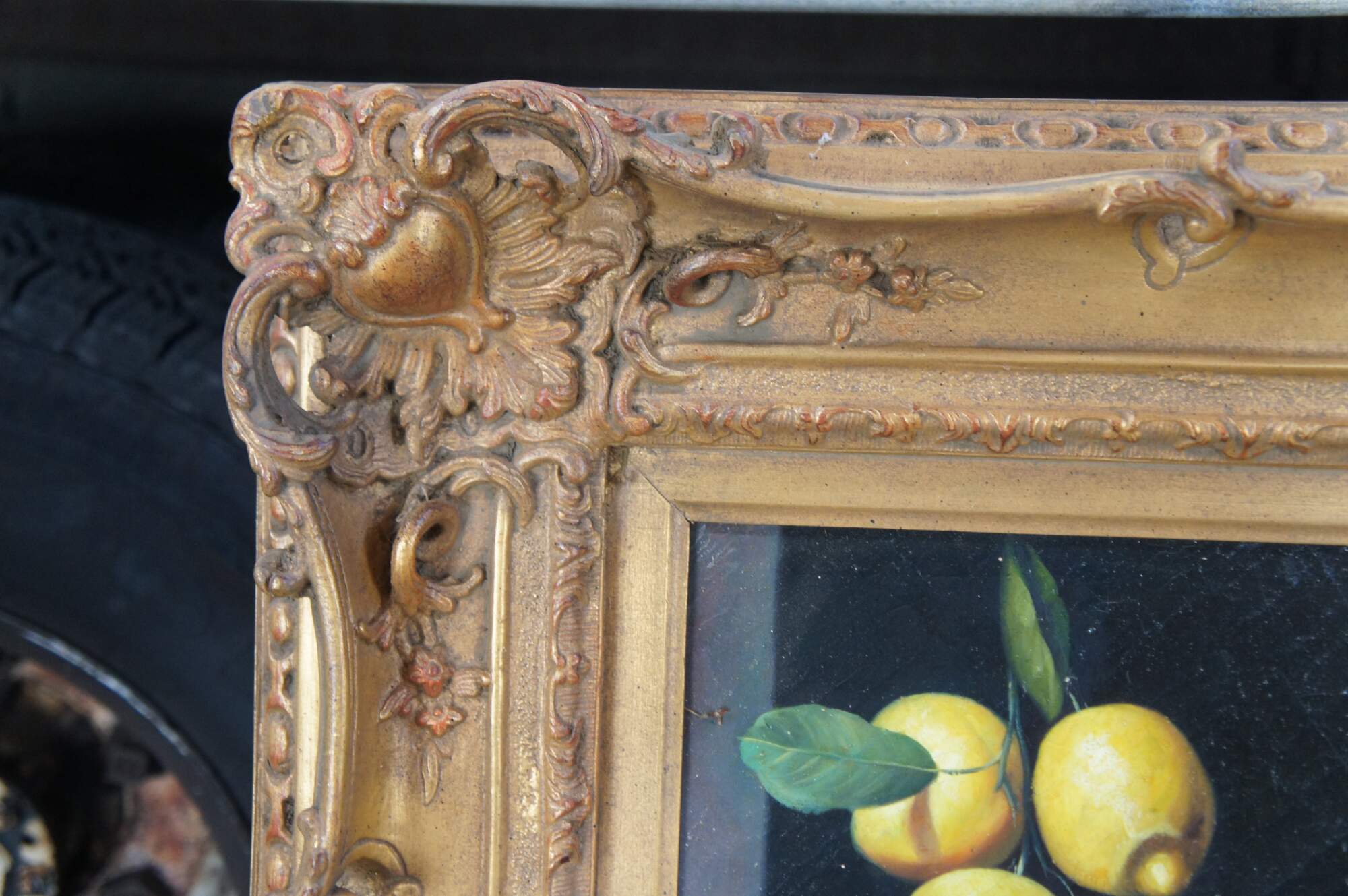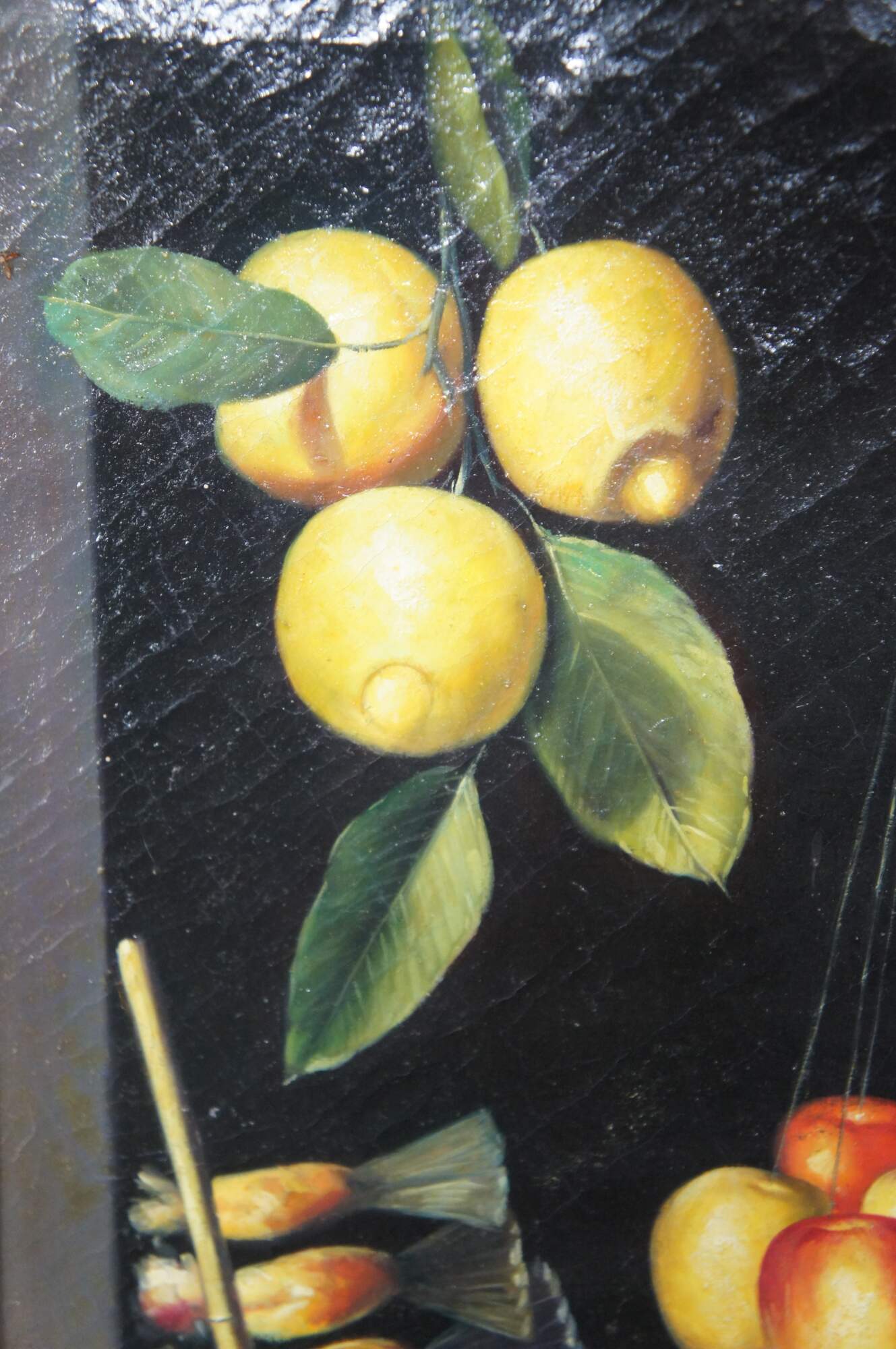 Late 20th century still life featuring watefowl, fruit and vegetables. An oil on craquelure canvas. Ornately framed in Baroque manner
