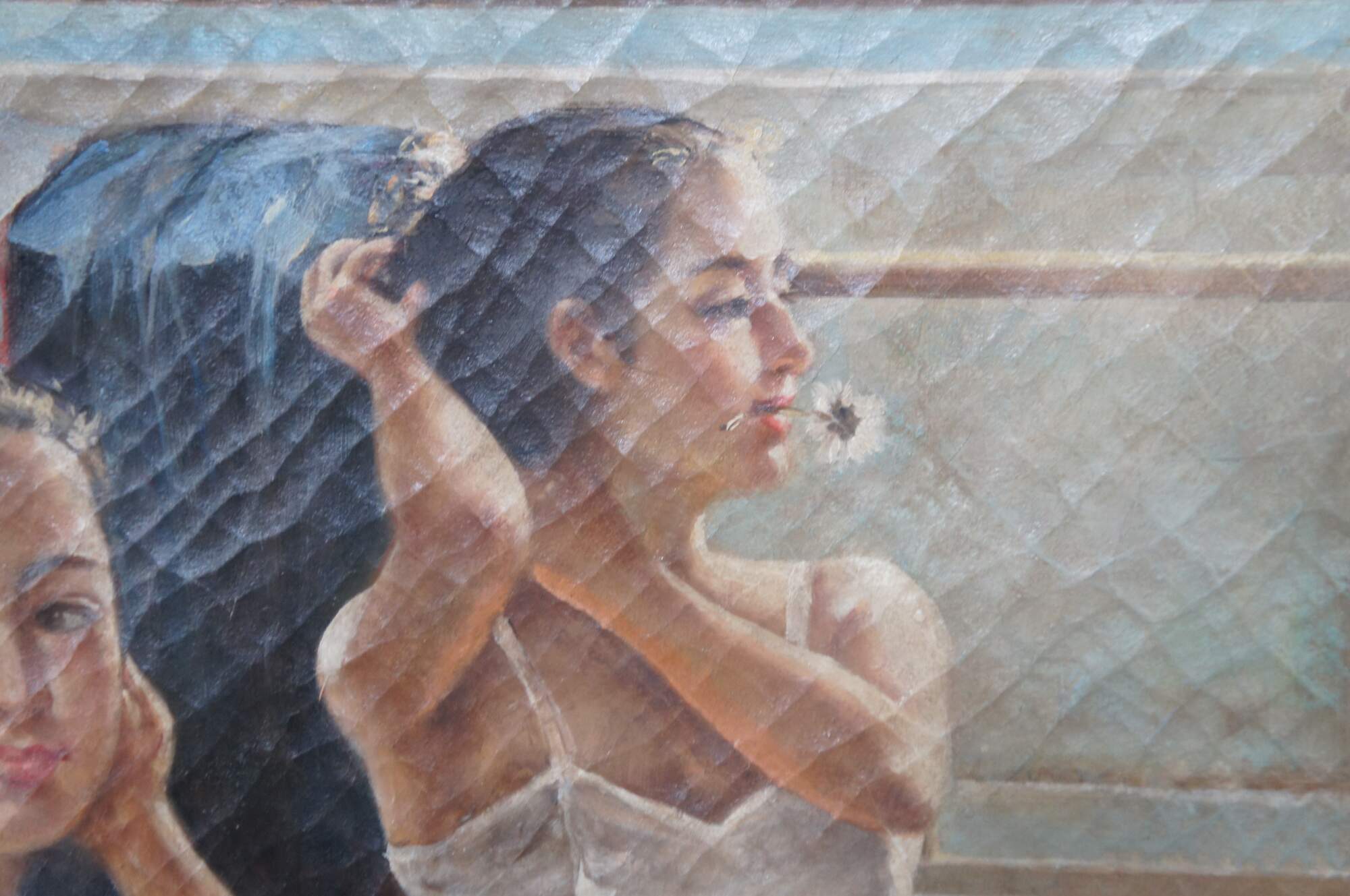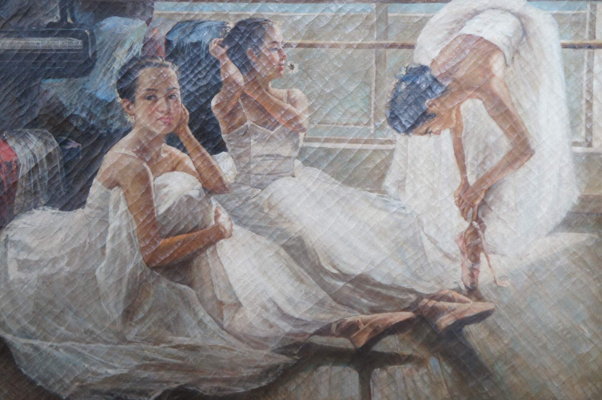 A large Impressionist oil painting of three ballerinas in the studio by Guan Zeju, circa, late 20th century. The beautiful painting depicts one facing ballerina facing the artist, another fixing her hair with daisy in mouth and the other lacing her pointe shoes. Framed in French manner with gold finish. Canvas is unsigned