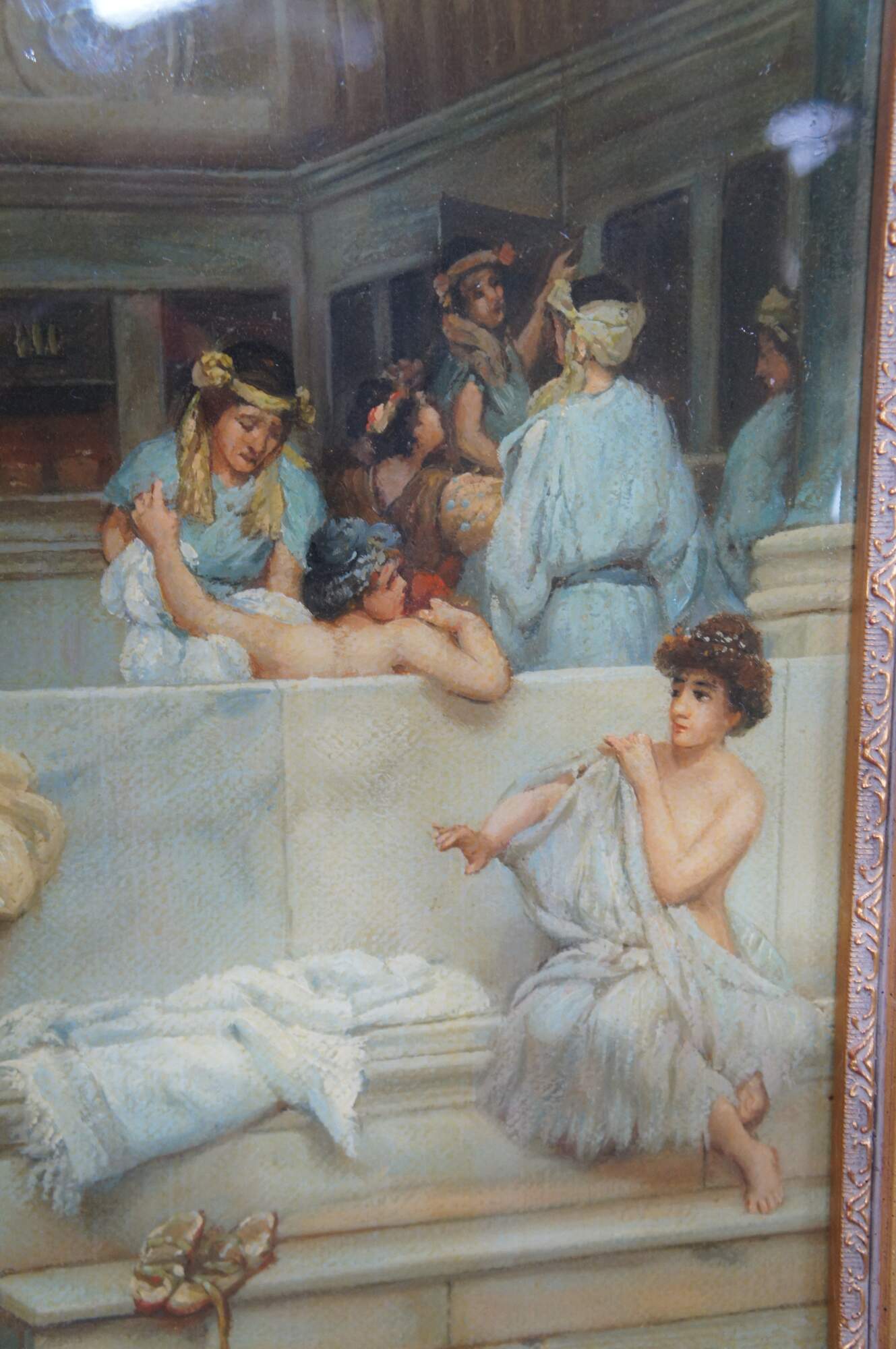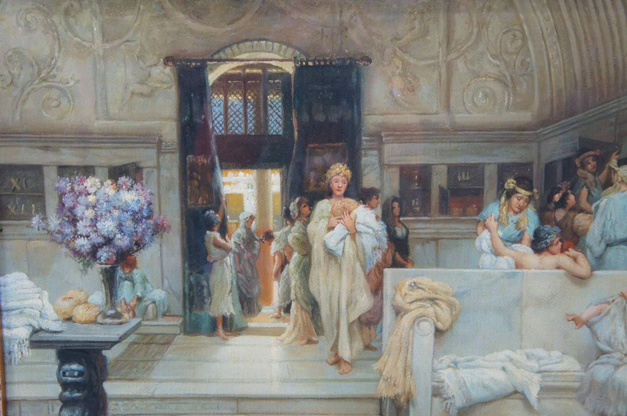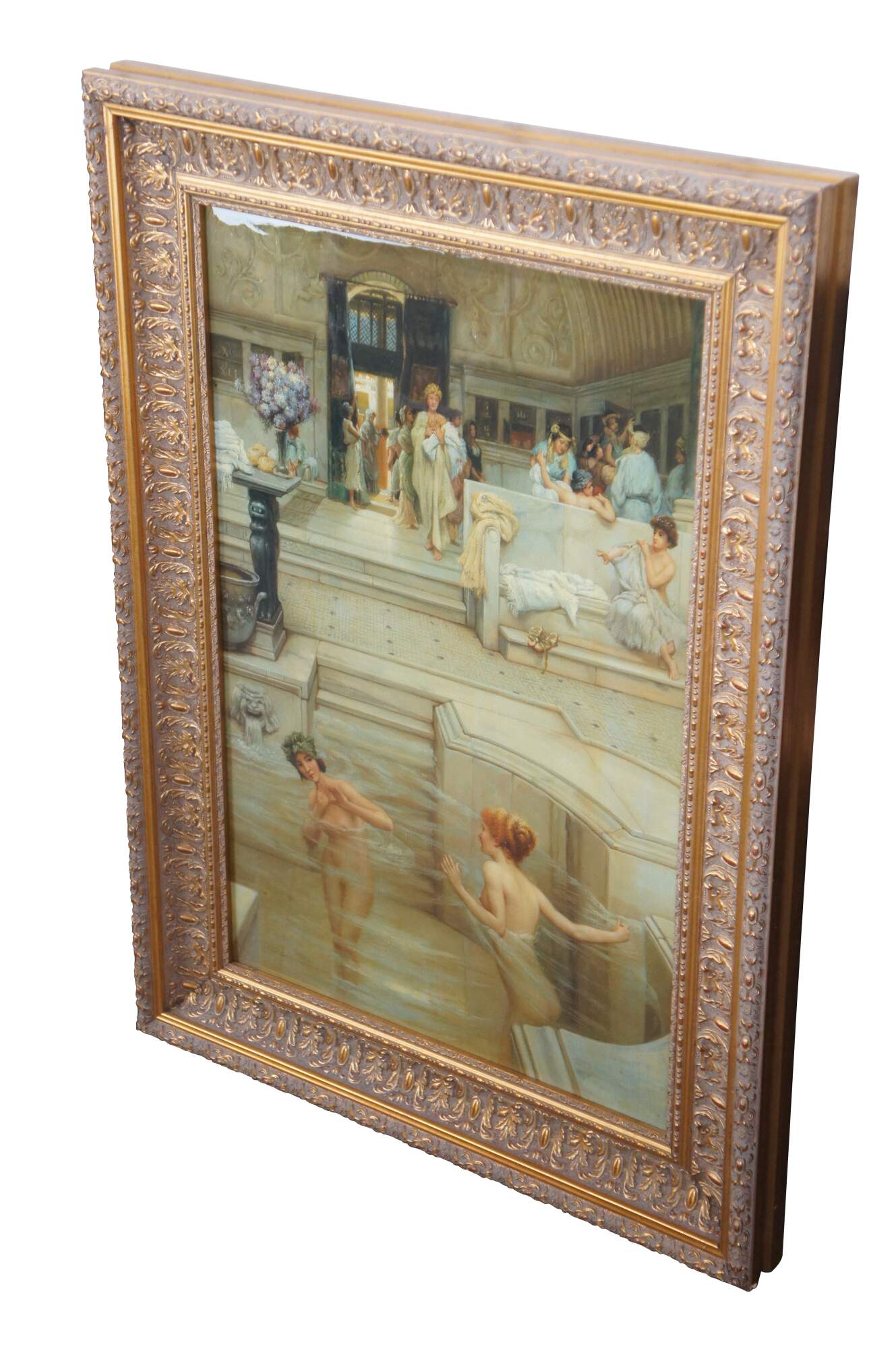 Victorian Classicism on full display in "Favourite Custom" after Sir Lawrence Alma-Tadema. The original is on display in the Tate Museum in Britain and was completed in 1909. The painting features a Ladies Bath house in Pompeii. Elegantly shown with charming characture and intricate detail. This example was painted at the end of the 20th century and has a resin finish to give a glossy appearance. The piece is framed in wood with a Neoclassical design and gold finish.