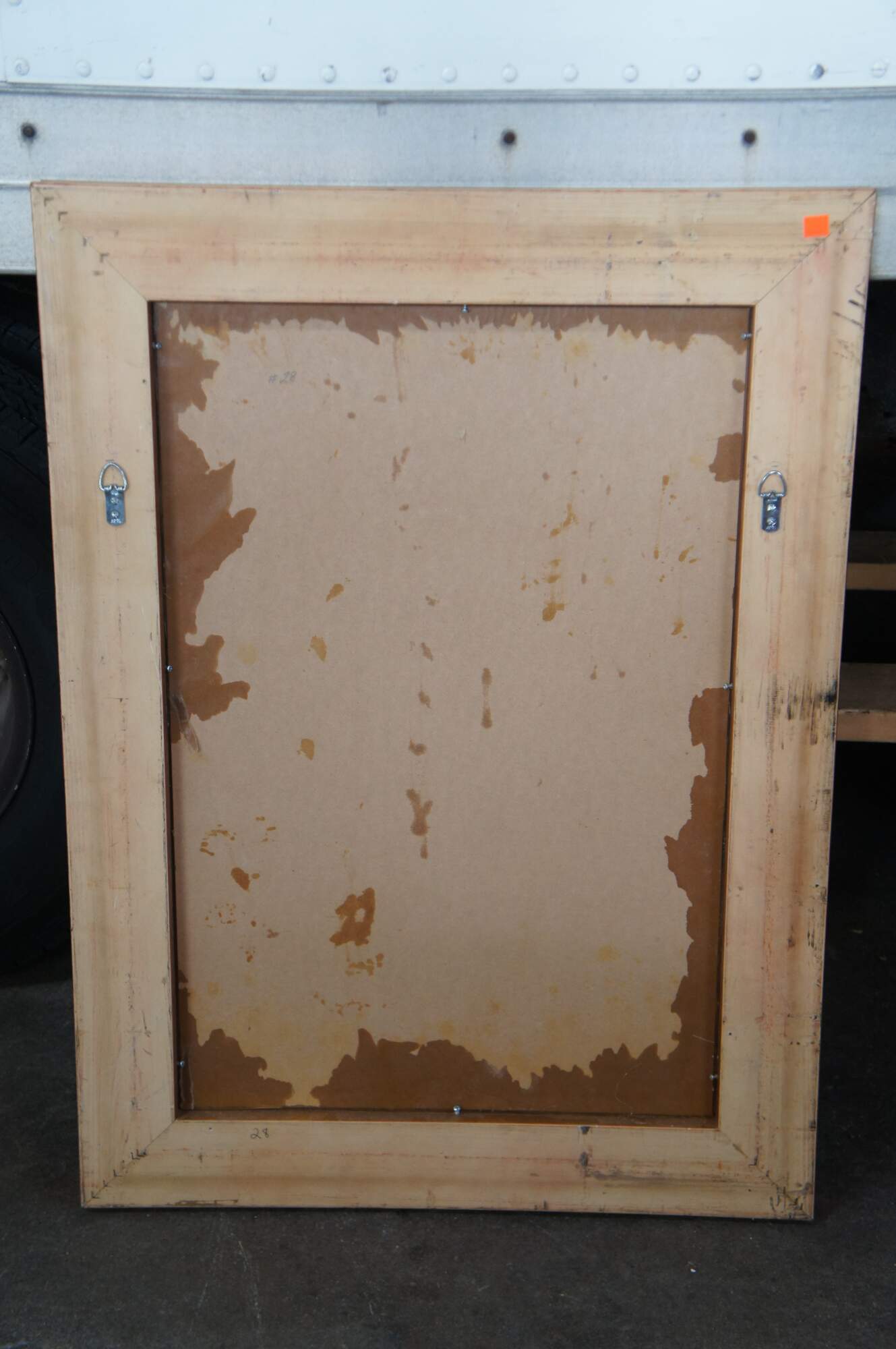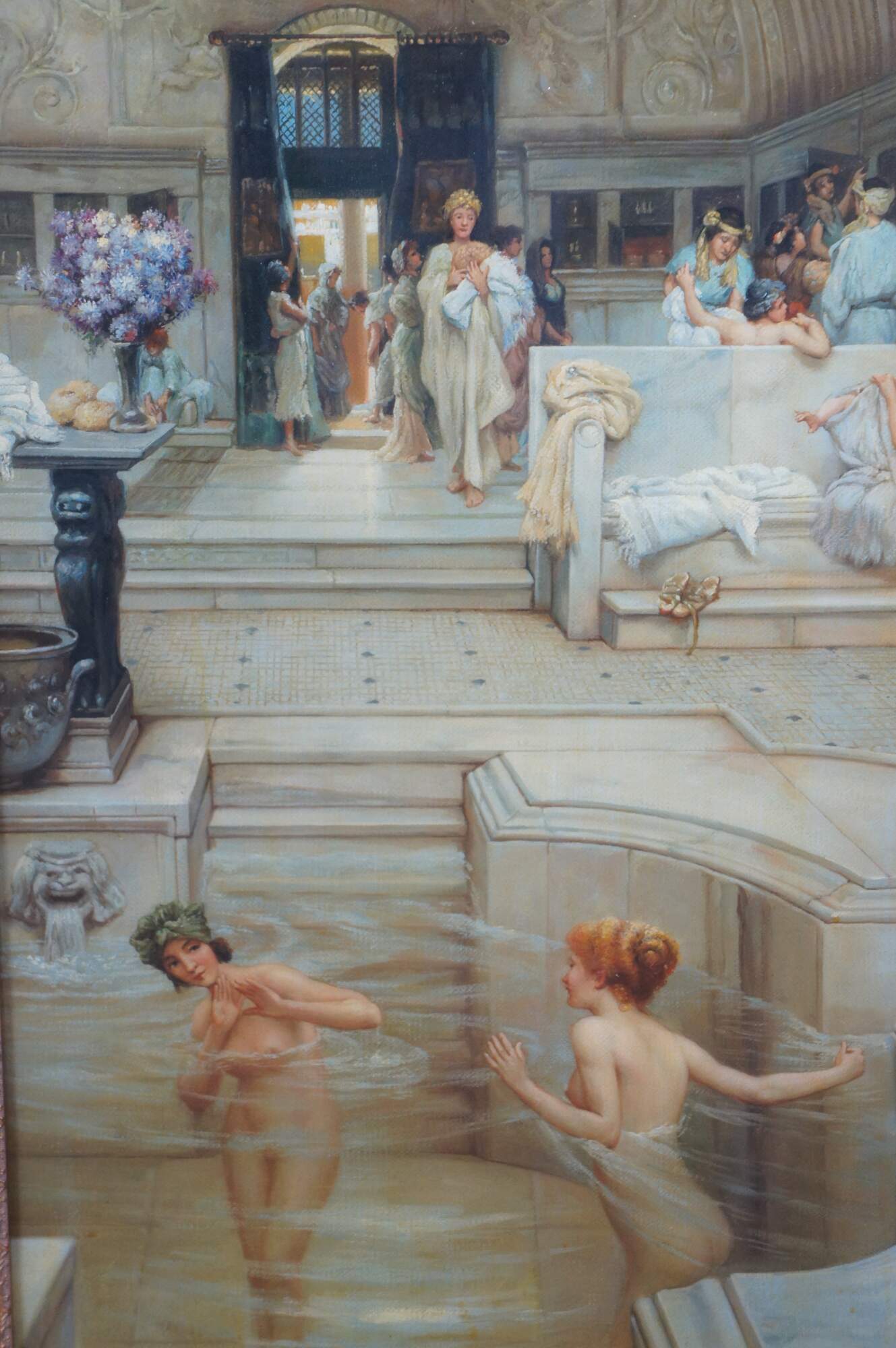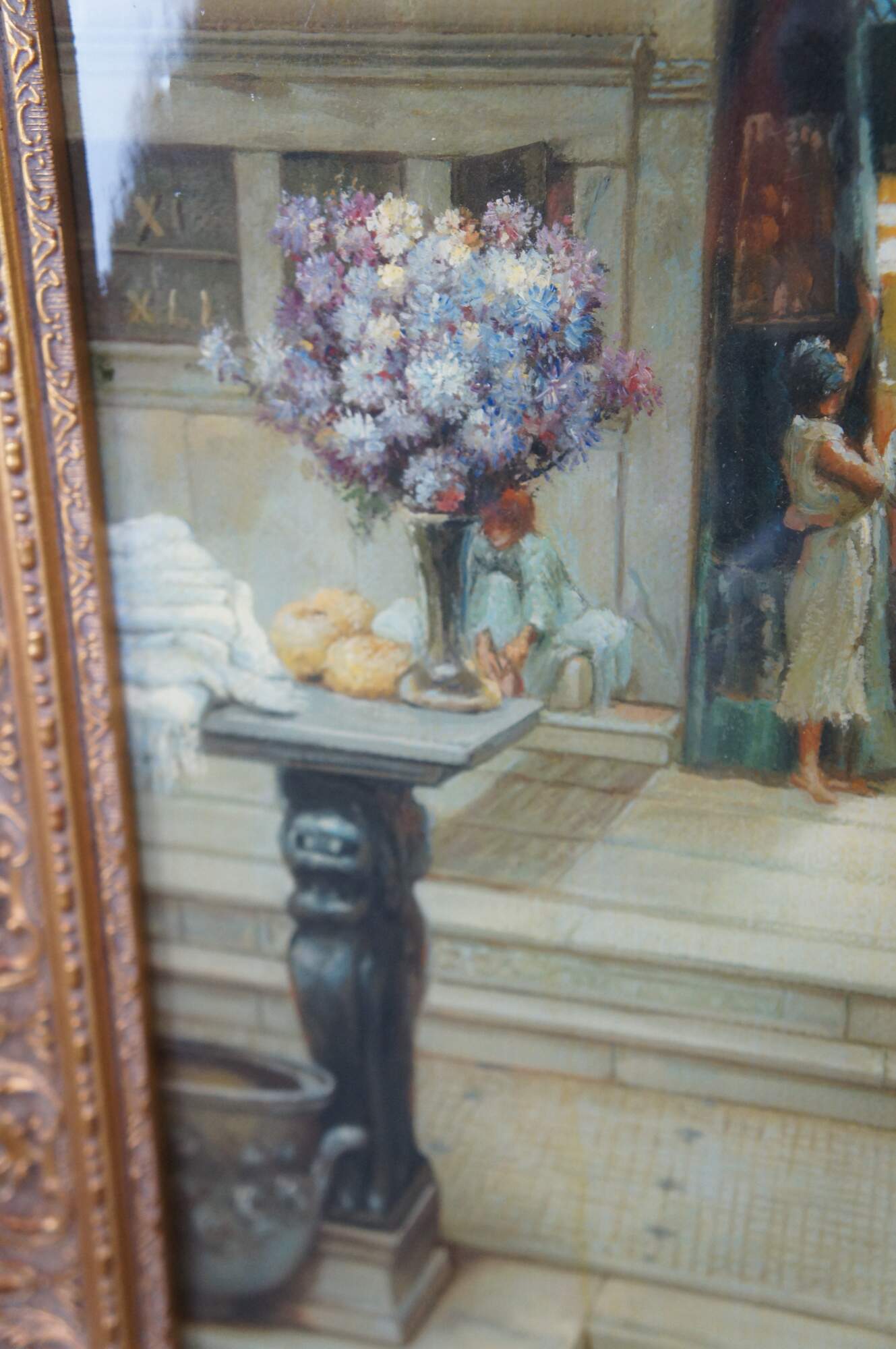 Victorian Classicism on full display in "Favourite Custom" after Sir Lawrence Alma-Tadema. The original is on display in the Tate Museum in Britain and was completed in 1909. The painting features a Ladies Bath house in Pompeii. Elegantly shown with charming characture and intricate detail. This example was painted at the end of the 20th century and has a resin finish to give a glossy appearance. The piece is framed in wood with a Neoclassical design and gold finish.