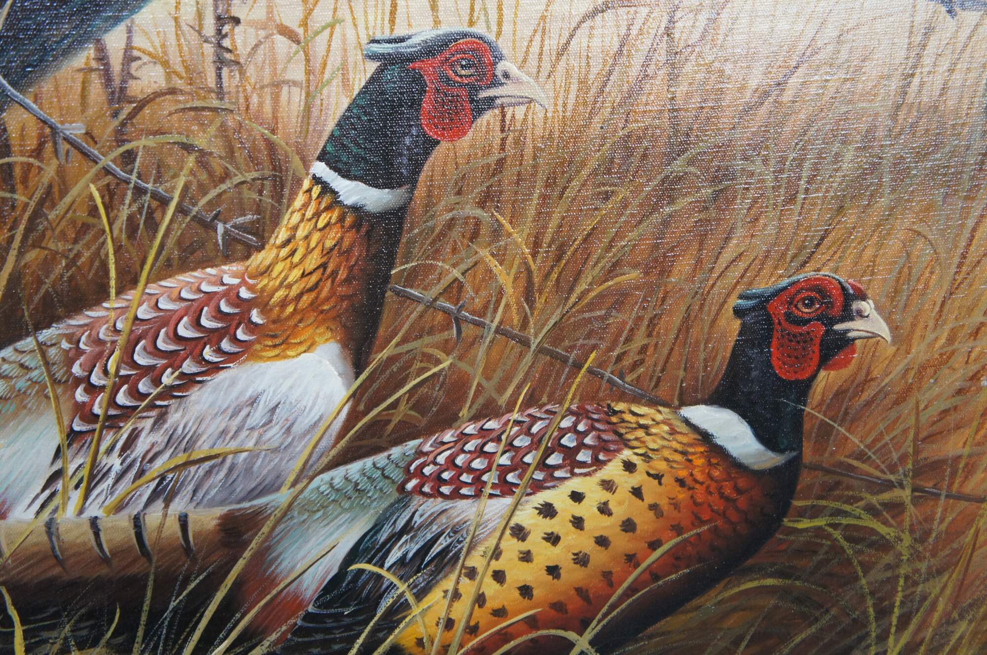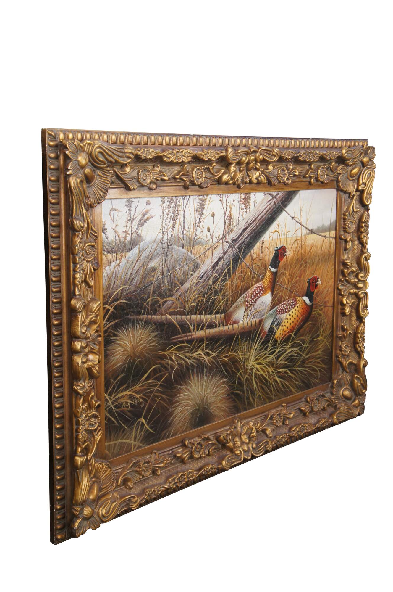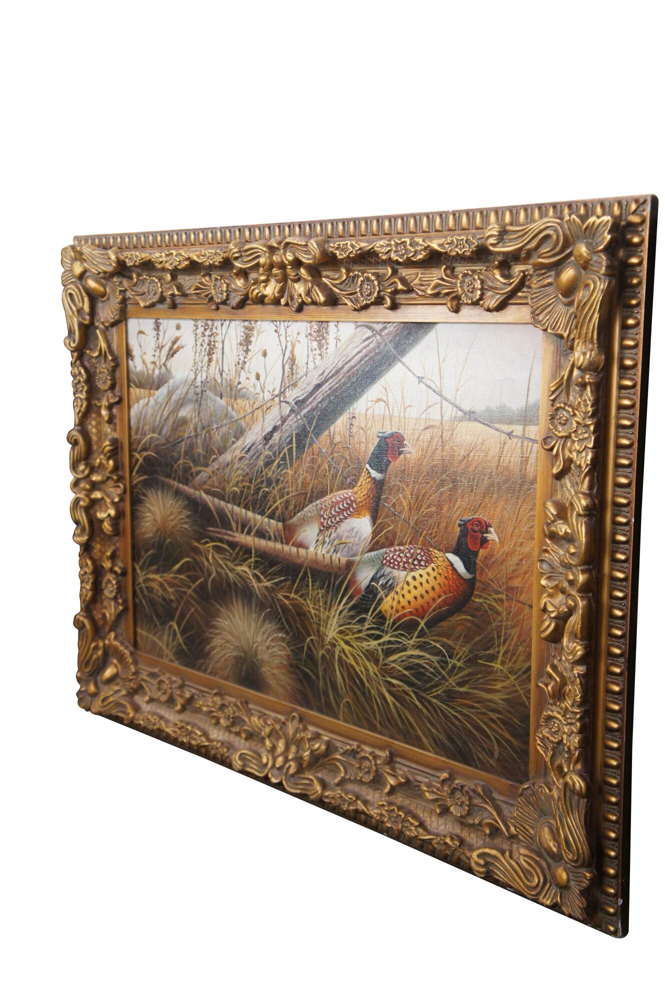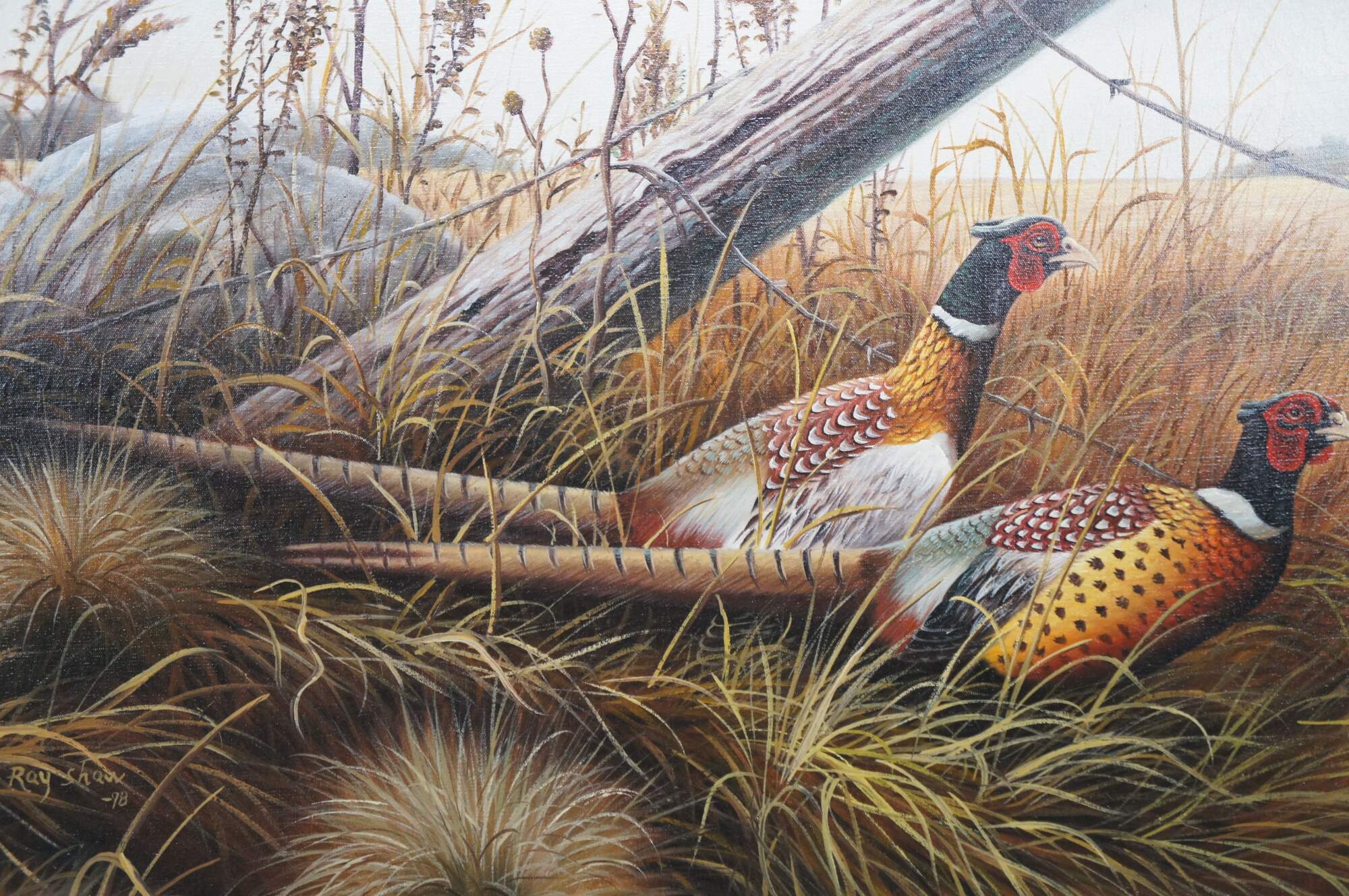 An original oil painting by Ray Shaw, signed lower left, circa 1998. Features Twi Ring Necked Pheasants in a field by a barbed wire fence. Beautifully portrayed with warm colors and lifelike detail. The canvas is oak framed in gold with low relief raised foliate.