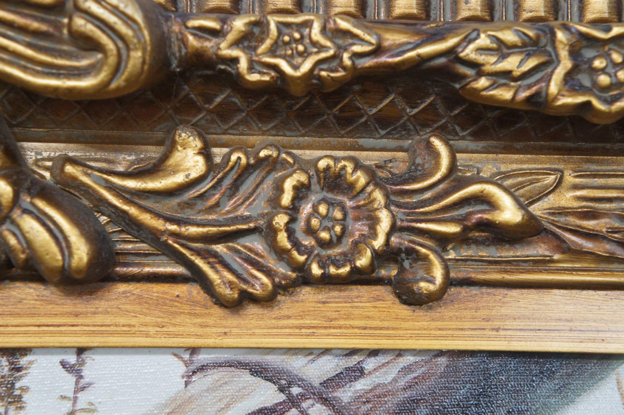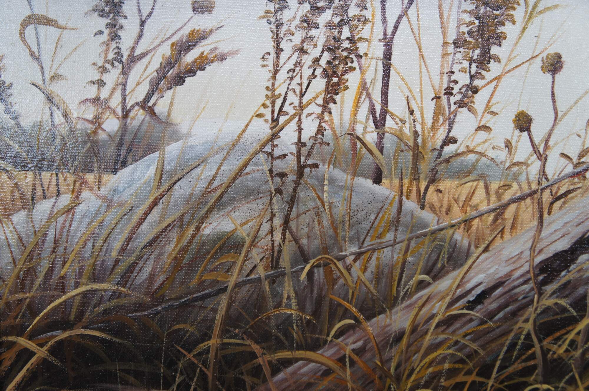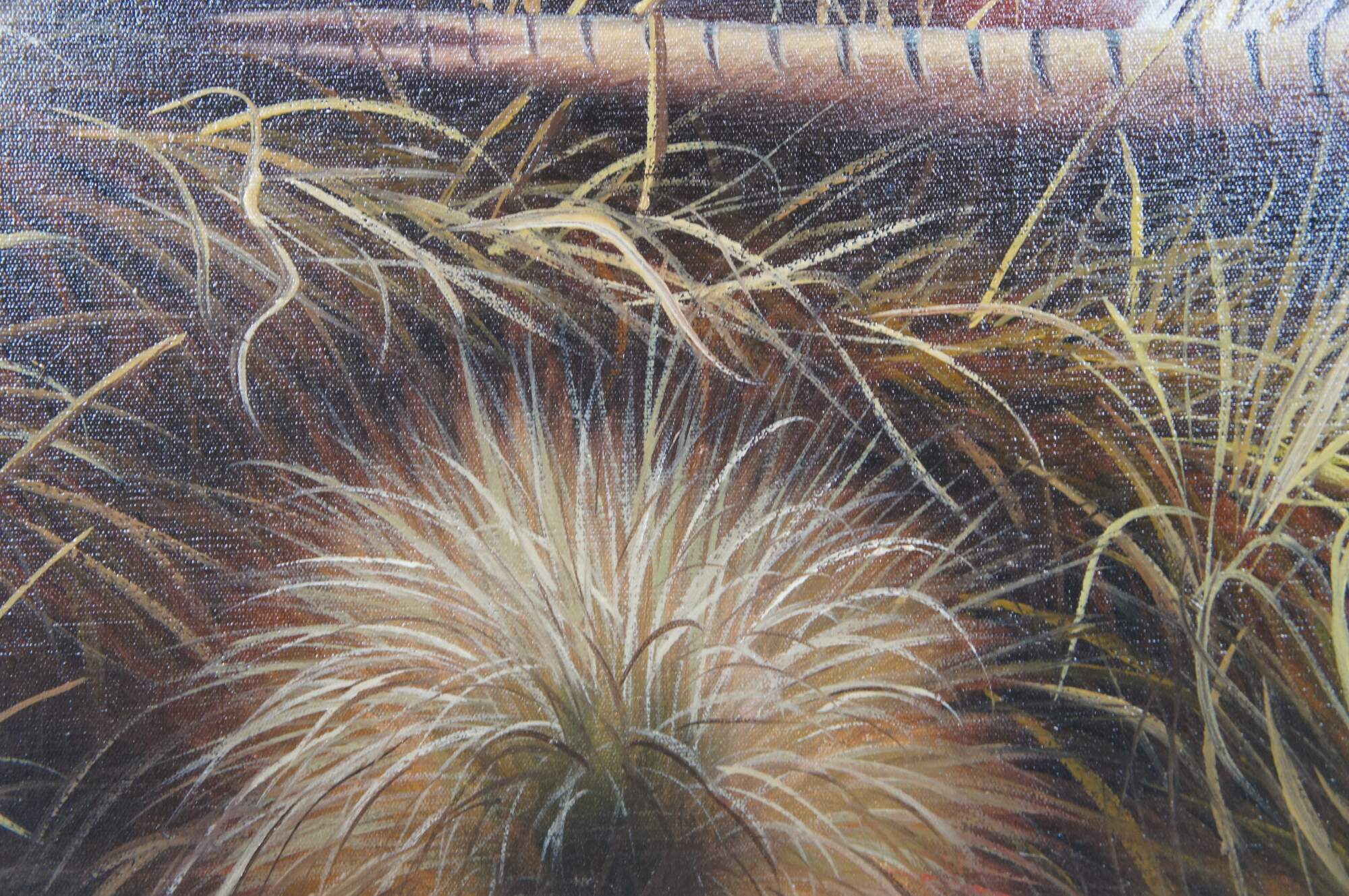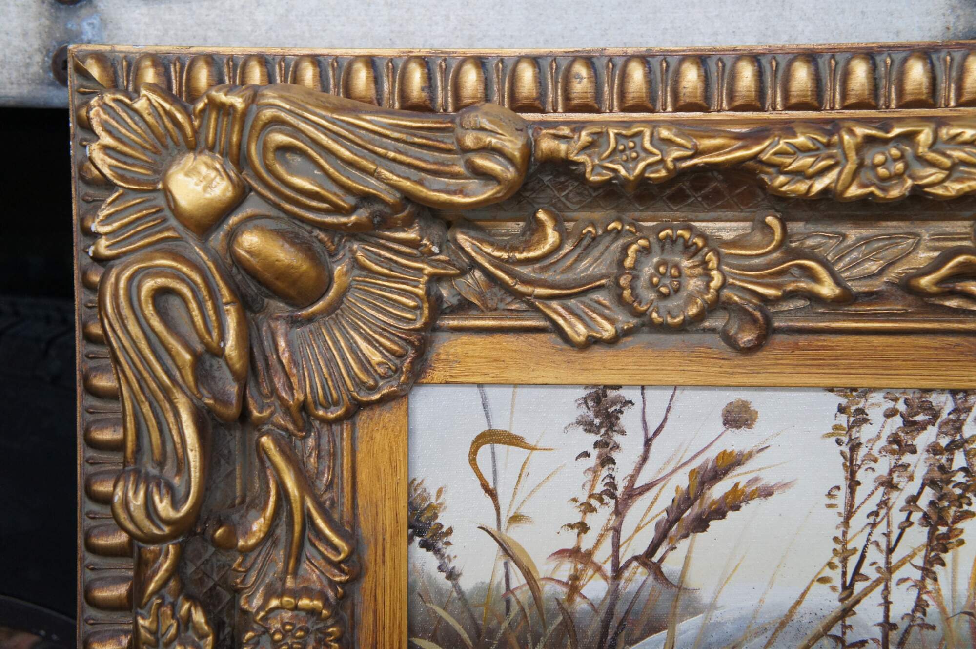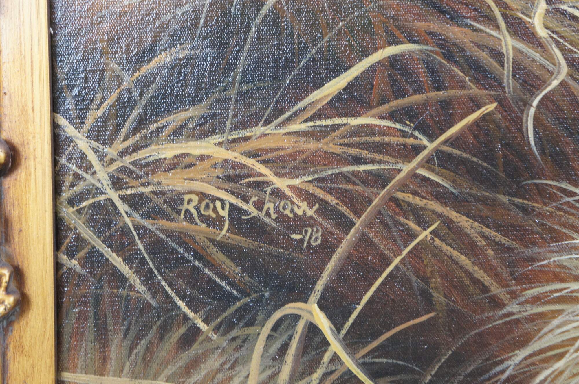An original oil painting by Ray Shaw, signed lower left, circa 1998. Features Twi Ring Necked Pheasants in a field by a barbed wire fence. Beautifully portrayed with warm colors and lifelike detail. The canvas is oak framed in gold with low relief raised foliate.