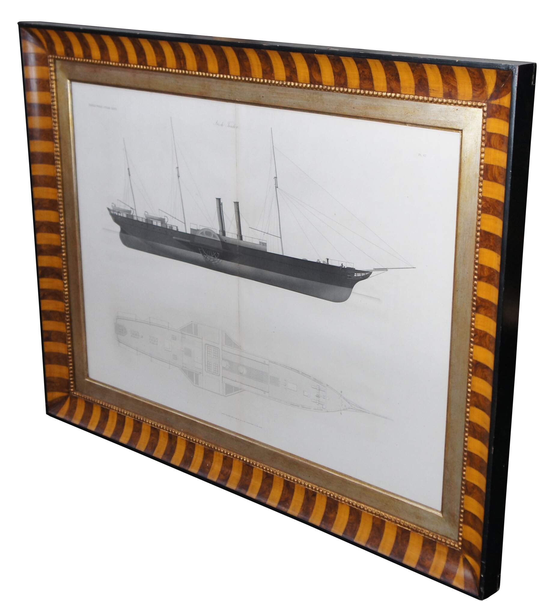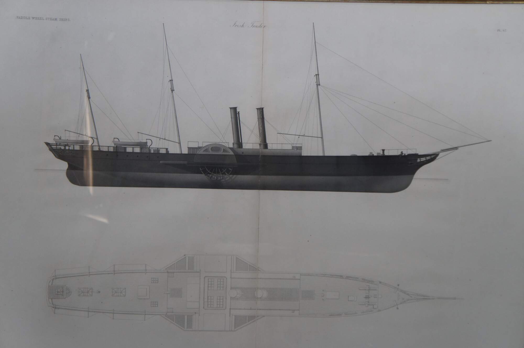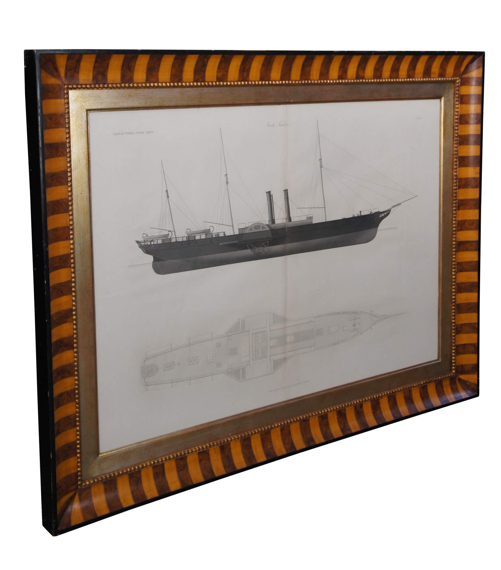 John Scott Russell, Paddle Wheel Steam Ships – Irish Trader. A nautical maritime engraving on paper showcasing the blue print of a Freight Trader. Exquistely framed with alternating burlwood. The Engraving is from 1864, plate 67 from John Scott Russell’s monumental work The Modern System of Naval Architecture, 3 volumes, London.