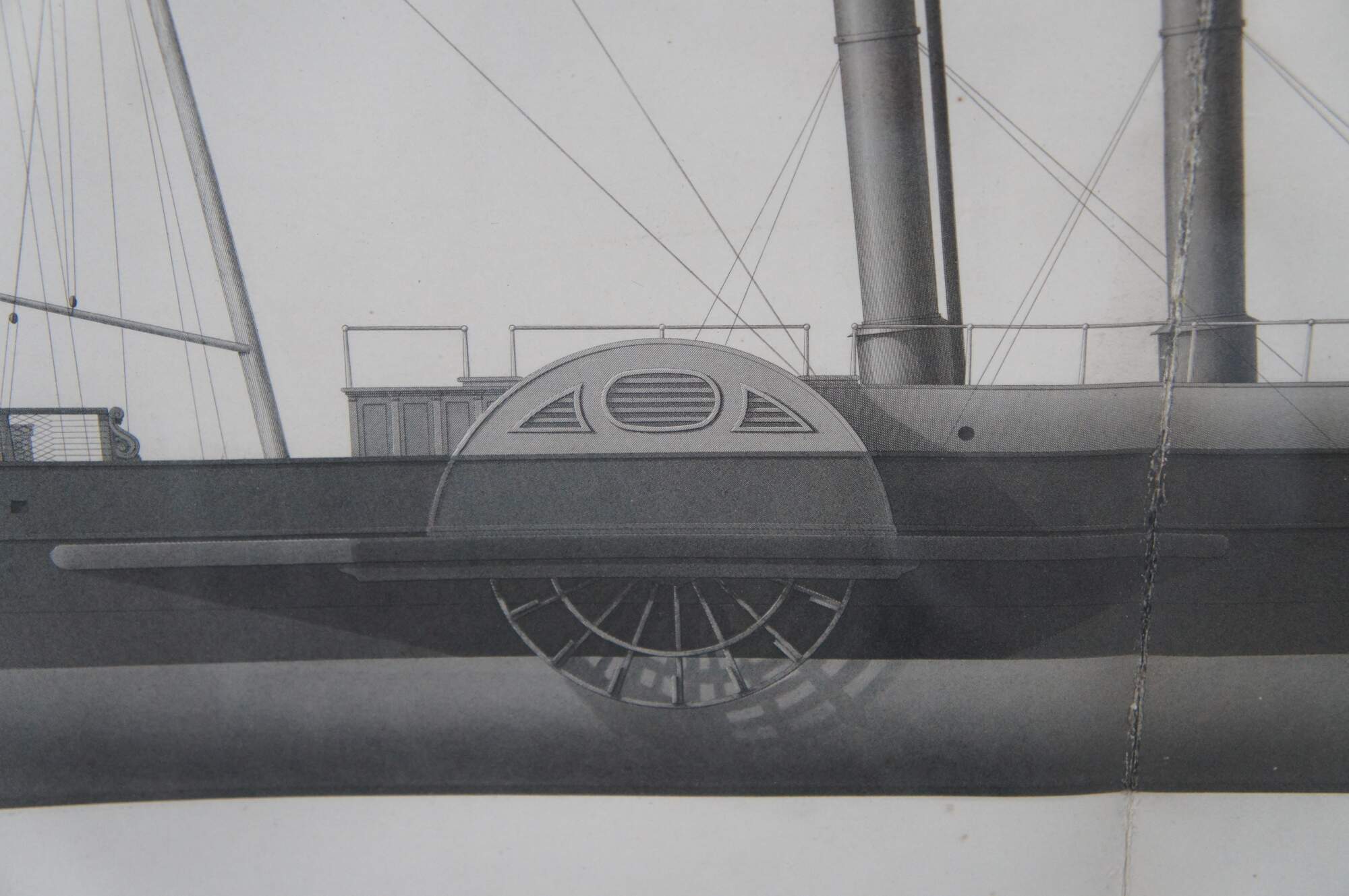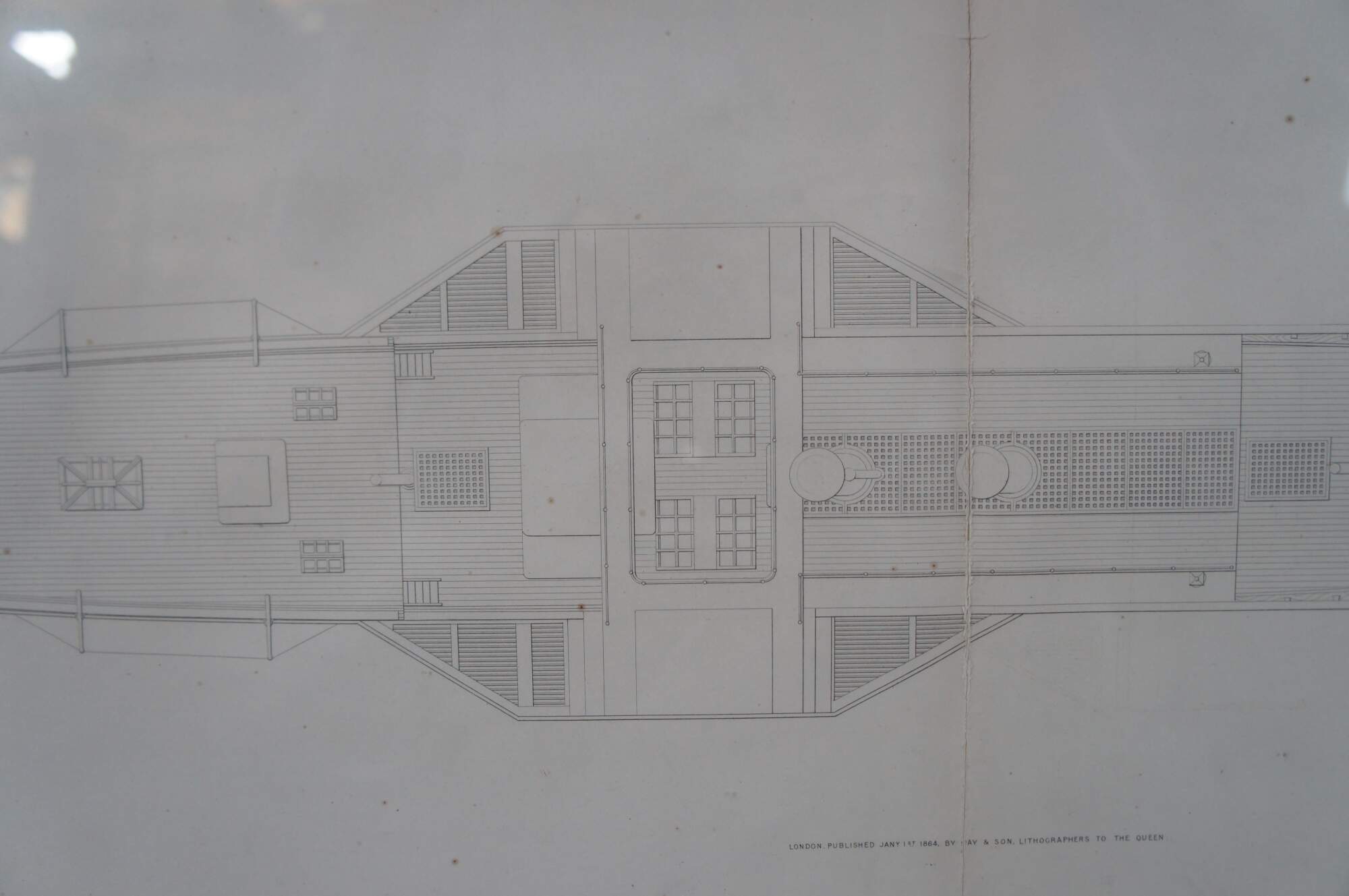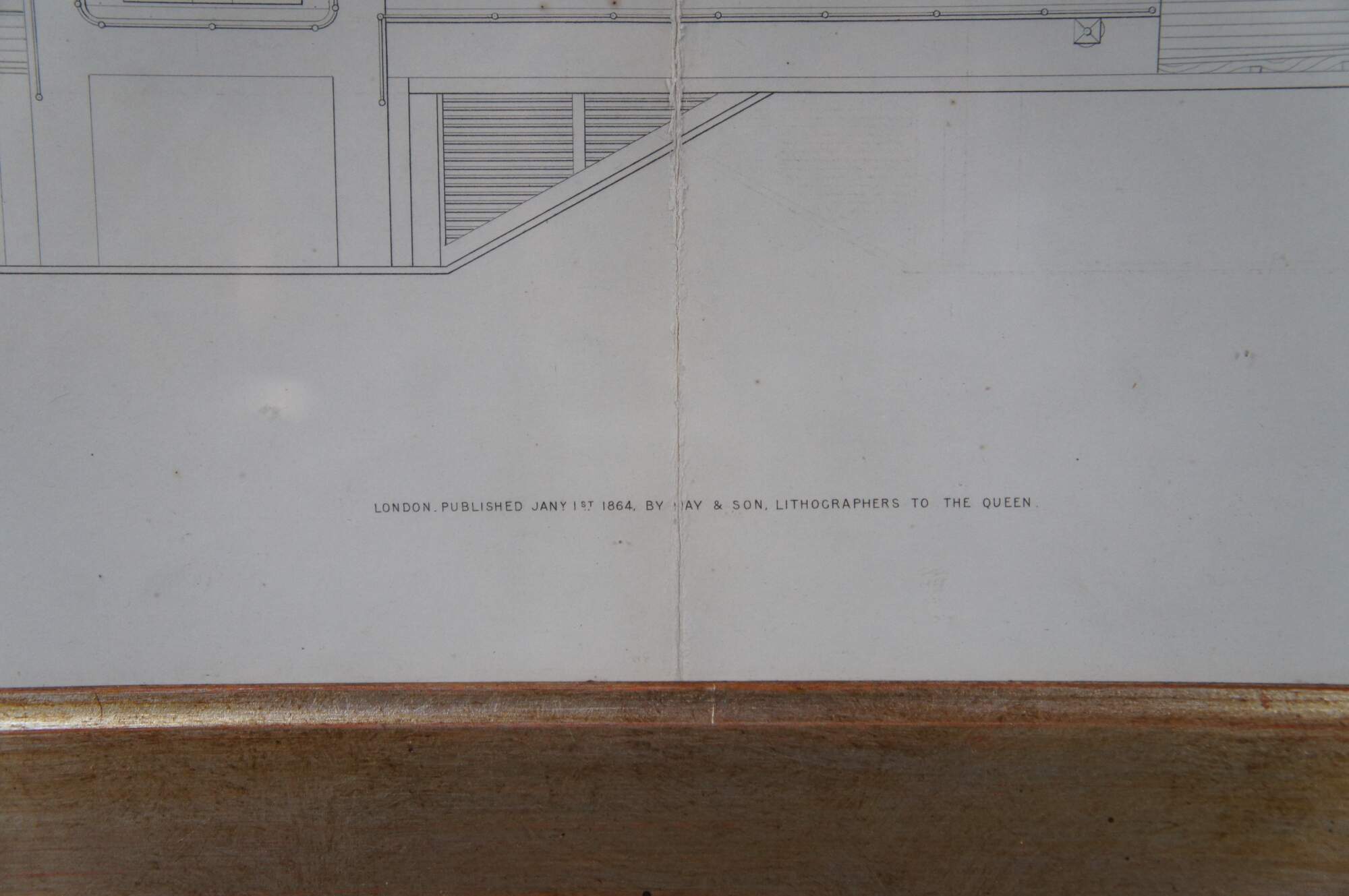 John Scott Russell, Paddle Wheel Steam Ships – Irish Trader. A nautical maritime engraving on paper showcasing the blue print of a Freight Trader. Exquistely framed with alternating burlwood. The Engraving is from 1864, plate 67 from John Scott Russell’s monumental work The Modern System of Naval Architecture, 3 volumes, London.