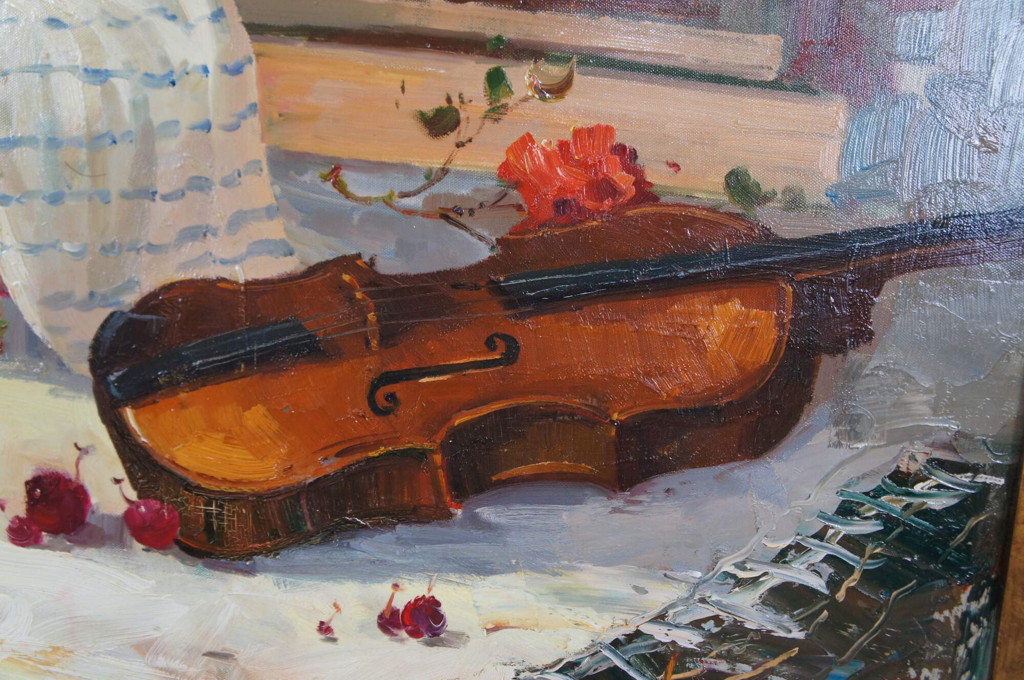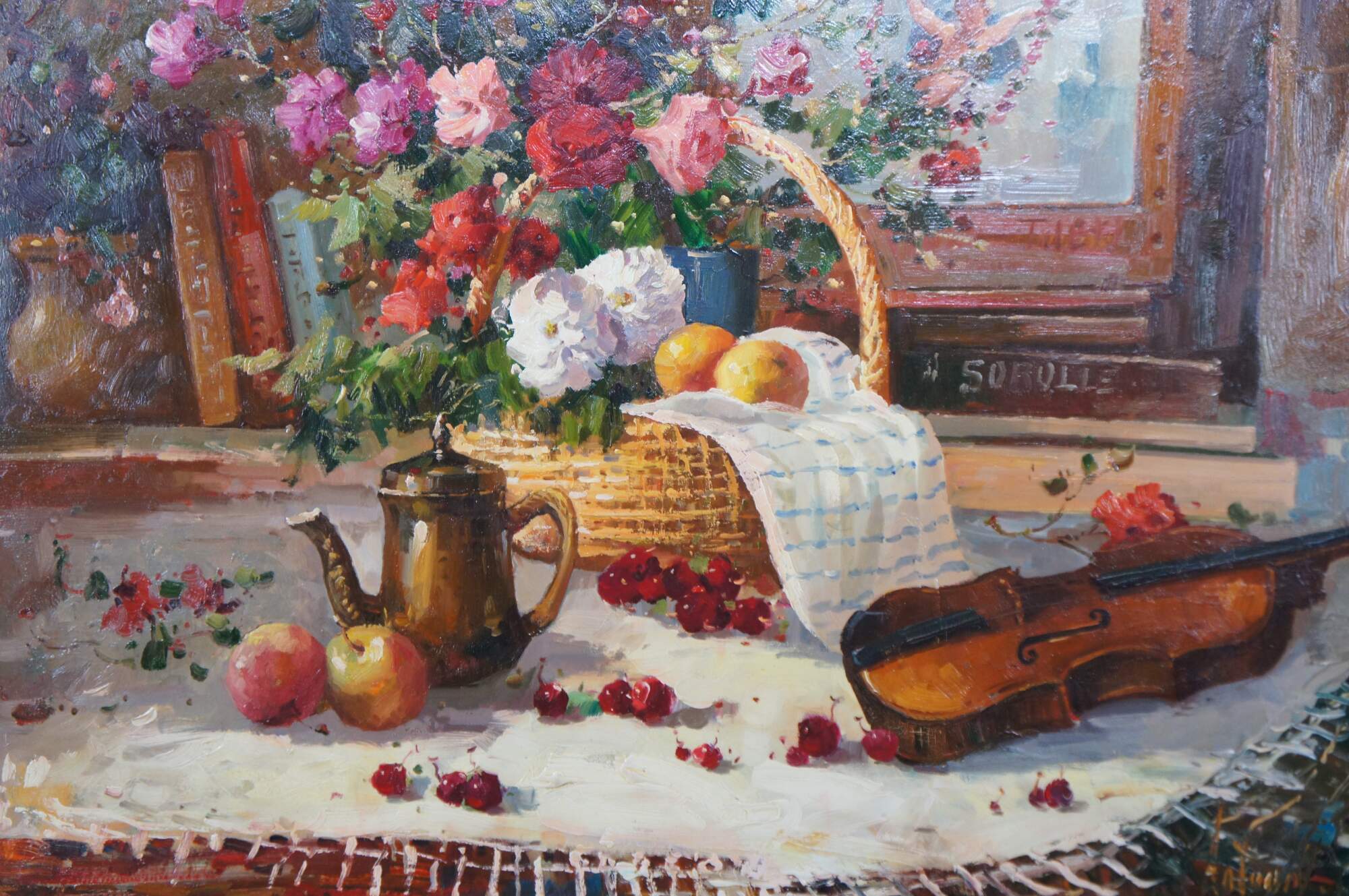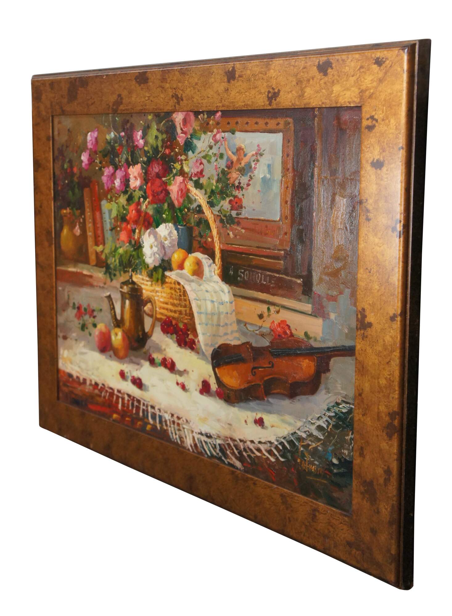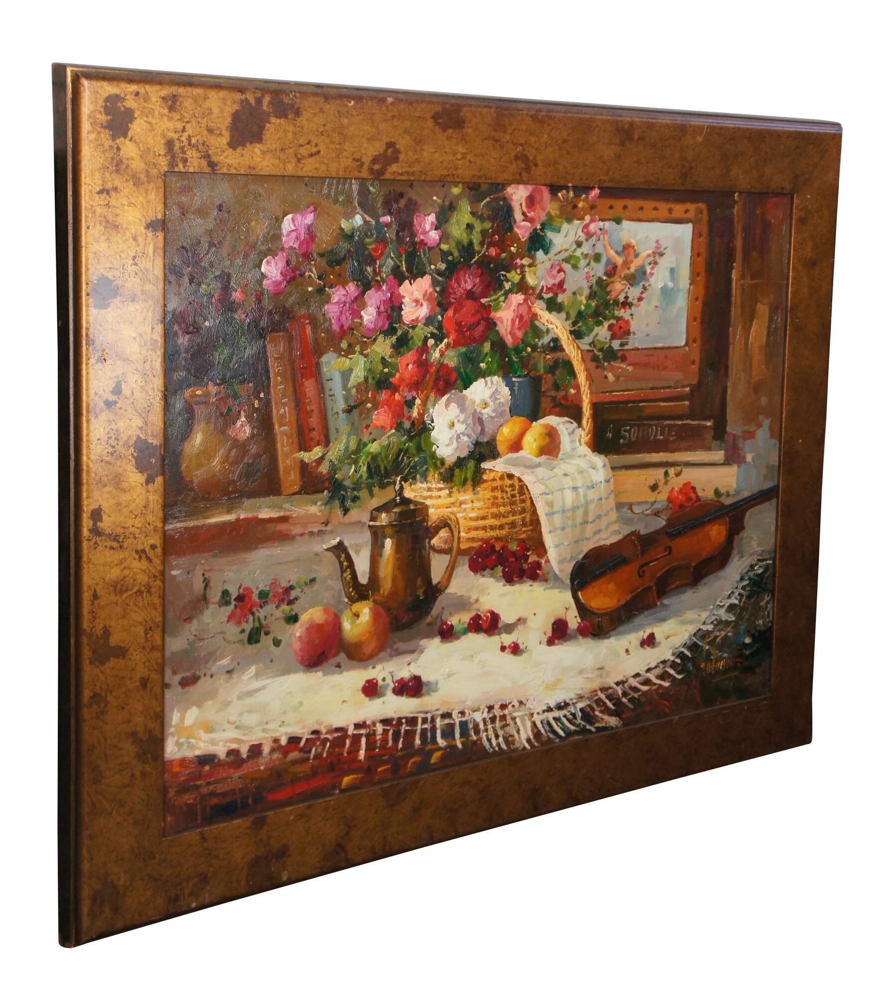 A beautiful still life painting featuring a table setting with a basket of flowers, apples, oranges, cherries, a tea pot and a Violin over a tablecloth. The setting is infront of a bookshelf with piece of art showing a Cherub. The painting is signed lower right Antauny. Framed in wood with a mottled gold finish.