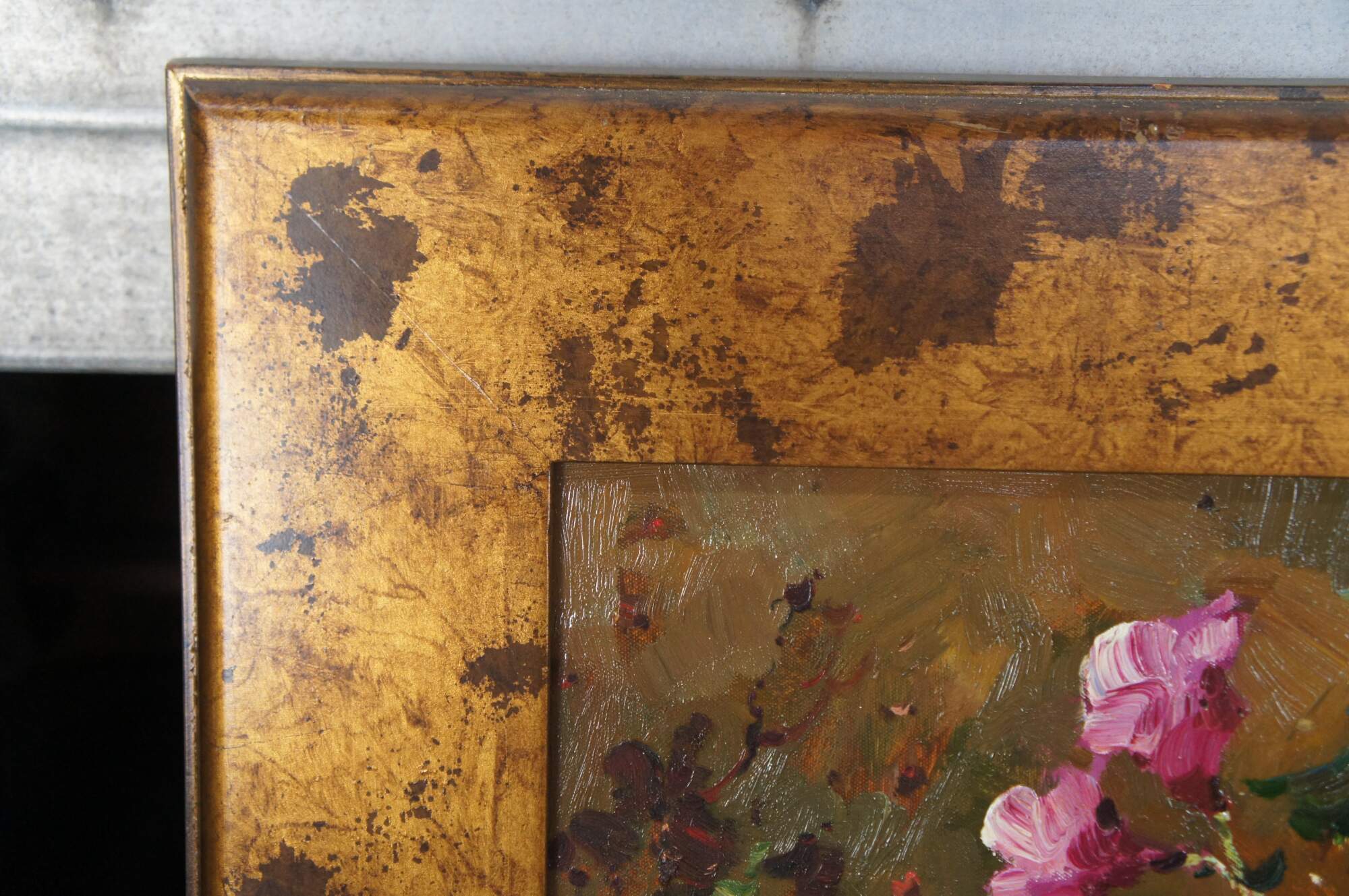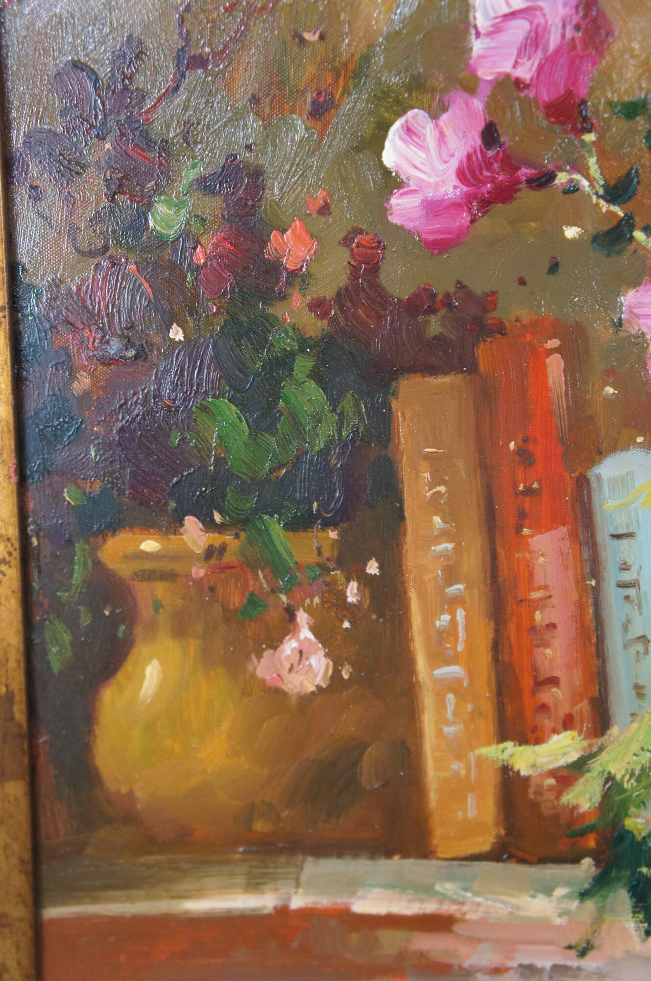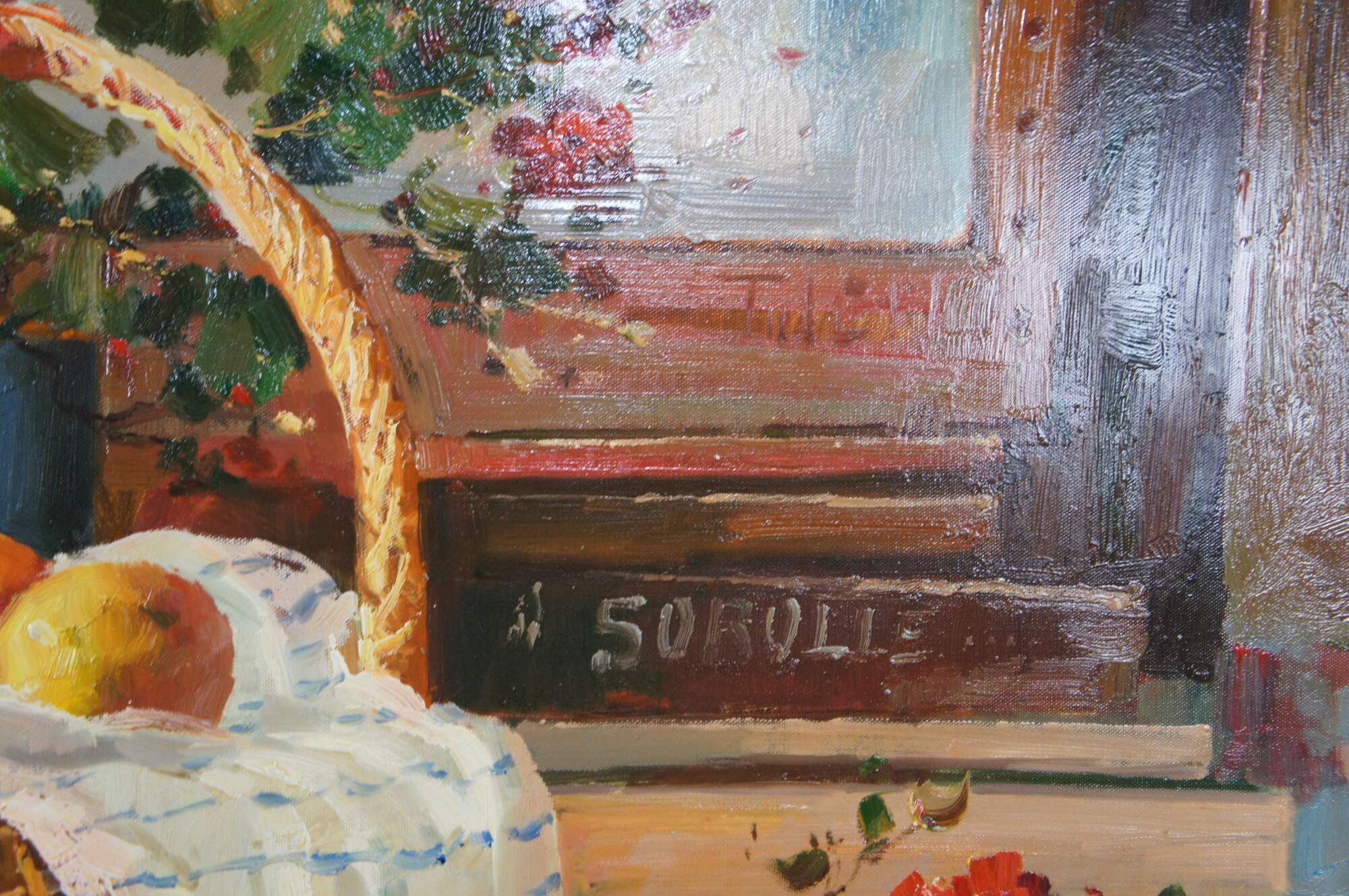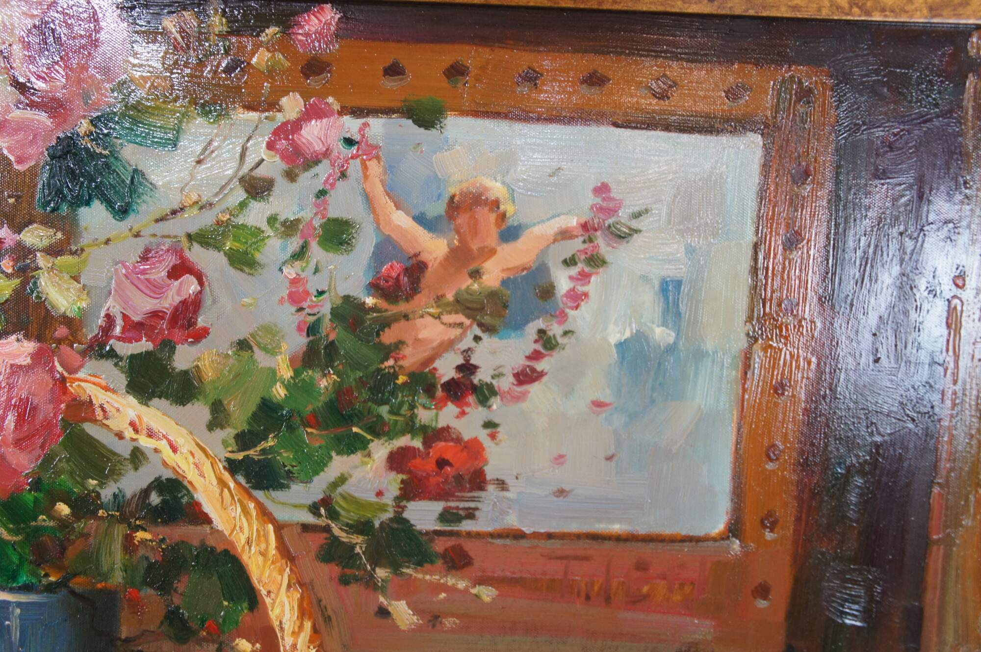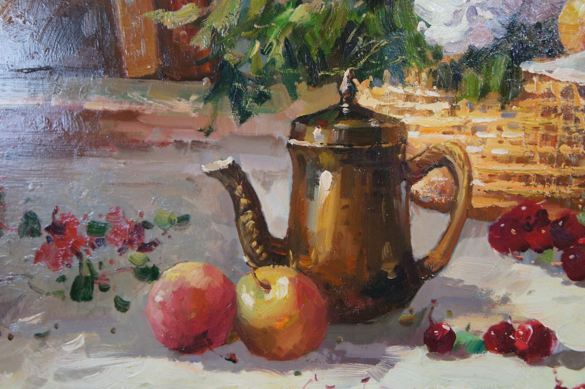 A beautiful still life painting featuring a table setting with a basket of flowers, apples, oranges, cherries, a tea pot and a Violin over a tablecloth. The setting is infront of a bookshelf with piece of art showing a Cherub. The painting is signed lower right Antauny. Framed in wood with a mottled gold finish.