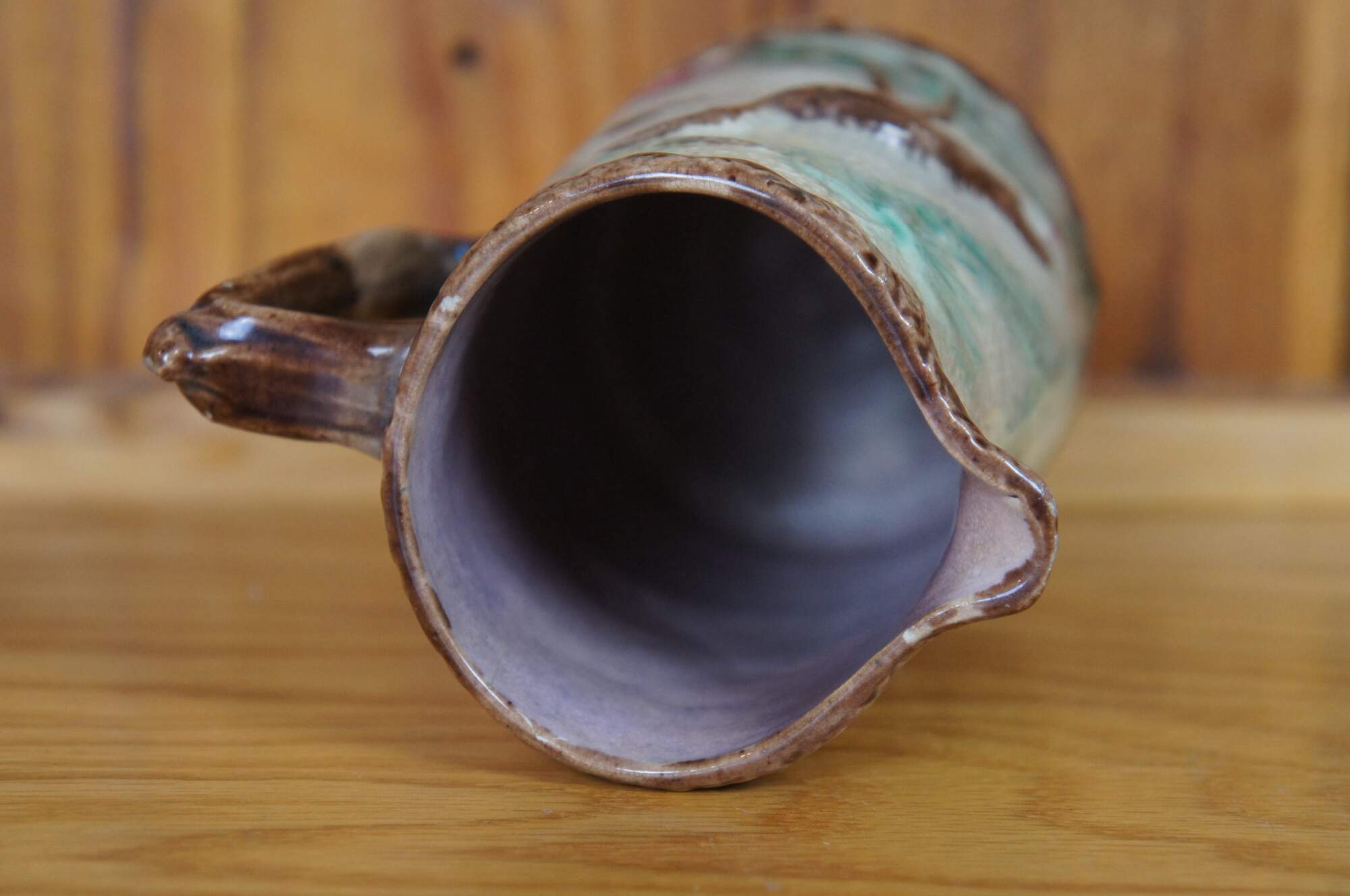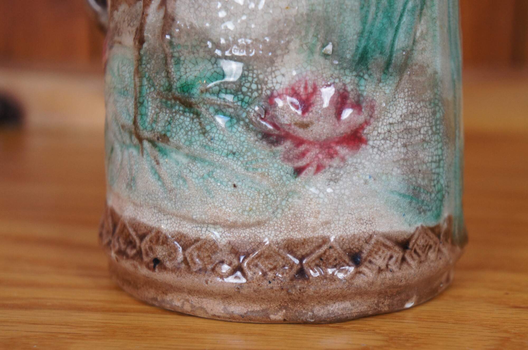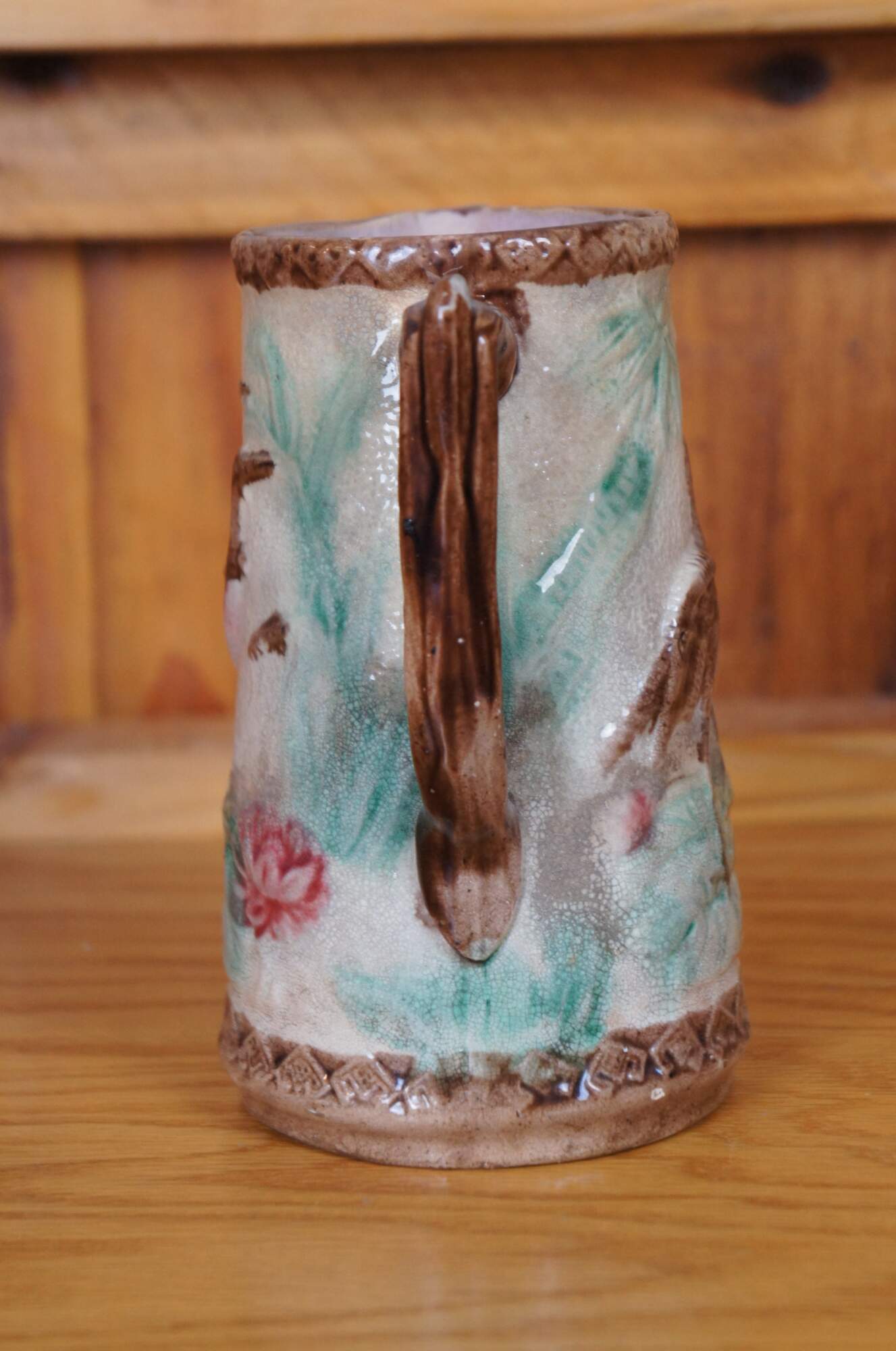 Antique Majolica Heron / Crane / Stork creamer pitcher / jug featuring the bird eating a fish on a water lily pad.