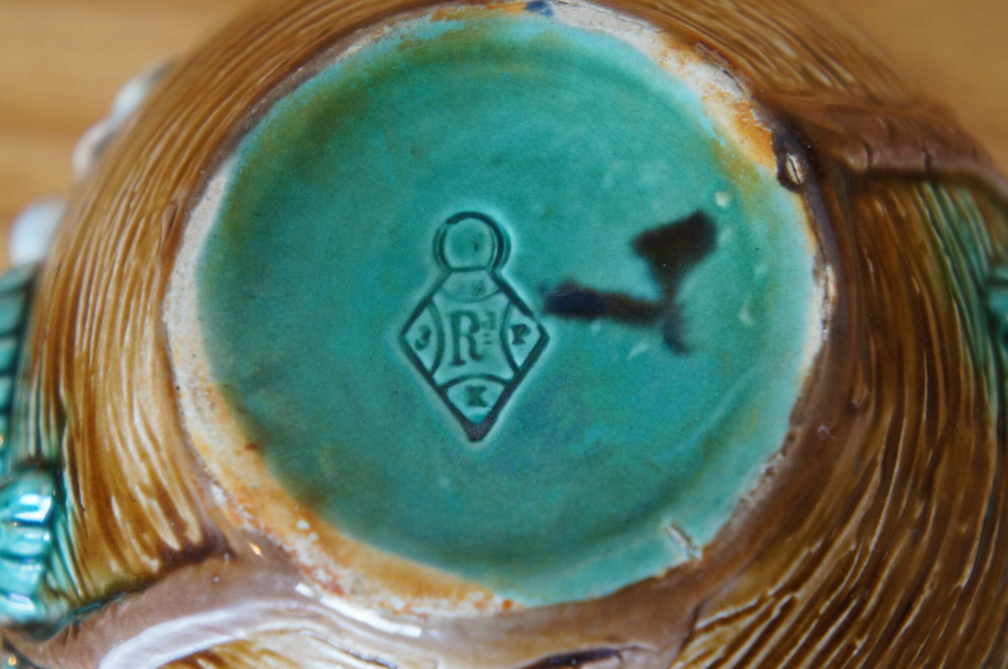 Despite a late start, Wedgwood’s majolica output was huge, successfully feeding the home market and exporting to the new markets of America and Australia. It is distinctive for its quality of glazes and sharpness of modeling. Most pieces bear an impressed WEDGWOOD mark in small letters. In 1860, Wedgwood also added a system of date codes, consisting of three capital letters. The first letter indicates the month, the second is a potter’s mark, and the third indicates the year of production. When present, a British registry mark notes the date of registration, and owing to the use of historical designs, may be much earlier than the actual date of production.