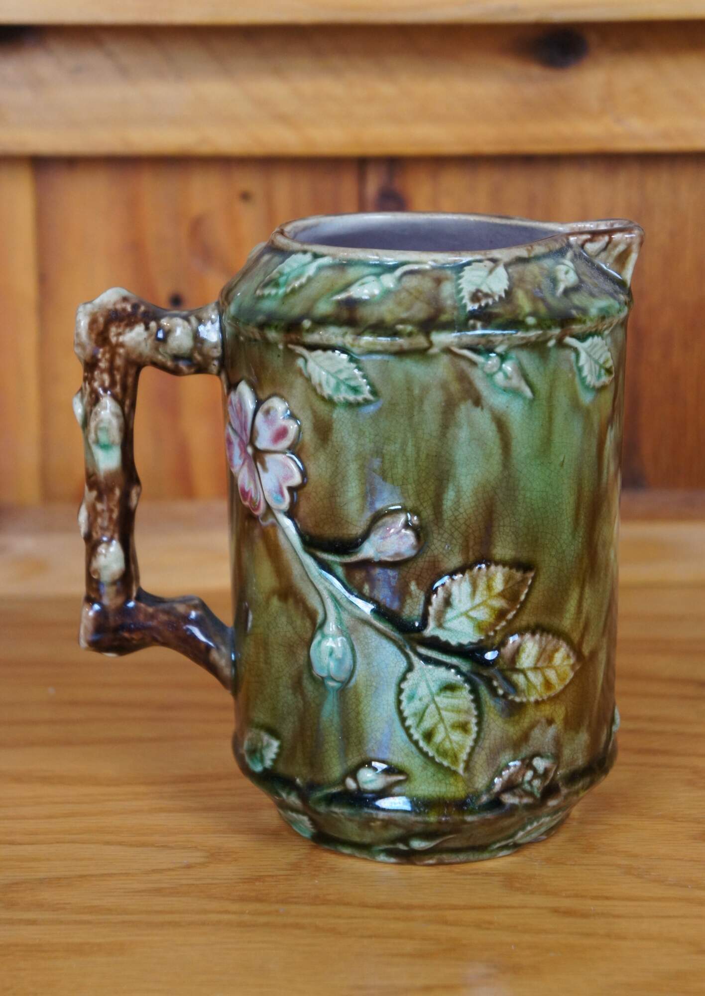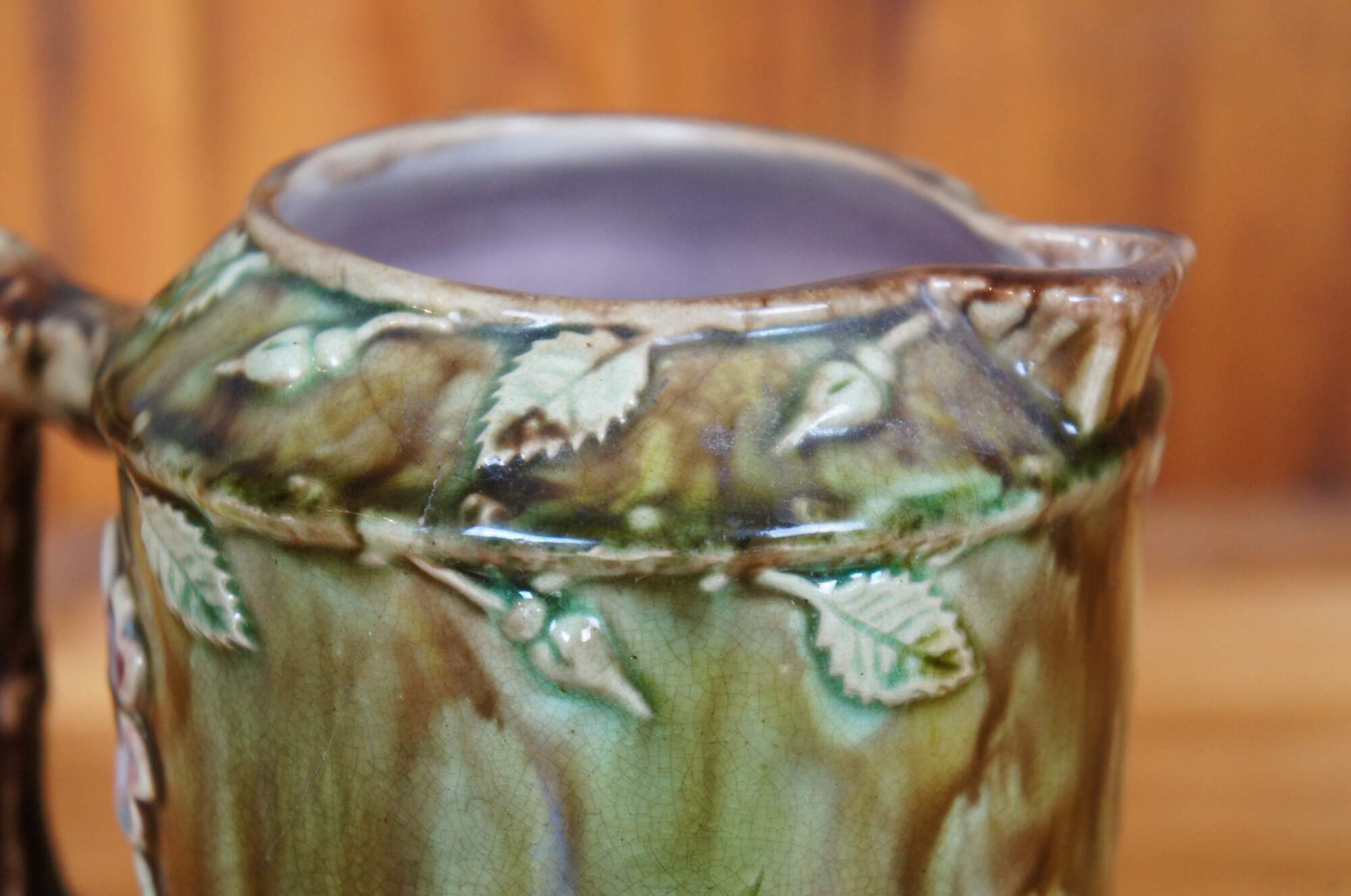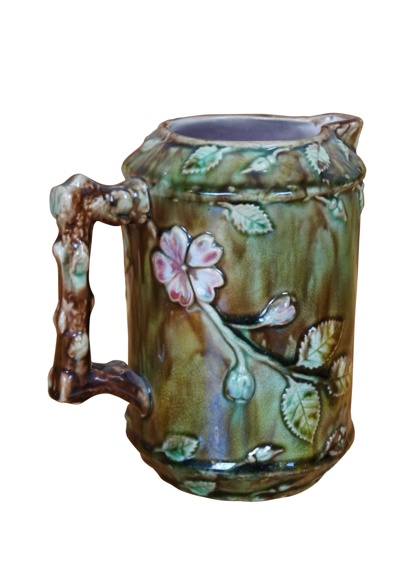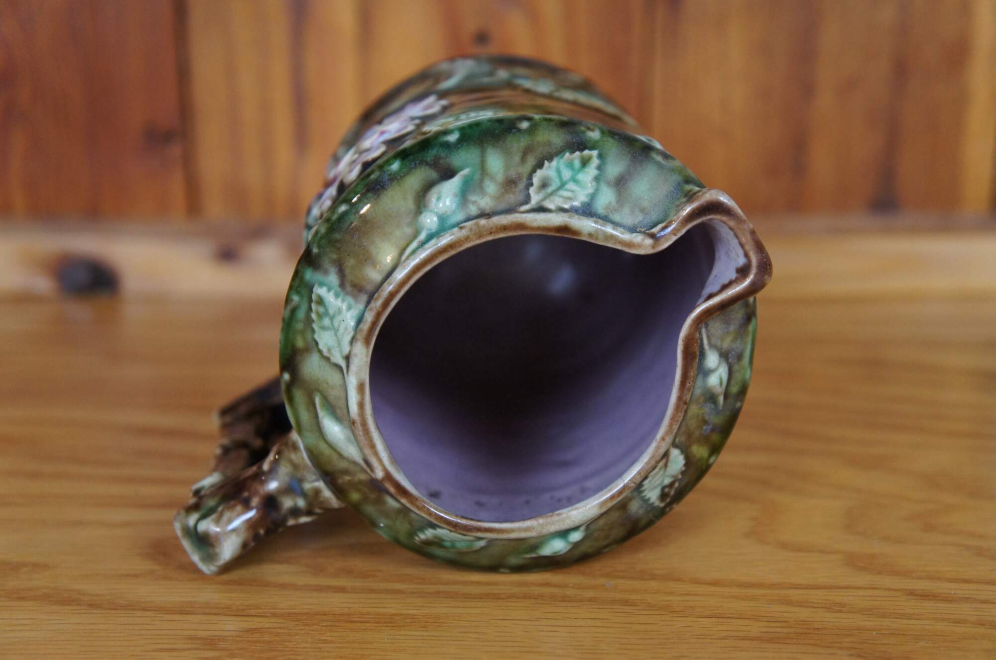 Antique Majolica French Barbotine pitcher / jug / carafe featuring a green and brown field with wild dog rose flower blossoms and a twig / branch handle, and purple lavender interior.