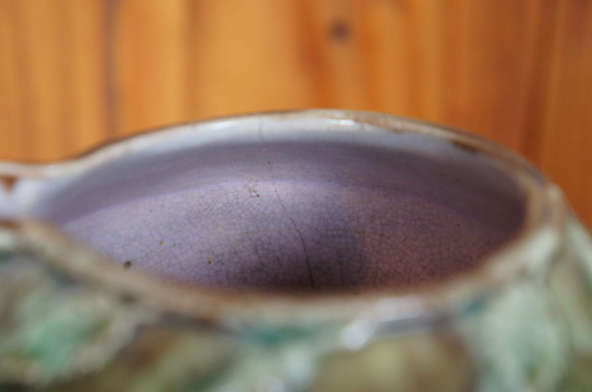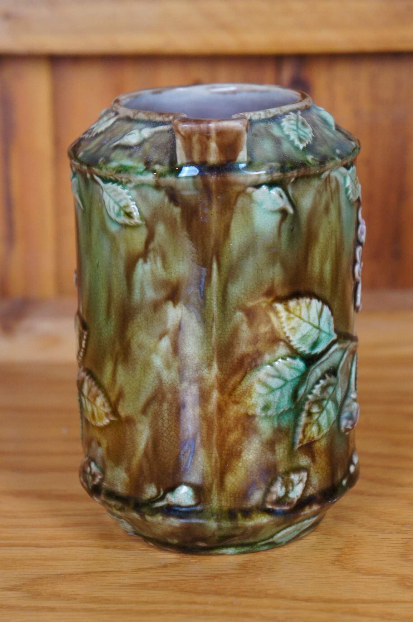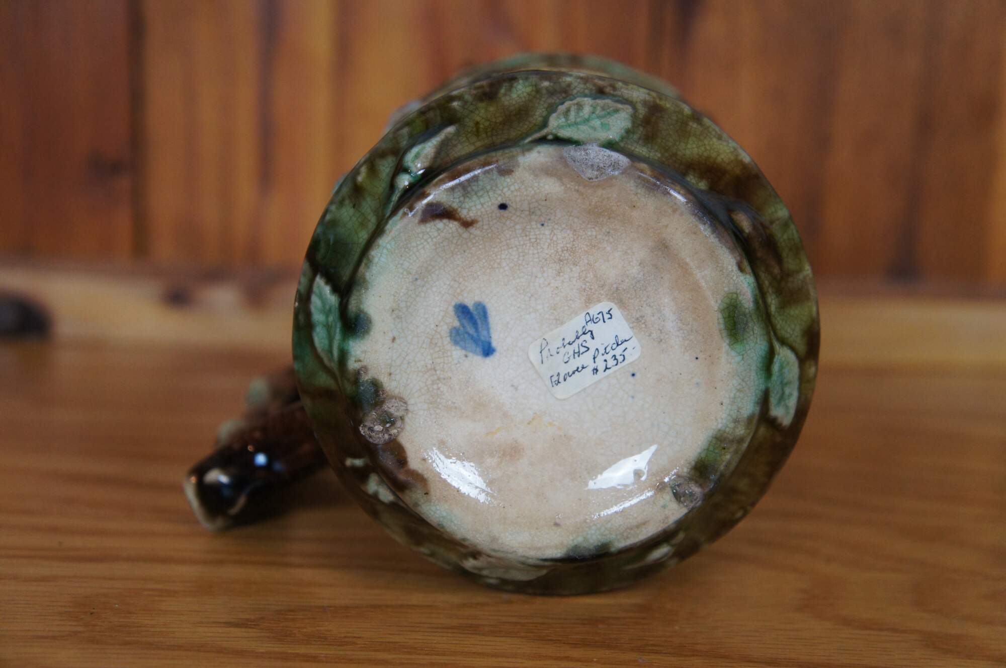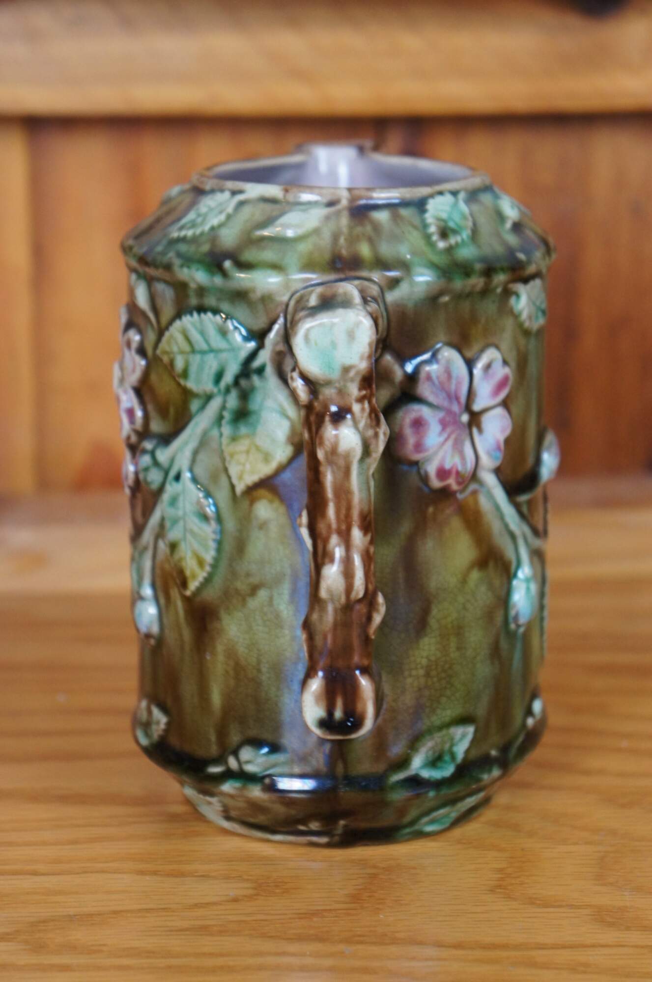 Antique Majolica French Barbotine pitcher / jug / carafe featuring a green and brown field with wild dog rose flower blossoms and a twig / branch handle, and purple lavender interior.