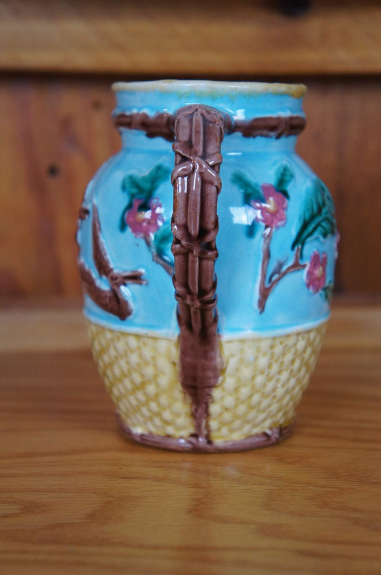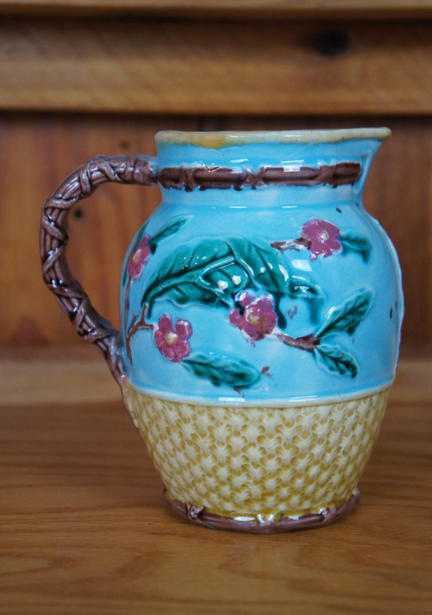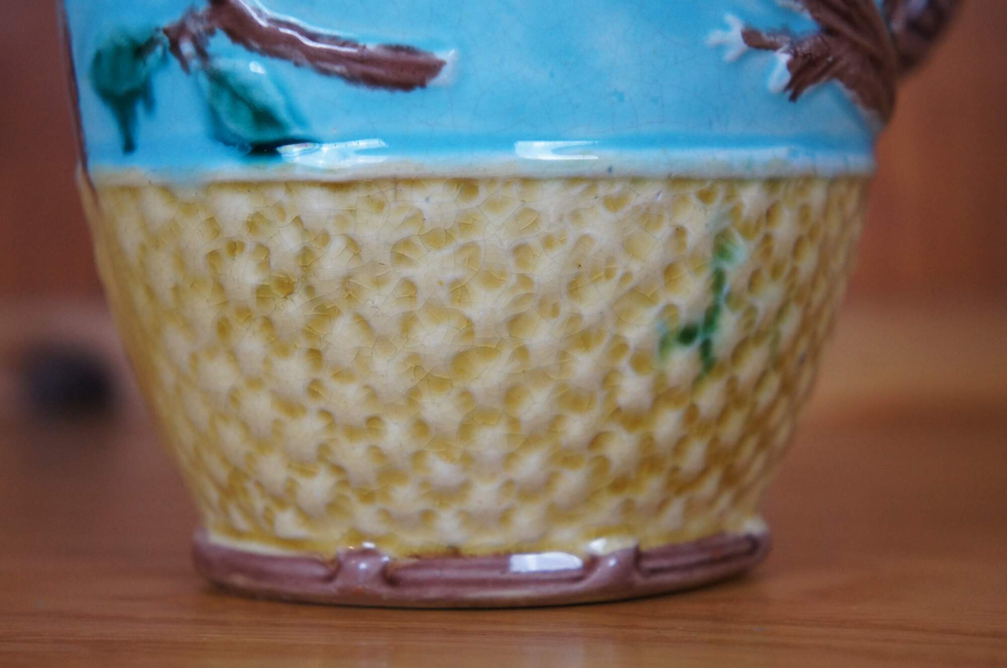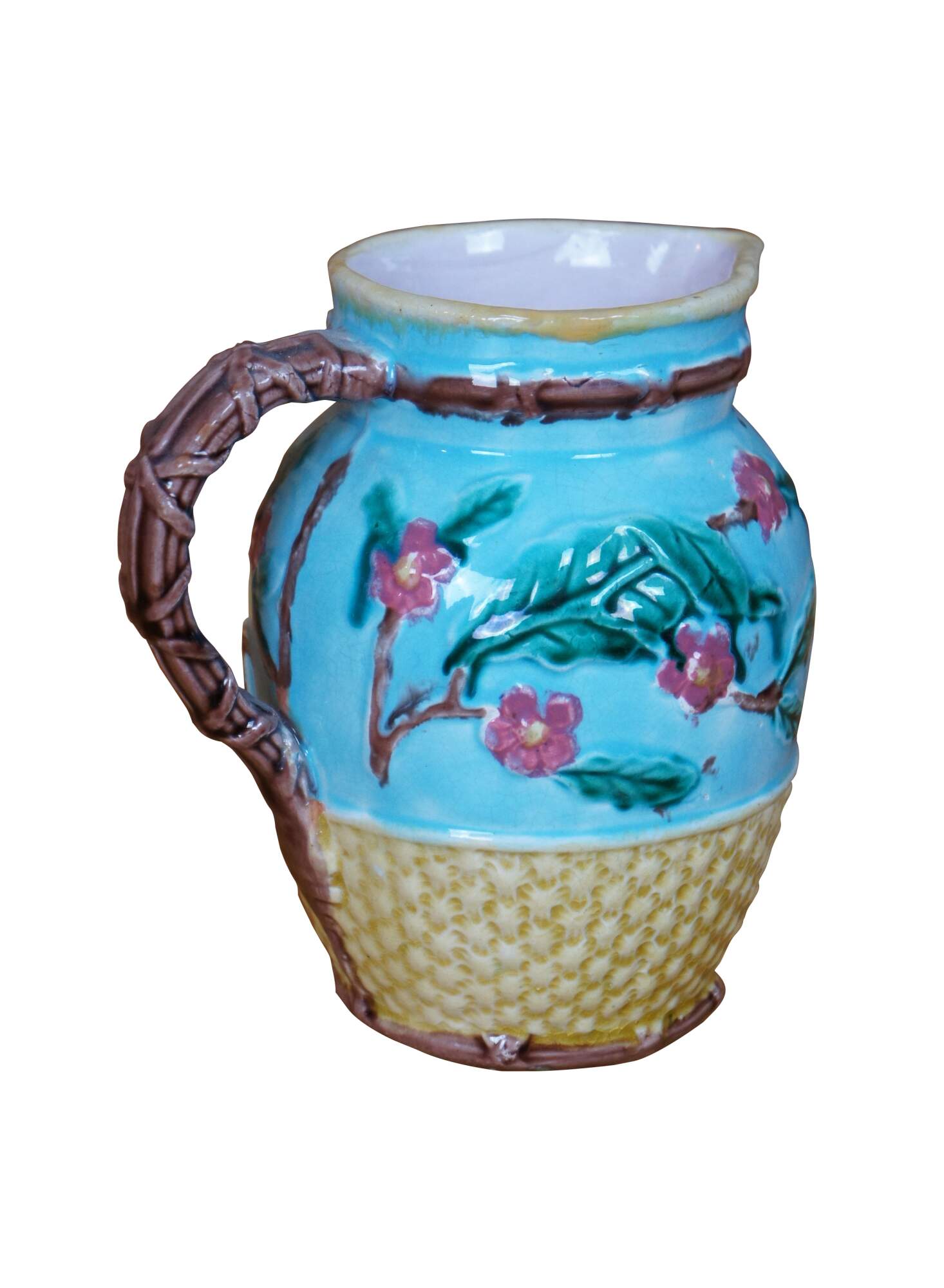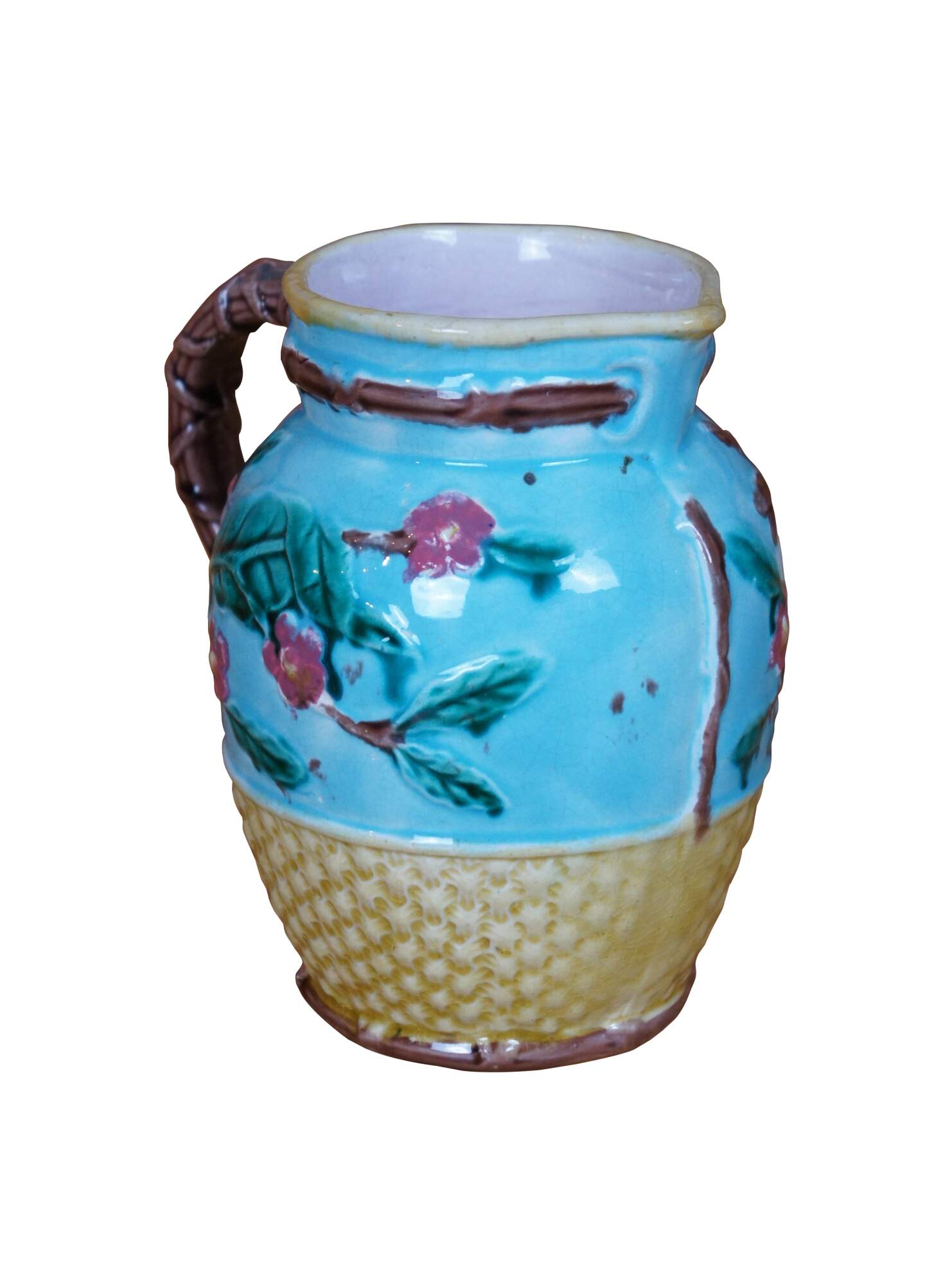 Antique Majolica creamer pitcher or jug featuring a basketweave motif with Cranes and Dogwood flowers against a turquoise sky. Attributed to Thomas Forester.