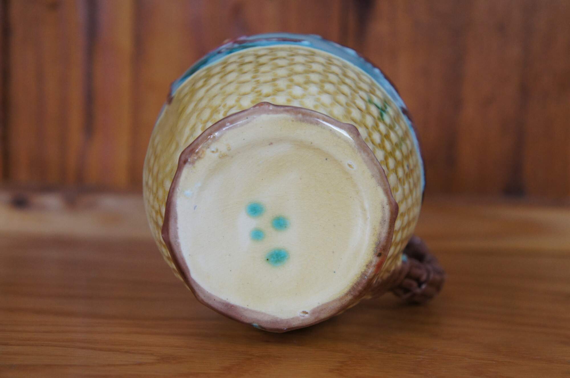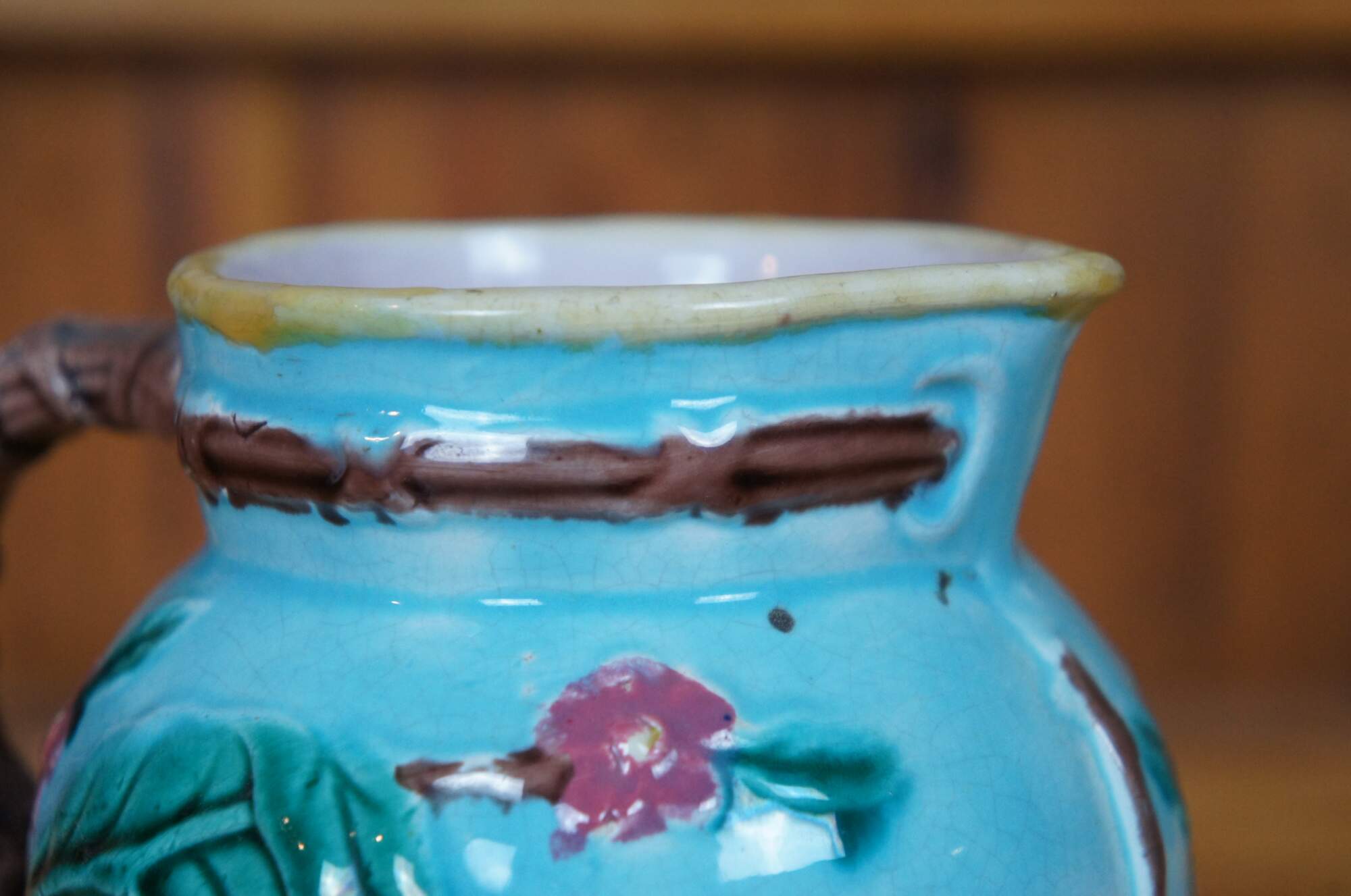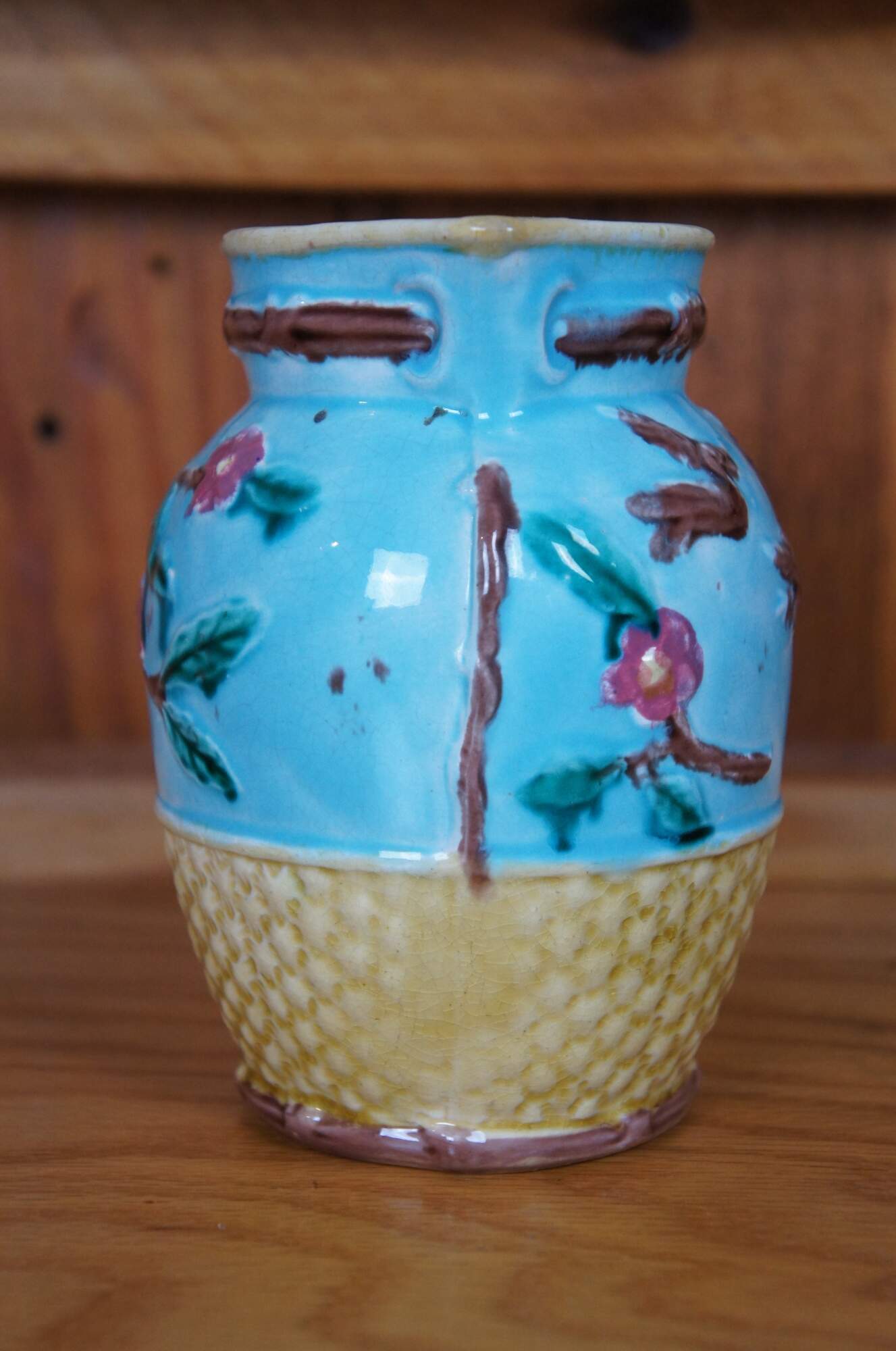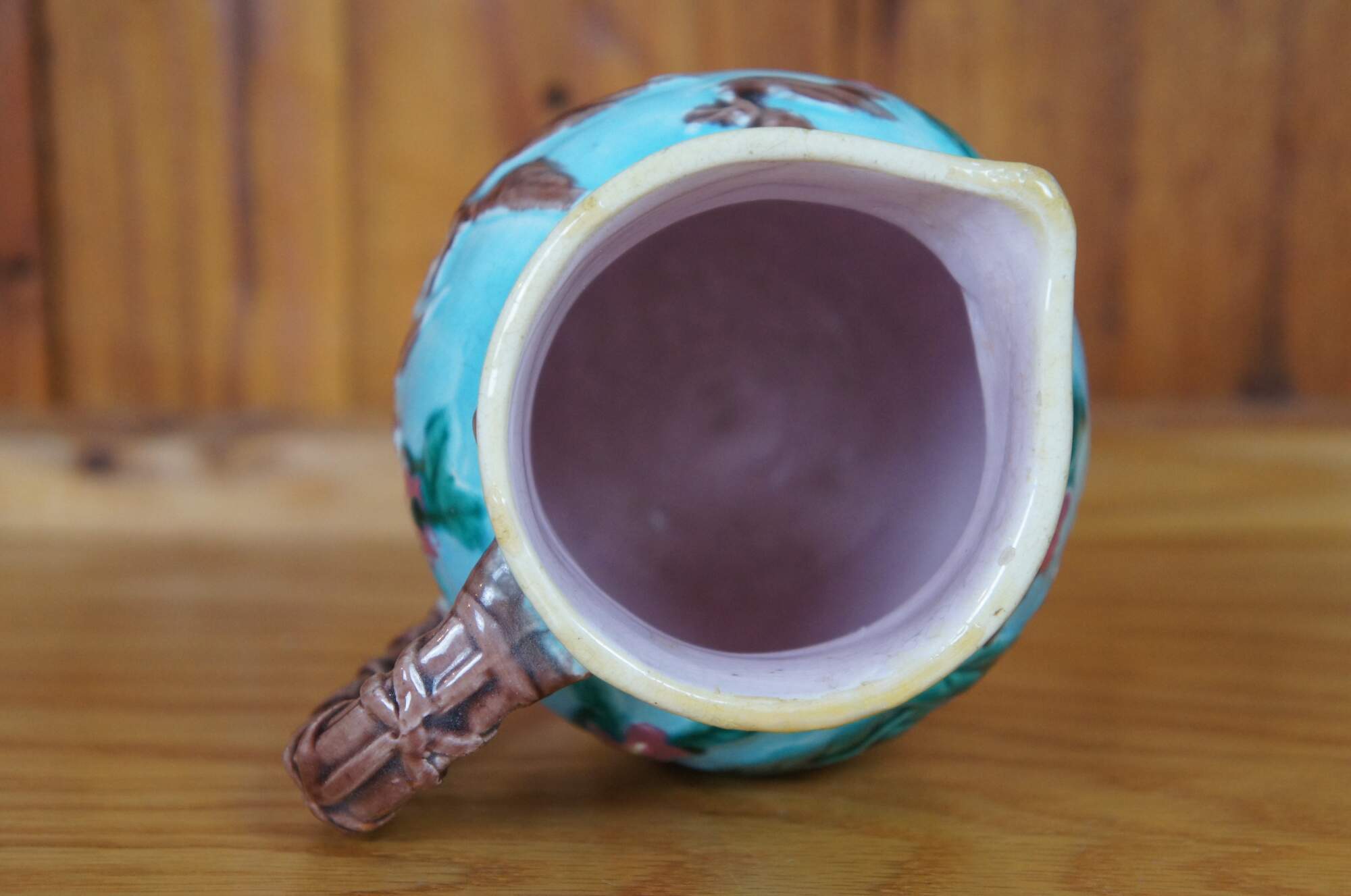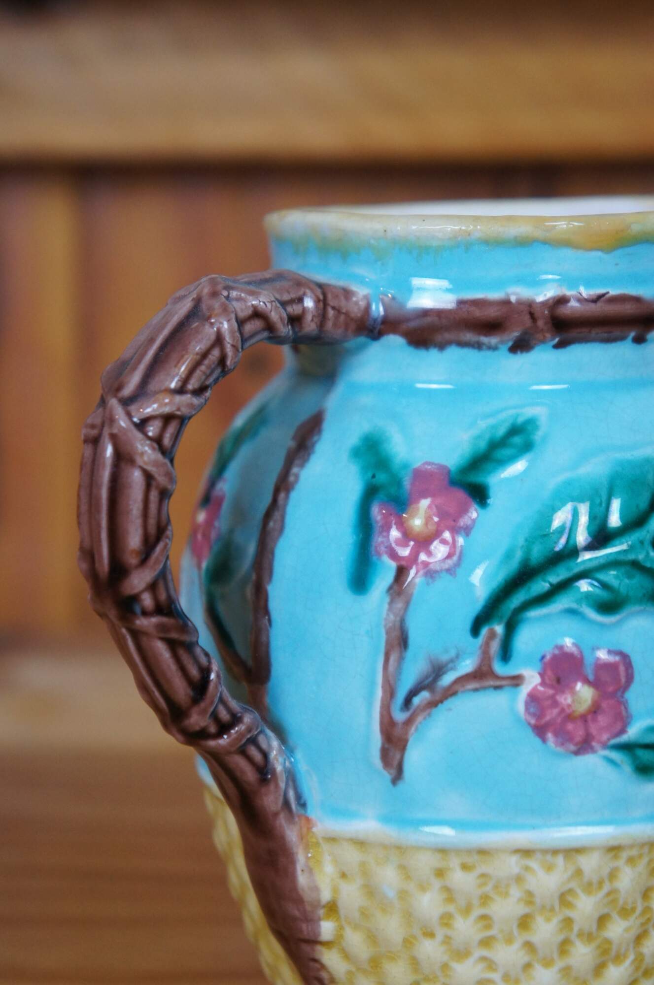 Antique Majolica creamer pitcher or jug featuring a basketweave motif with Cranes and Dogwood flowers against a turquoise sky. Attributed to Thomas Forester.