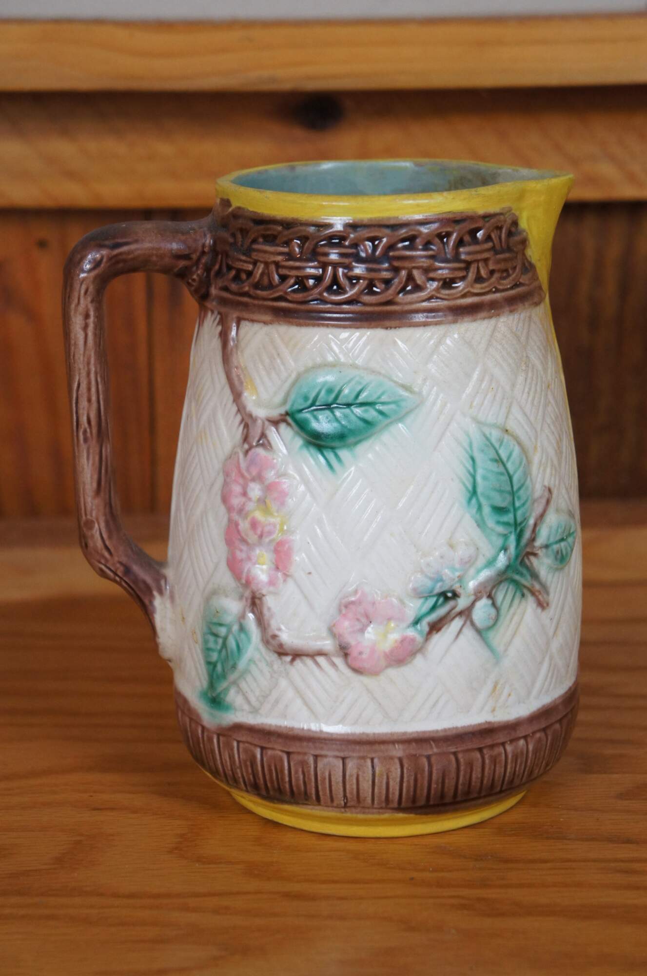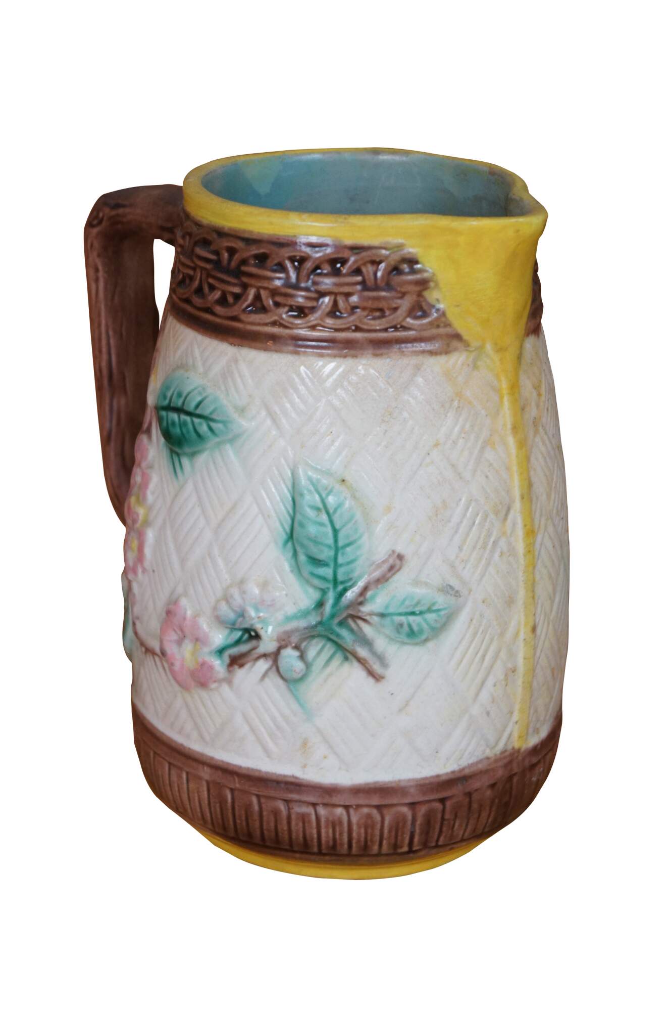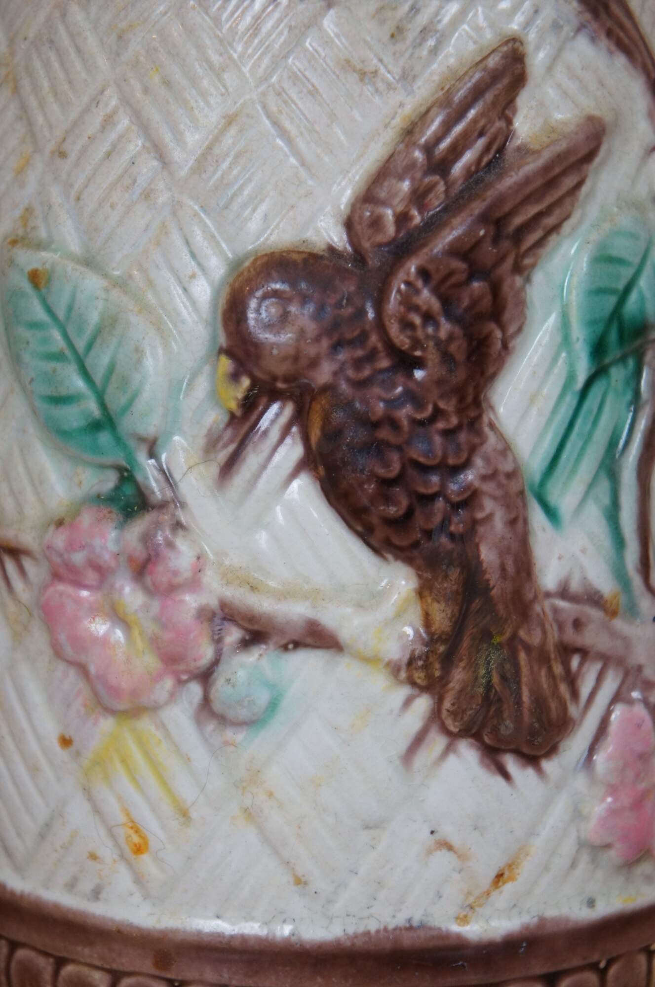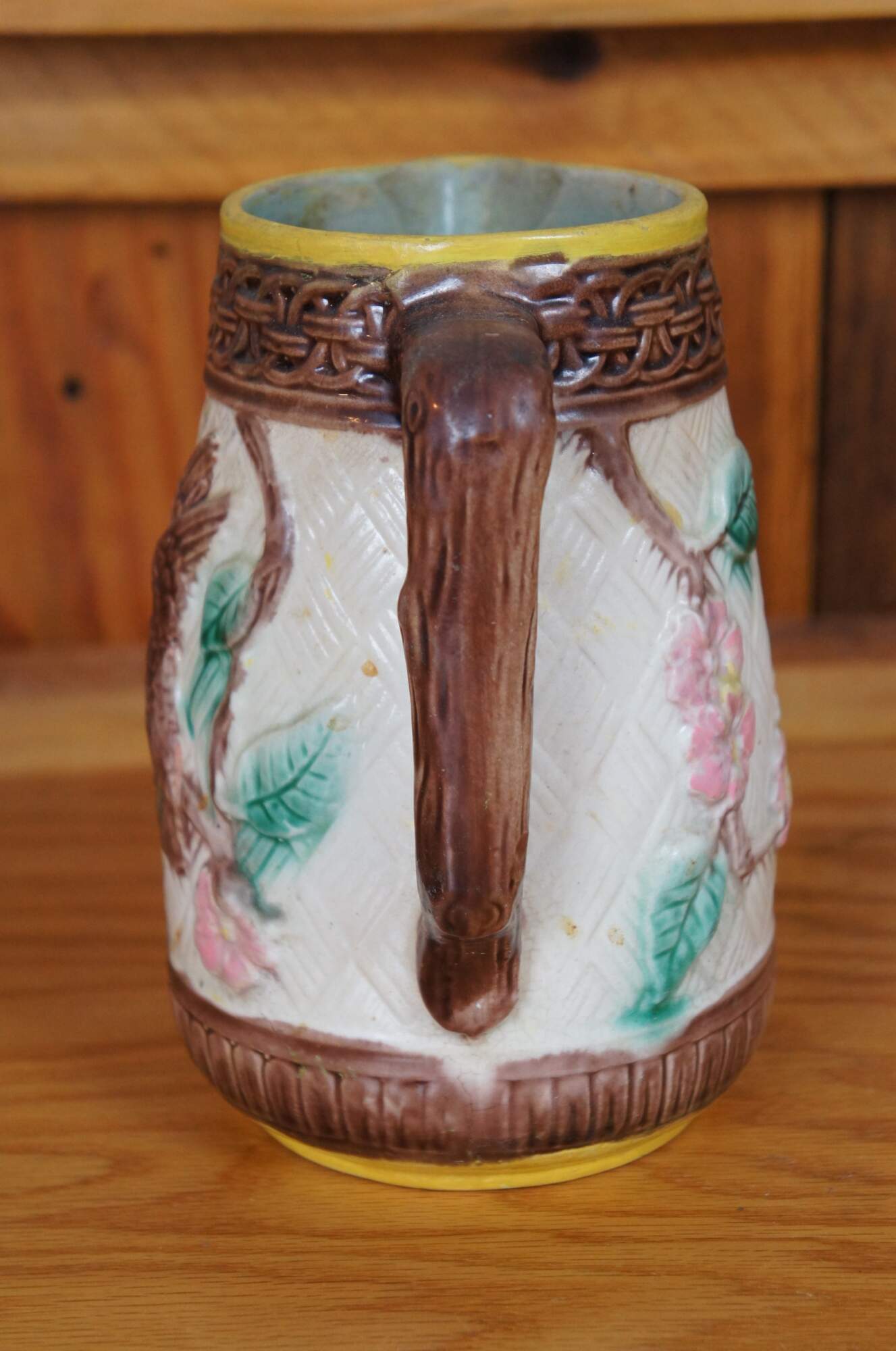 Antique Majolica bas relief parrot / bird / owl / hummingbird and dogwood flower creamer / syrup / honey pitcher or jug featuring a basketweave ground accented with interlocking circles and twig / branch handle.