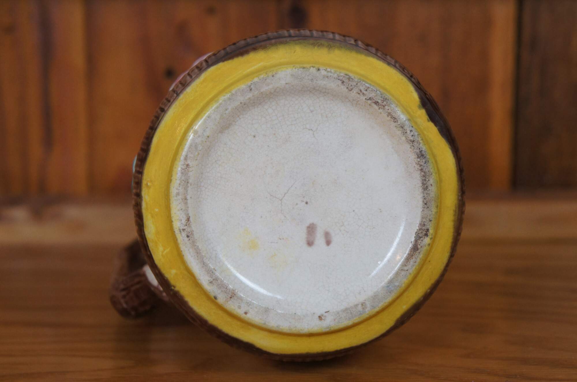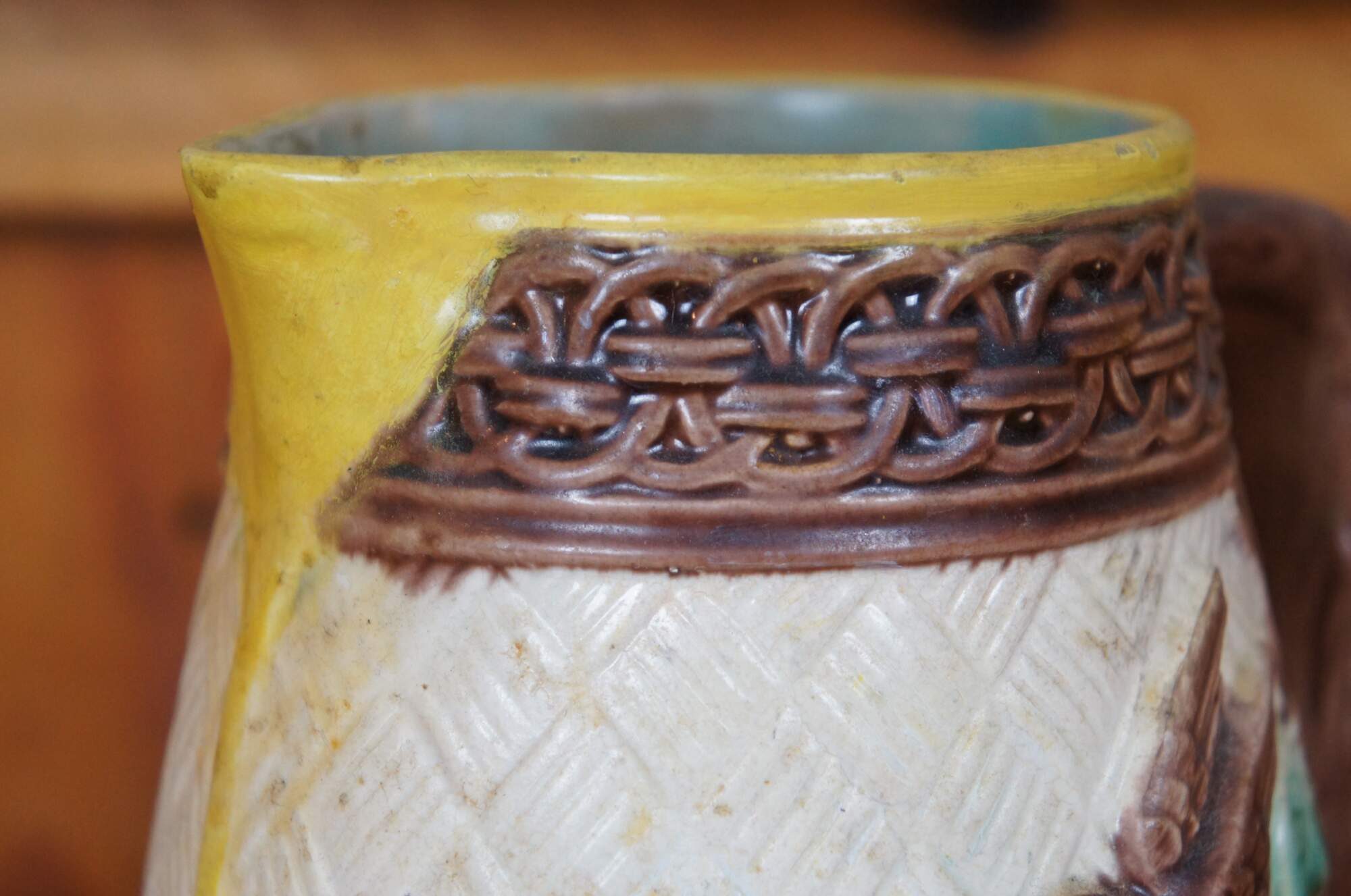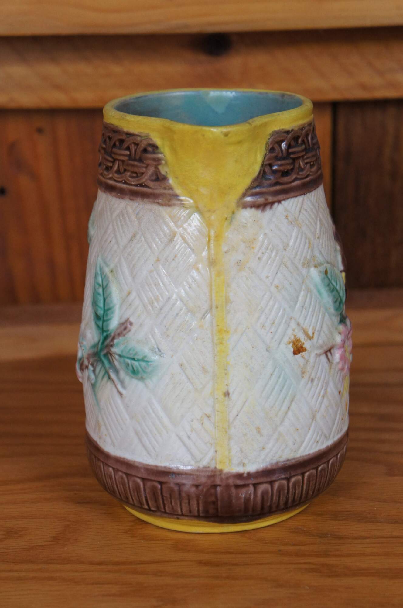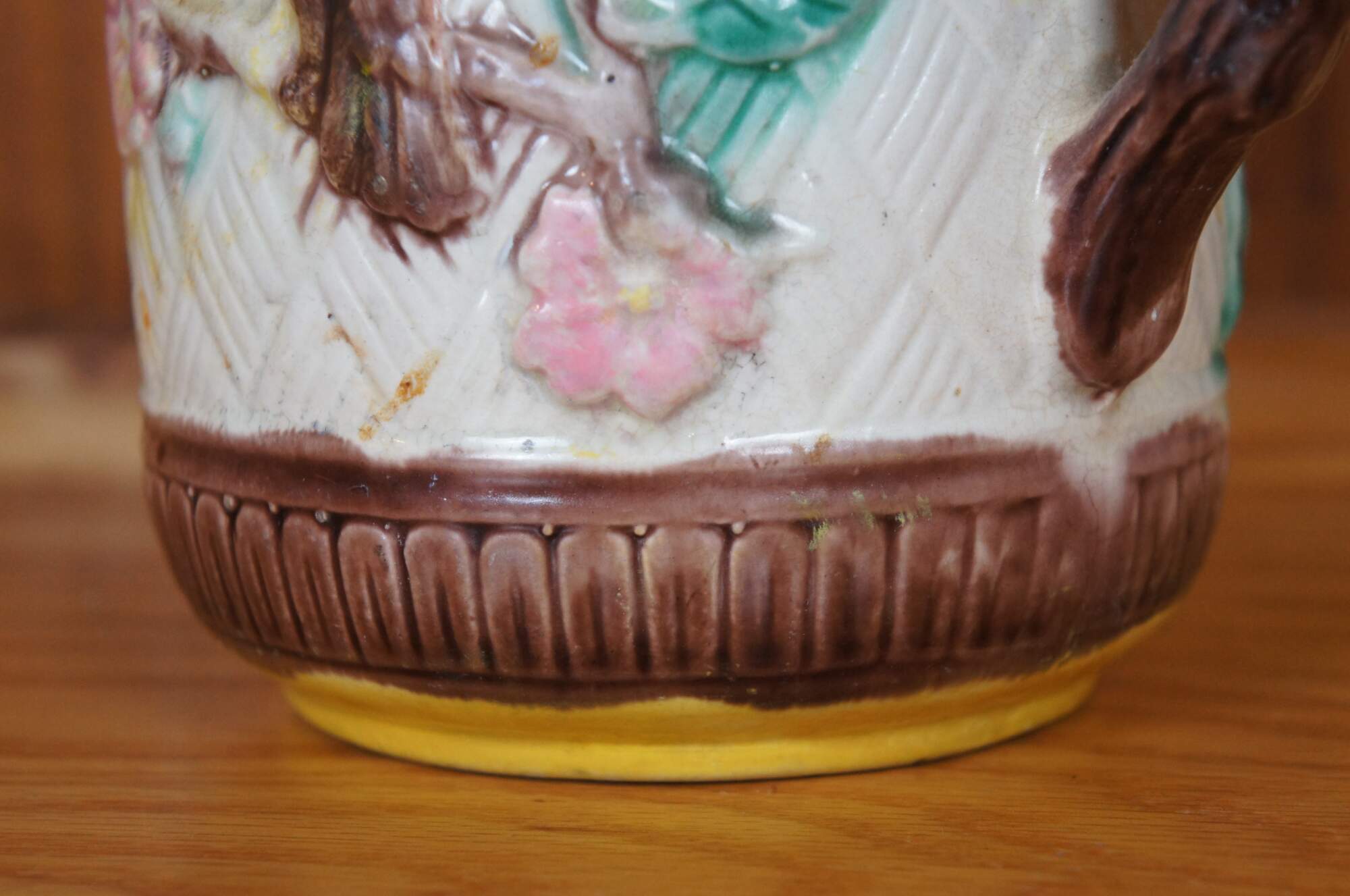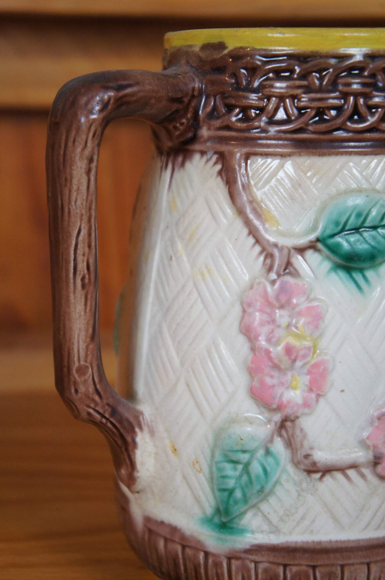Antique Majolica bas relief parrot / bird / owl / hummingbird and dogwood flower creamer / syrup / honey pitcher or jug featuring a basketweave ground accented with interlocking circles and twig / branch handle.