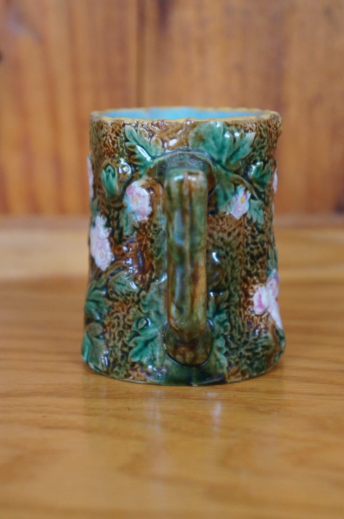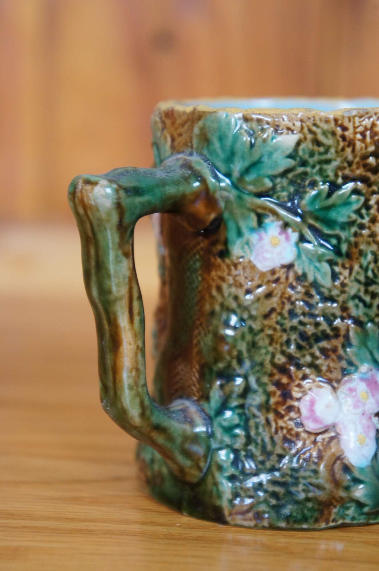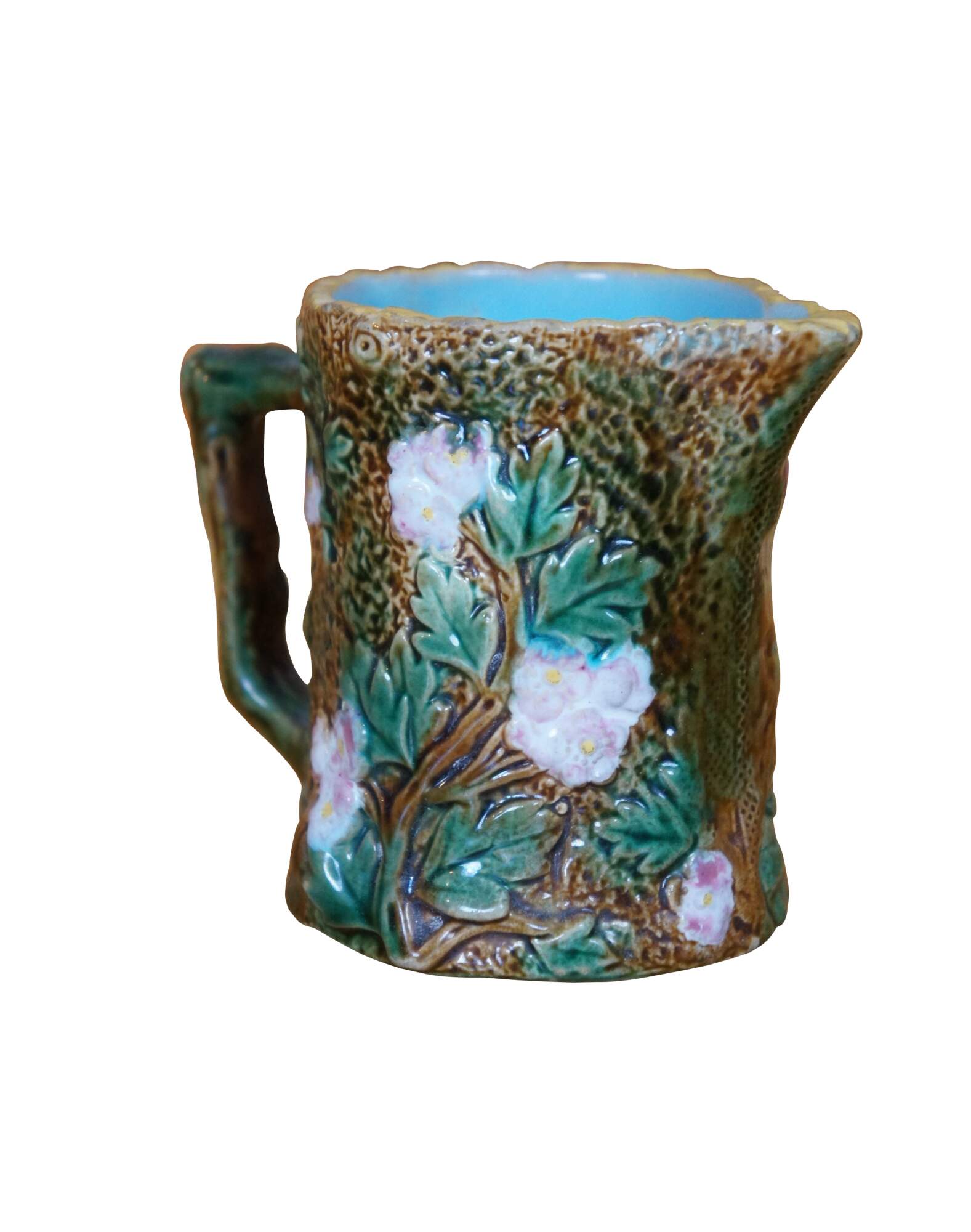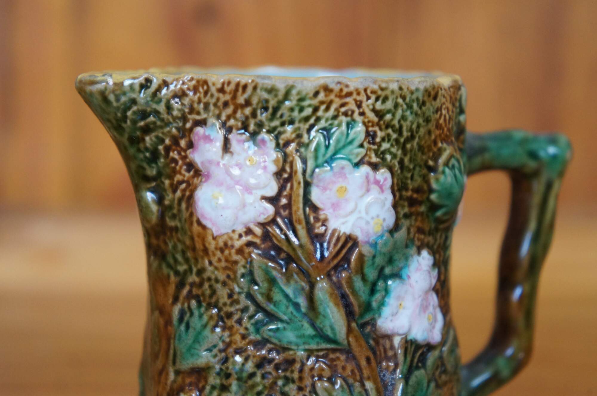 Antique Majolica George Jones creamer pitcher featuring a rustic tree / bark theme with mayflower / hawthorn tree / flower blossoms and branch handle. Marked 3368.