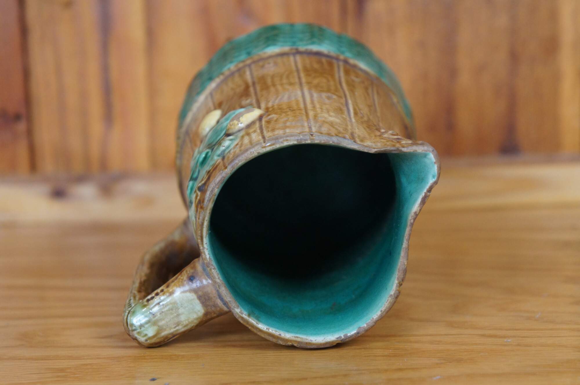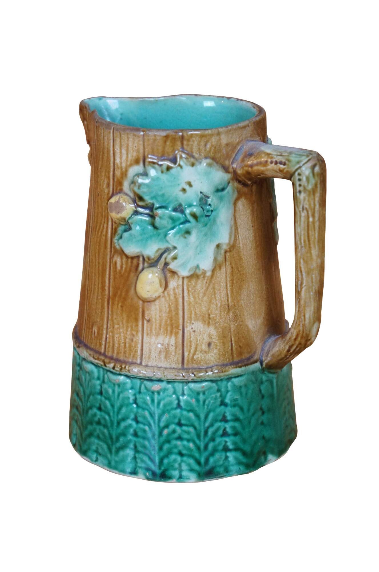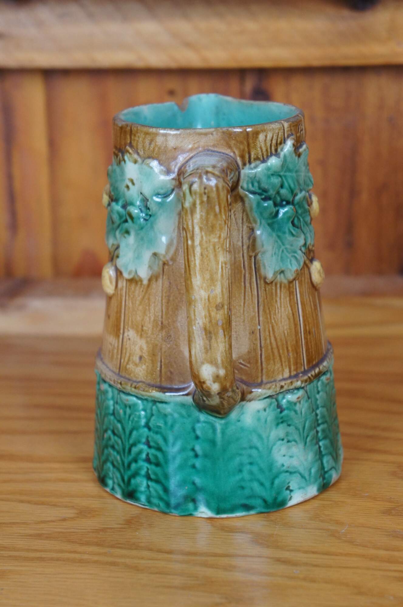 Antique Majolica creamer pitcher or jug featuring an acorn and oak leaf motif with rustic wood plank siding and acanthus leaves.