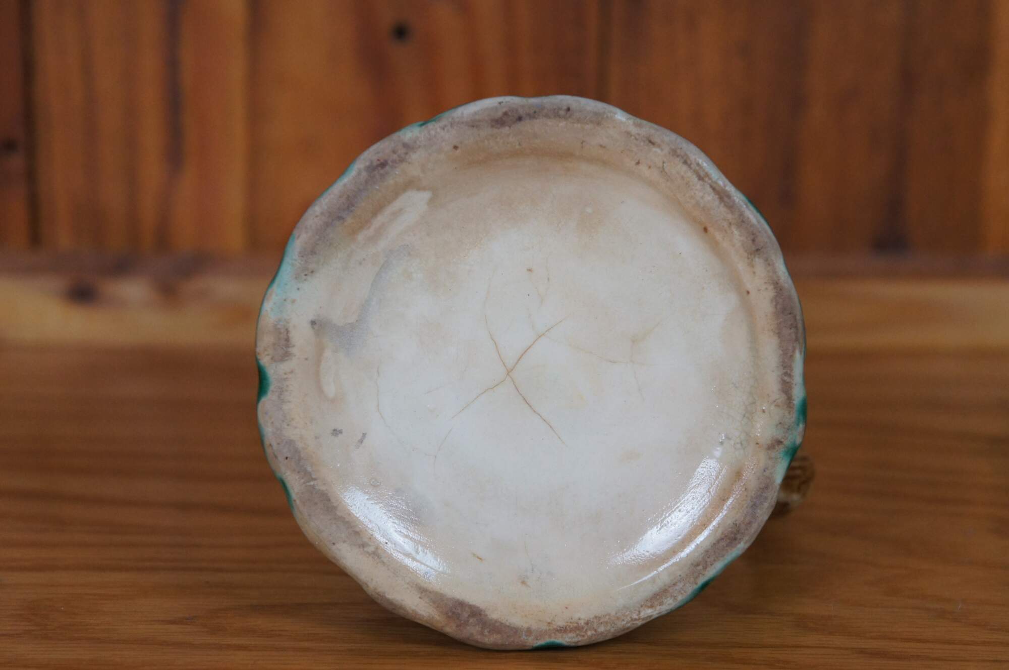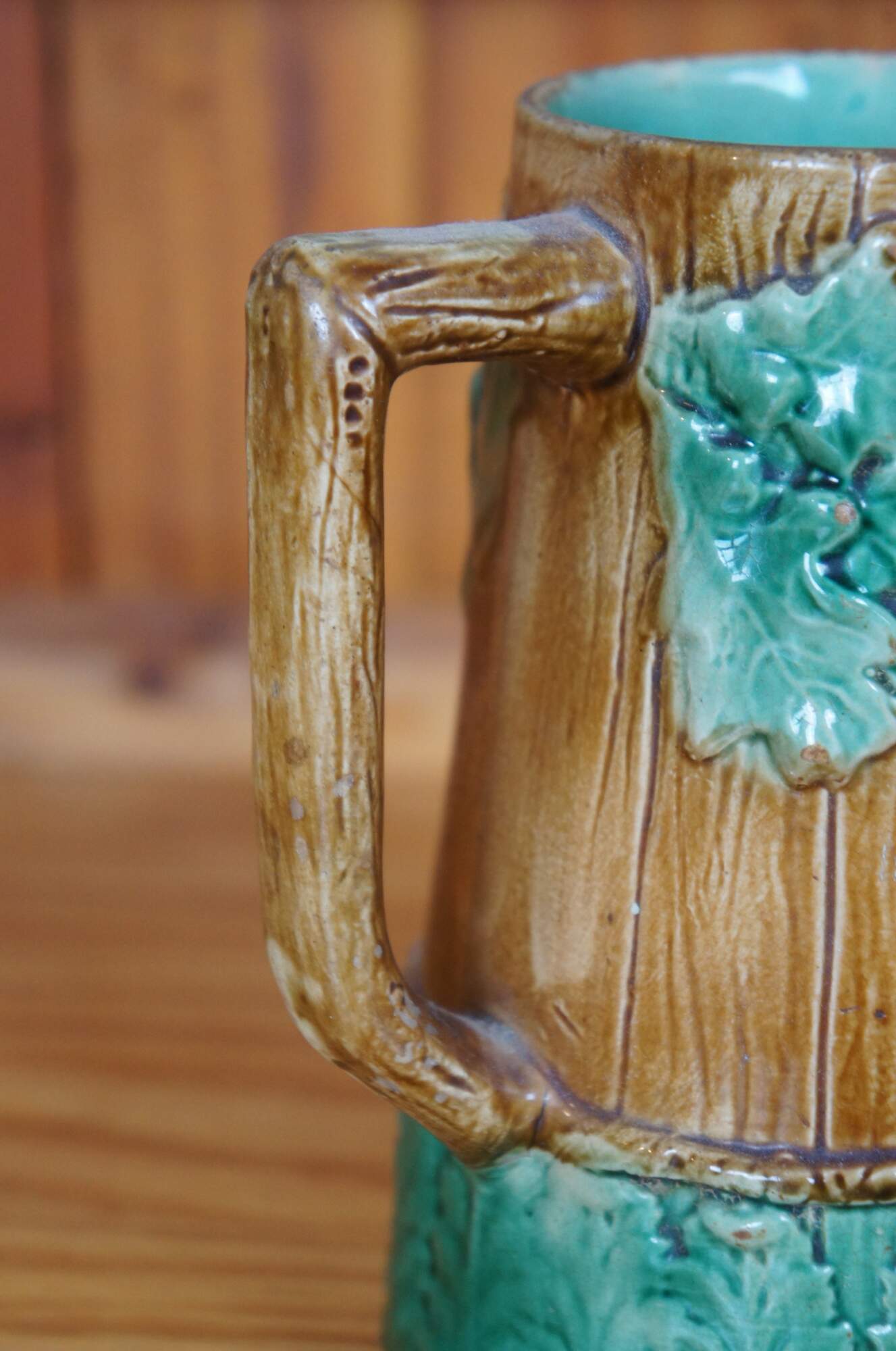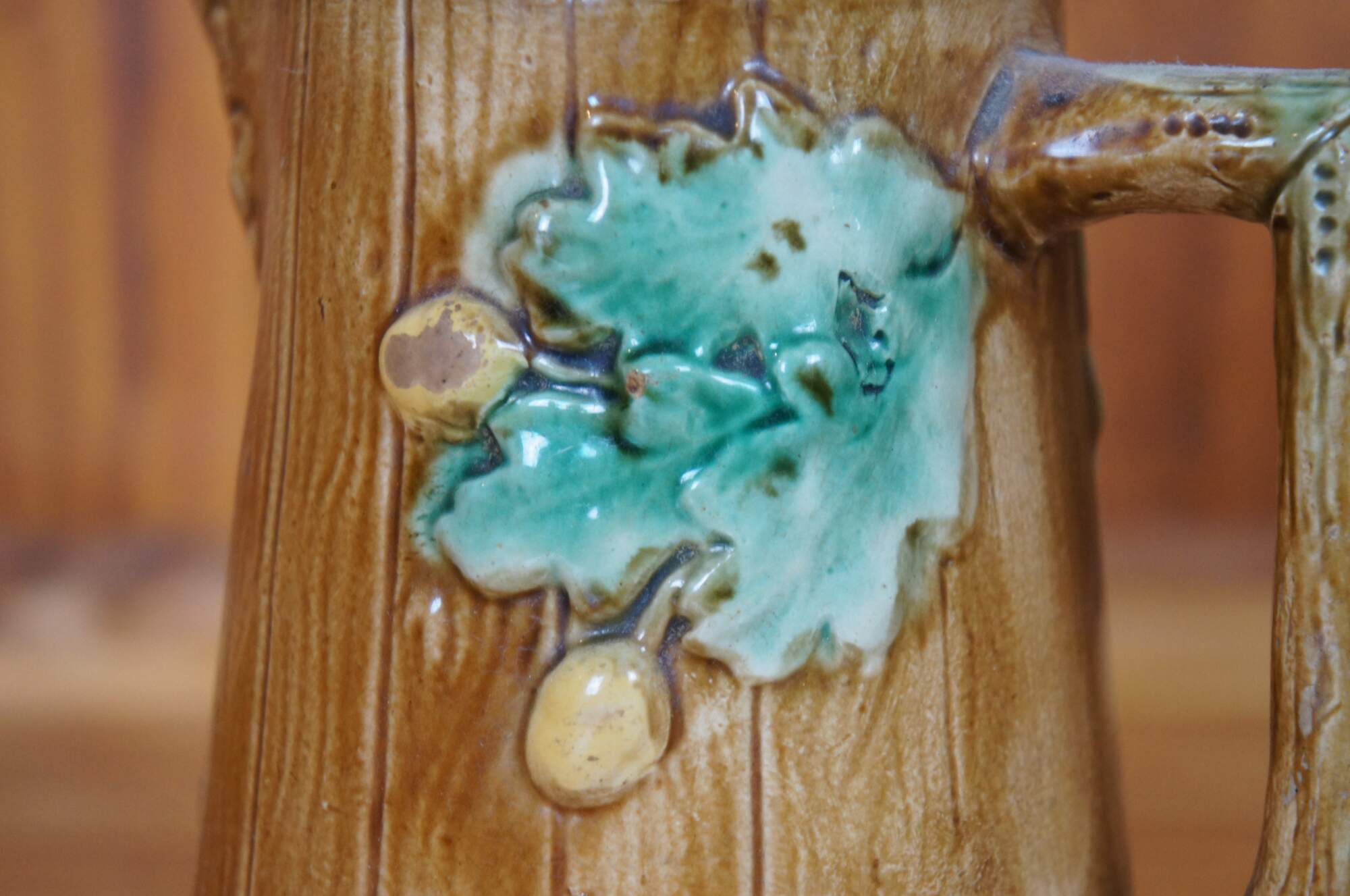Antique Majolica creamer pitcher or jug featuring an acorn and oak leaf motif with rustic wood plank siding and acanthus leaves.
