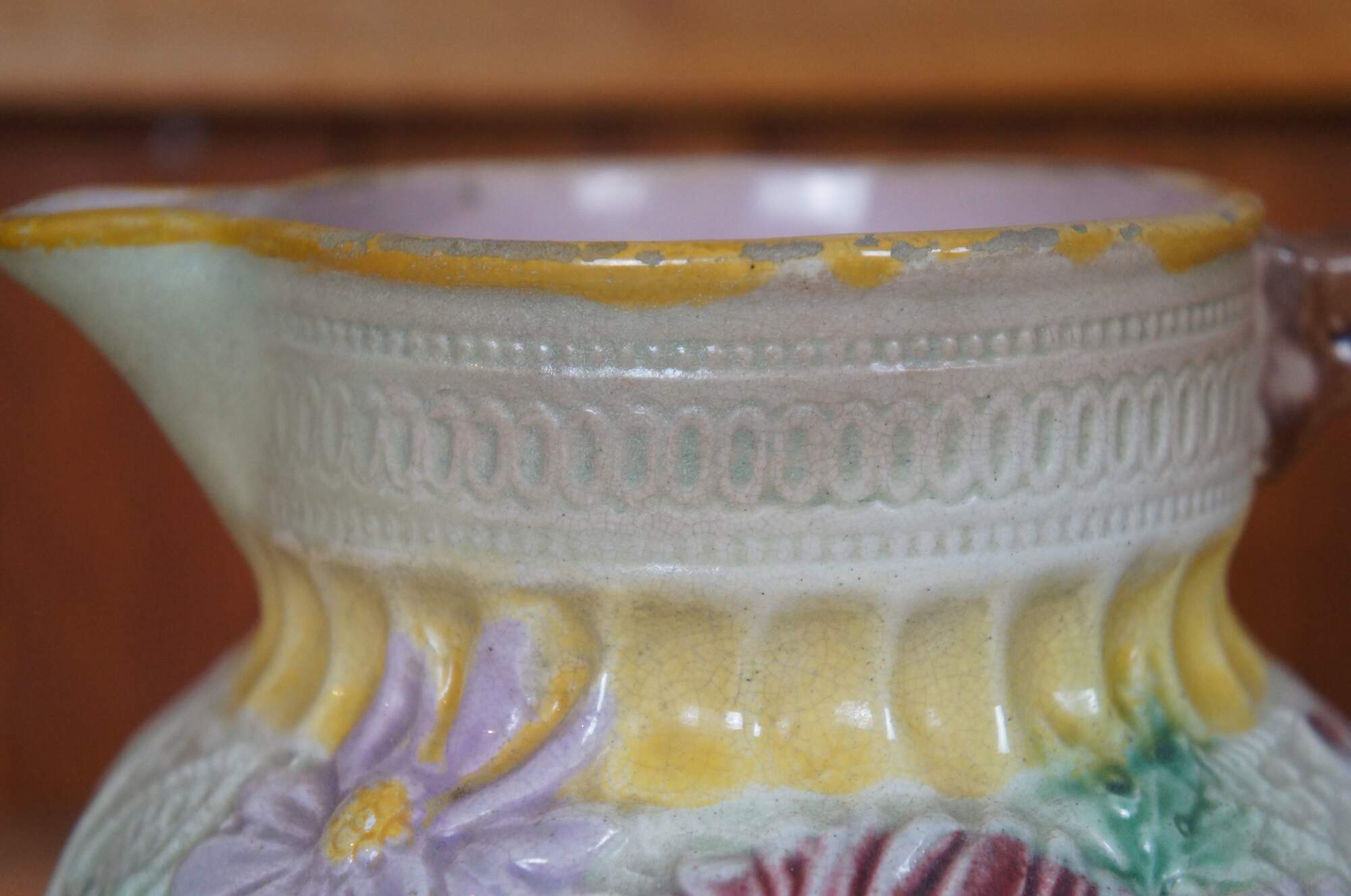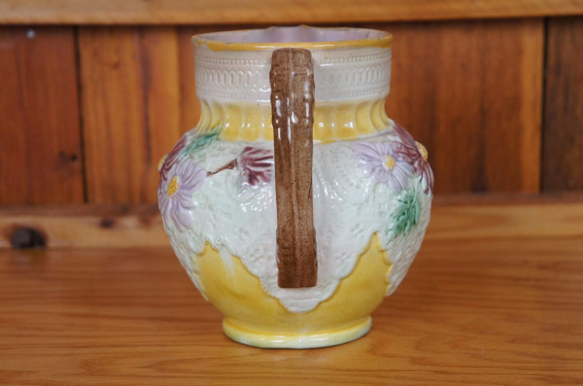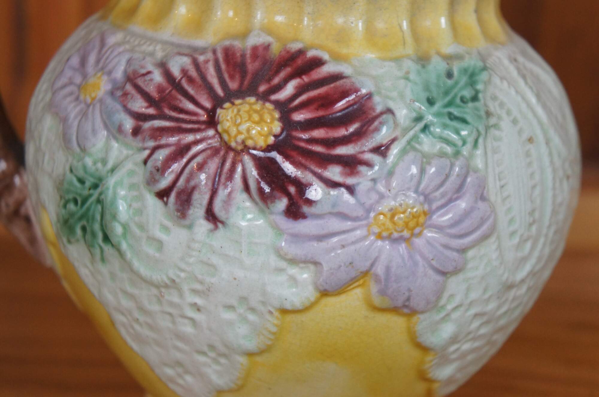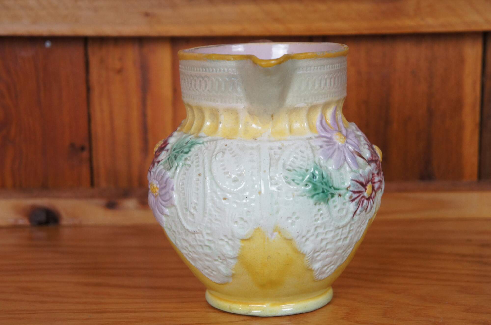 Antique Majolica pitcher / jug / carafe featuring a design of daisies and lace.