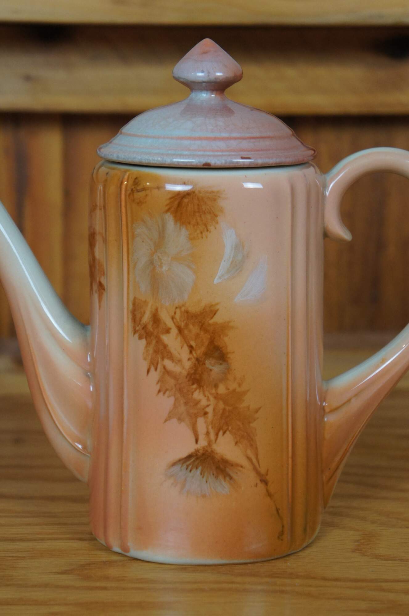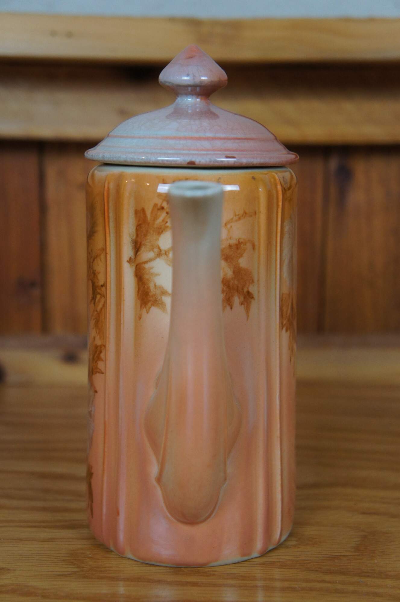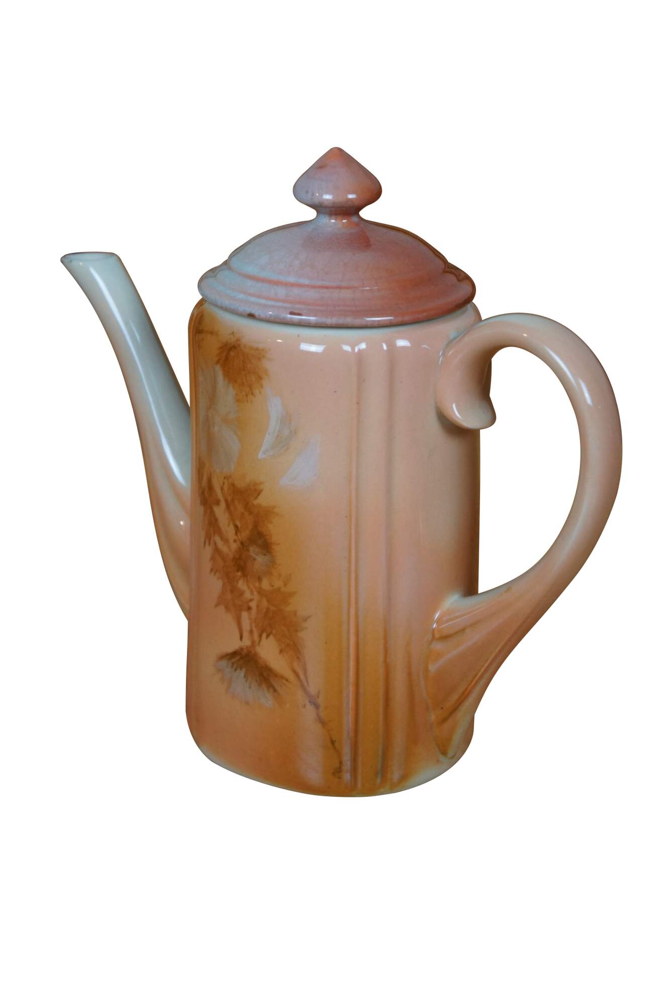Antique Rookwood lidded chocolate pot / teapot / coffee pitcher by Anna Marie Valentien. Features Art Nouveau styling with an Autumn toned floral theme. Signed AMV on base. W stands for white denoting Iris glaze was used. Marked circa 1890, Shape 552, Heisel Collection.