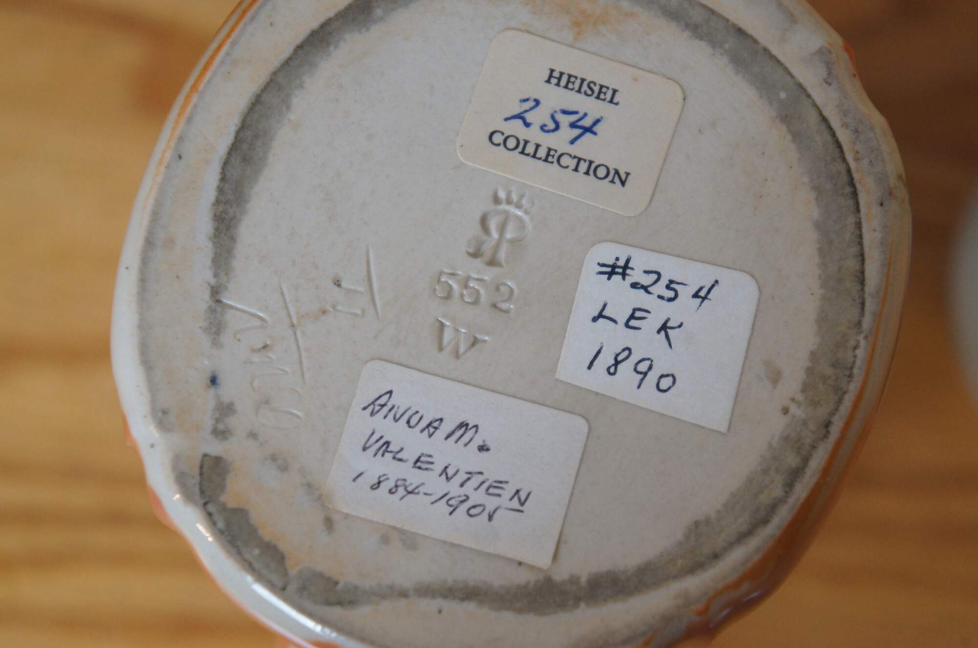 Anna Marie Bookprinter was born in Finneytown, near Cincinnati, Ohio on February 27, 1862. Annie, as she was known by her friends, began her career at Rookwood pottery in 1884. In the summer of 1887 she married Albert Valentien, after which she changed her name to Anna Valentien. Her early work shows the initials "AMB", but later works are marked "AMV". Her work was primarily in Limoges and Standard Glazes. She left the Rookwood Pottery in 1905. The Valentiens eventually left for California where they they continued producing artwork on the west coast. Anna died in San Diego, California in 1947. Collector interest in her pieces is considered to be average.