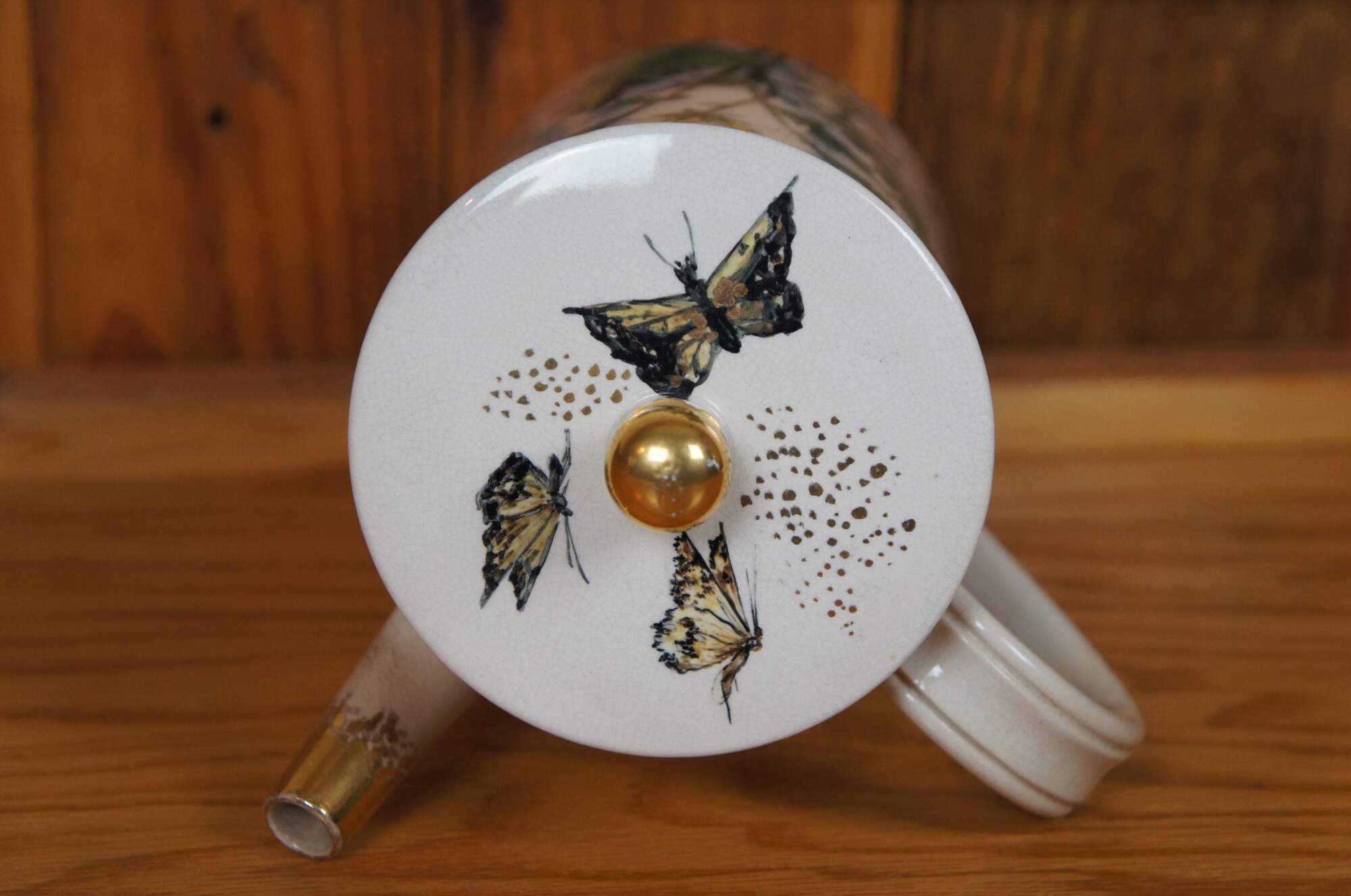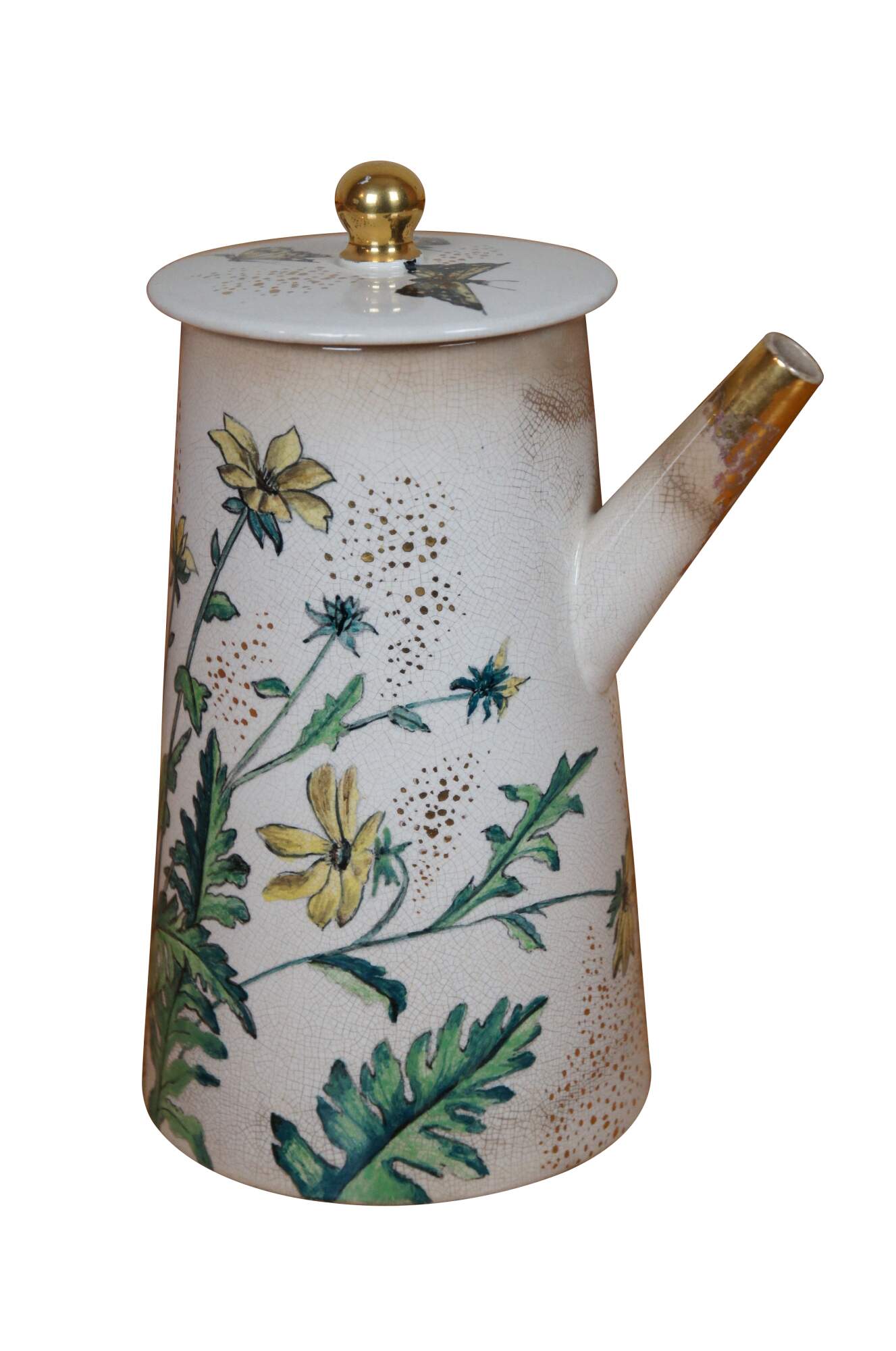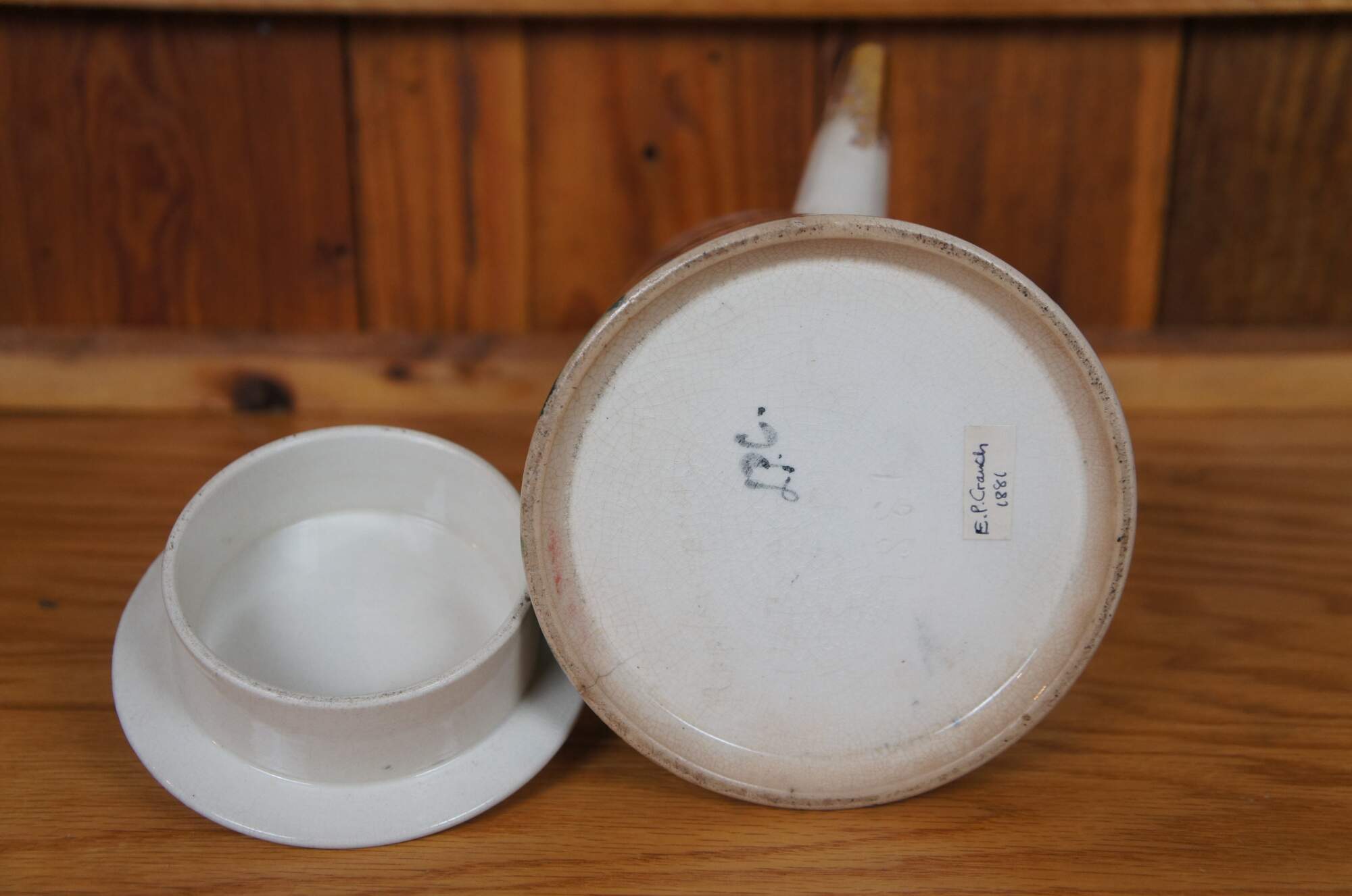 Rare antique early 1881 Rookwood chocolate pot / teapot / coffee pot or pitcher featuring a floral and butterfly motif with lid and handle. Accompanying paperwork attributes this pitcher to E.P. Cranch, however, the initials do appear to read LPG or LPC, with Cranch not noted to work for the company until 1882.